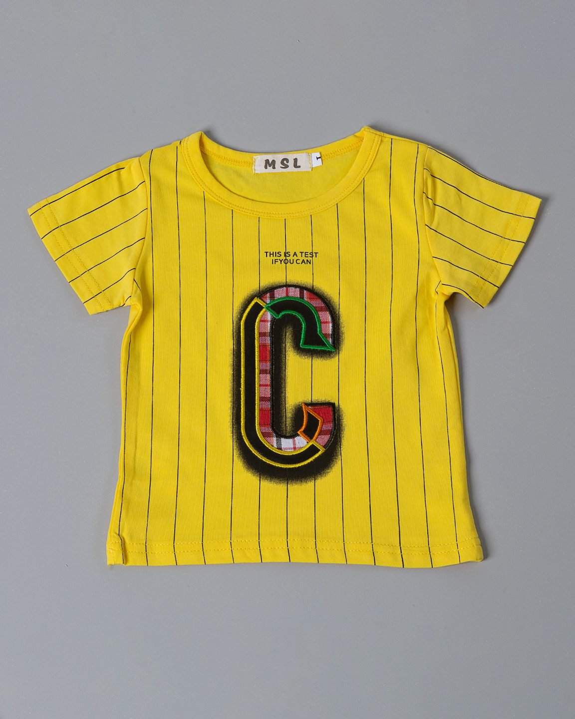 Boys leather applique T-shirt with stripe screen print detail , has binding round neck and short sleeves