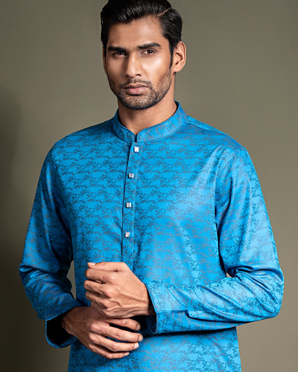 Cotton band collar regular fit woven panjabi from Zaviyar | Yale Blue