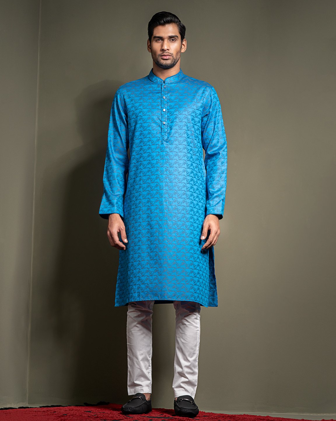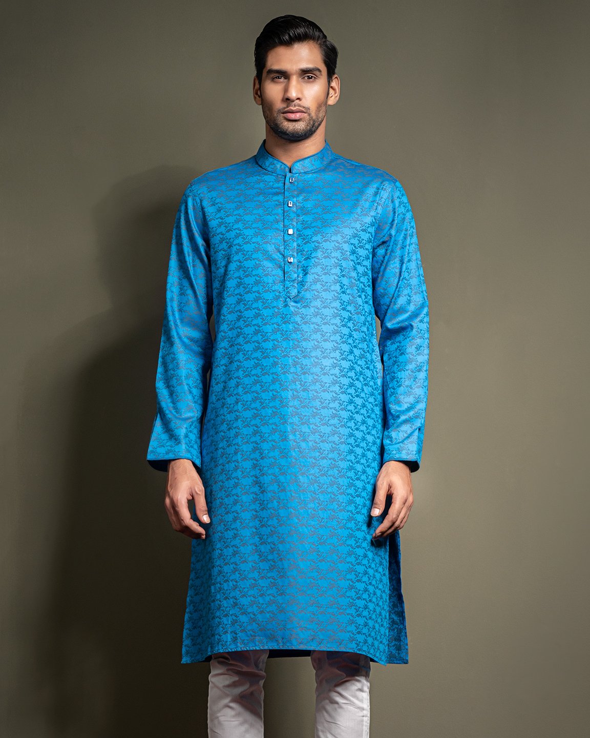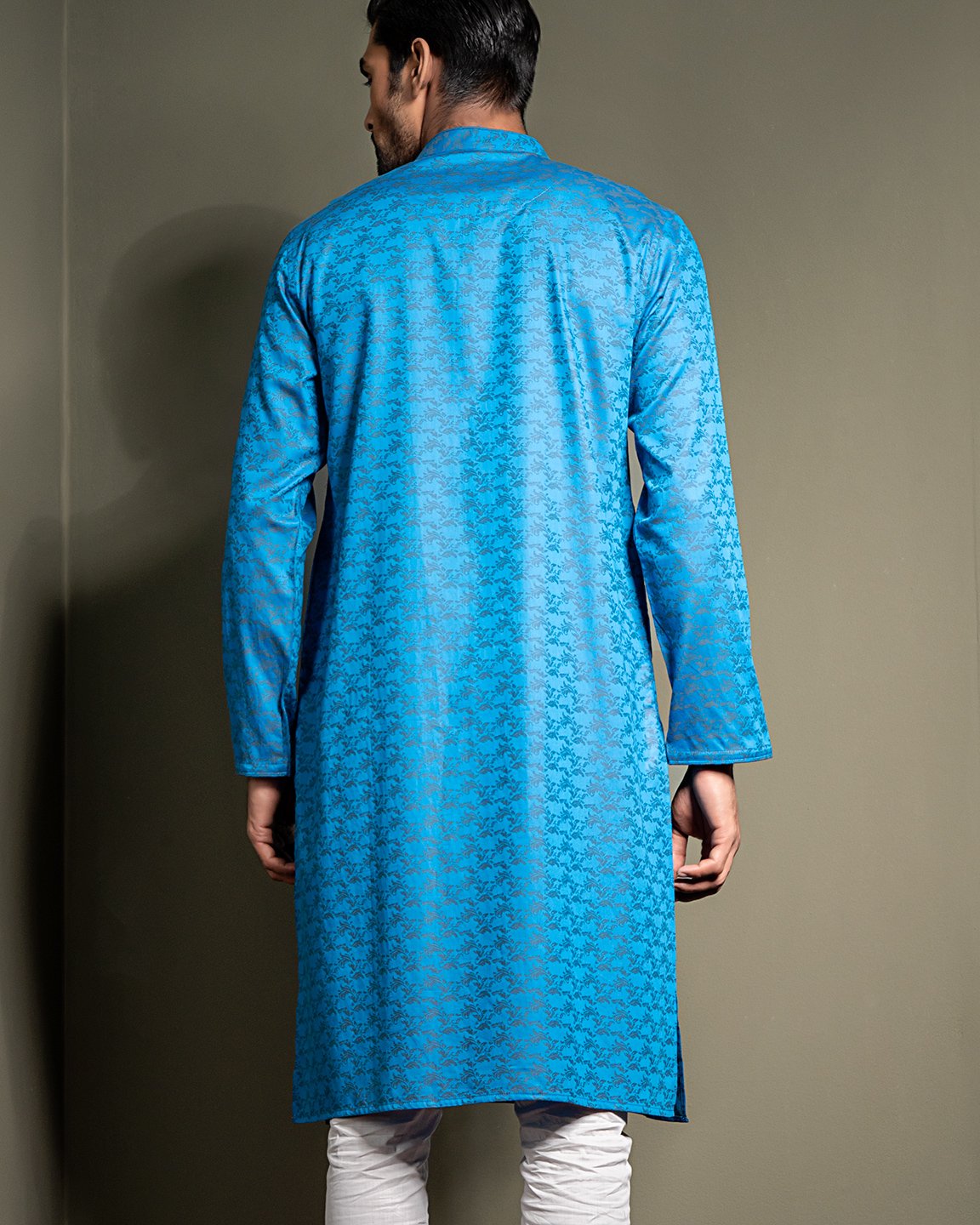Men’s Jacquard Cotton woven regular fit panjabi . Band Collar. Band contrast cord piping. Inner Placket contrast & sleeve hem contrast piping. Moon has cut & sew contrast. Full Sleeve. Straight hem.