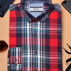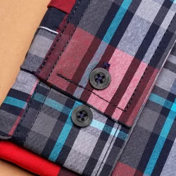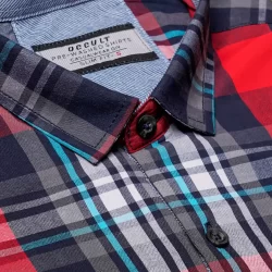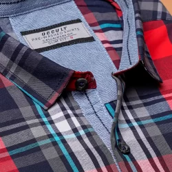 Shallow collar, slim fit Shirt, long Sleeve with contrast gumble , front opening french button hole placket, inside placket contrast design with decorative stitch, inside yoke cut and sew contrast & inside collar contrast with decorative stitch, back yoke streaght, curve hem.