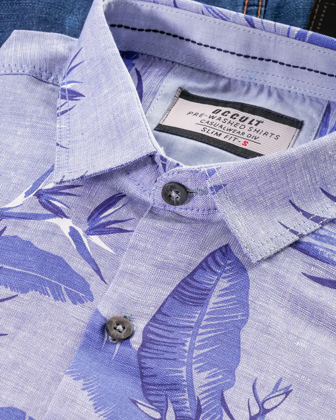 Shallow collar, slim fit Shirt, long Sleeve with contrast grumble , front opening French button hole placket with contrast, collar inside contrast with decorative stitch, inside yoke cut and sew patch with contrast, back yoke straight, curve hem.