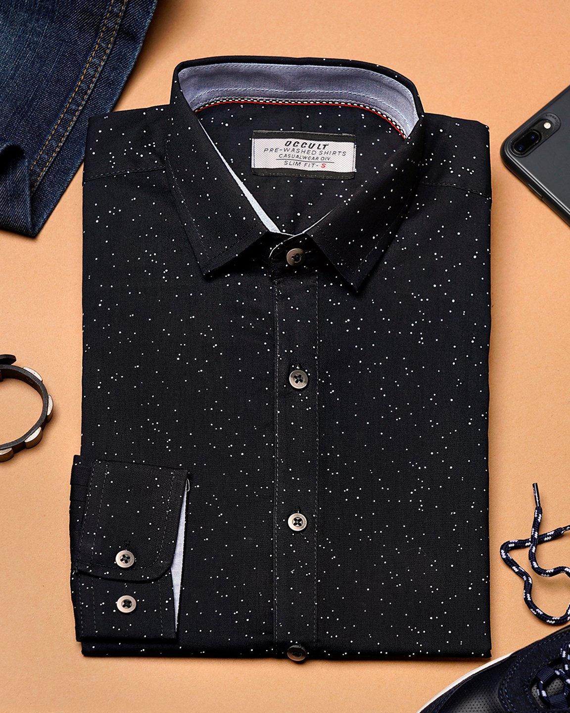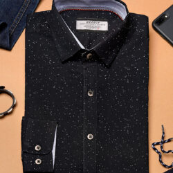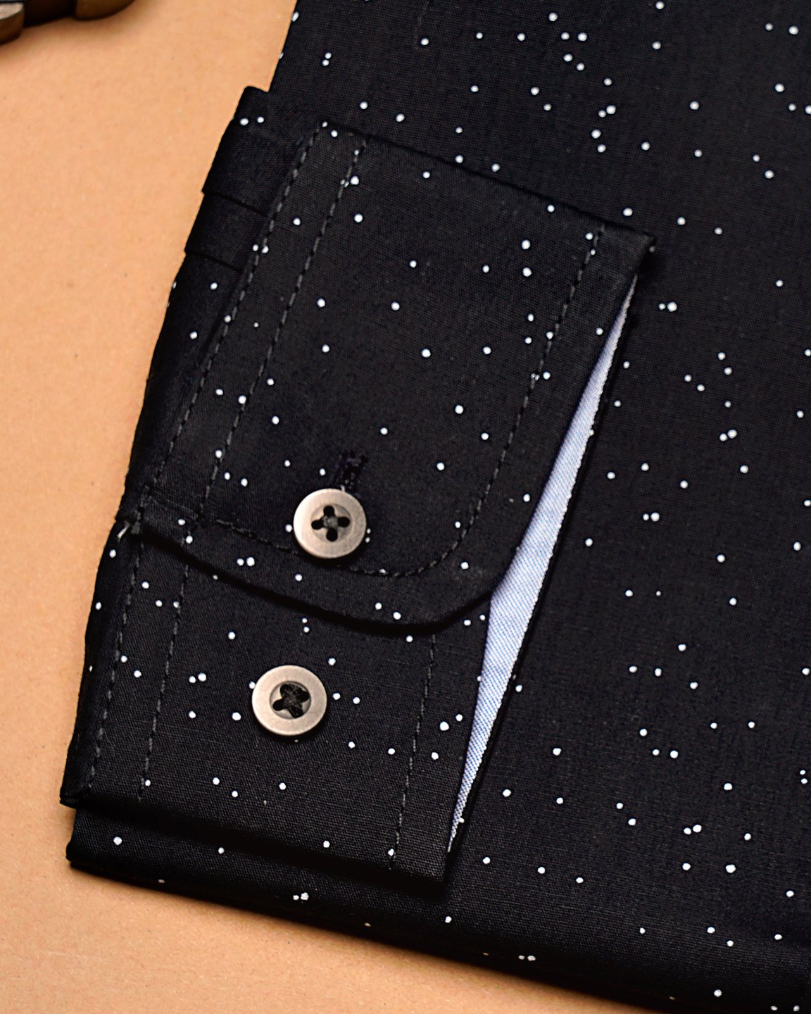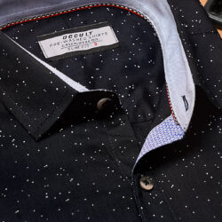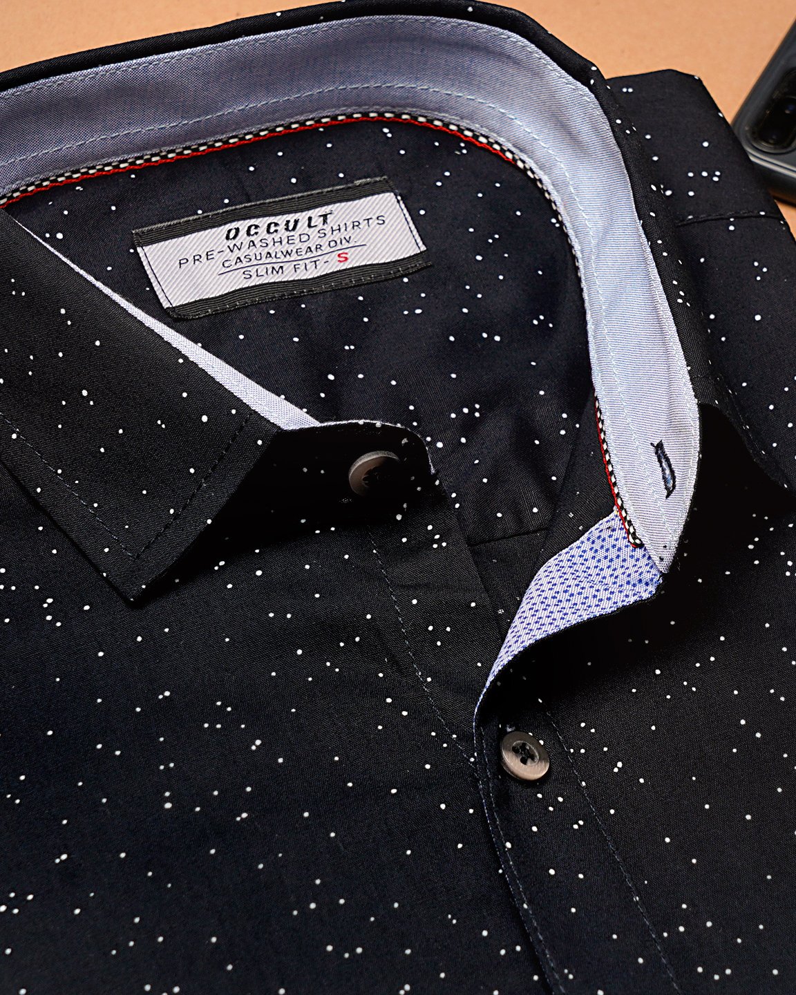 Shallow collar, slim fit Shirt, long Sleeve with inside contrast cuff , front opening button hole placket inside contrast, Collar band inside contrast with twill tape, back yoke streaght, curve hem.