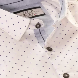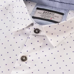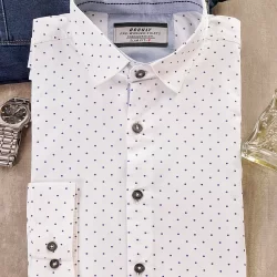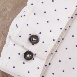 Shallow collar, slim fit Shirt, long Sleeve with contrast grumble , front opening French button hole placket with contrast, collar inside contrast with decorative stitch, inside yoke cut and sew patch with contrast, back yoke straight, curve hem.