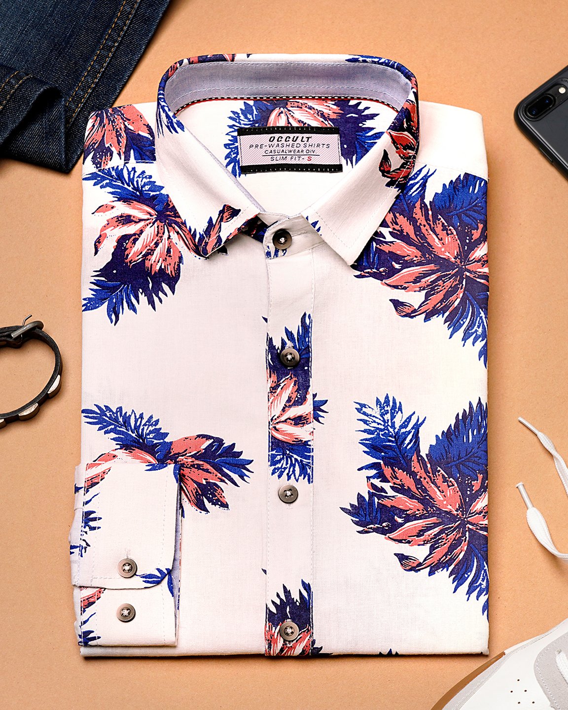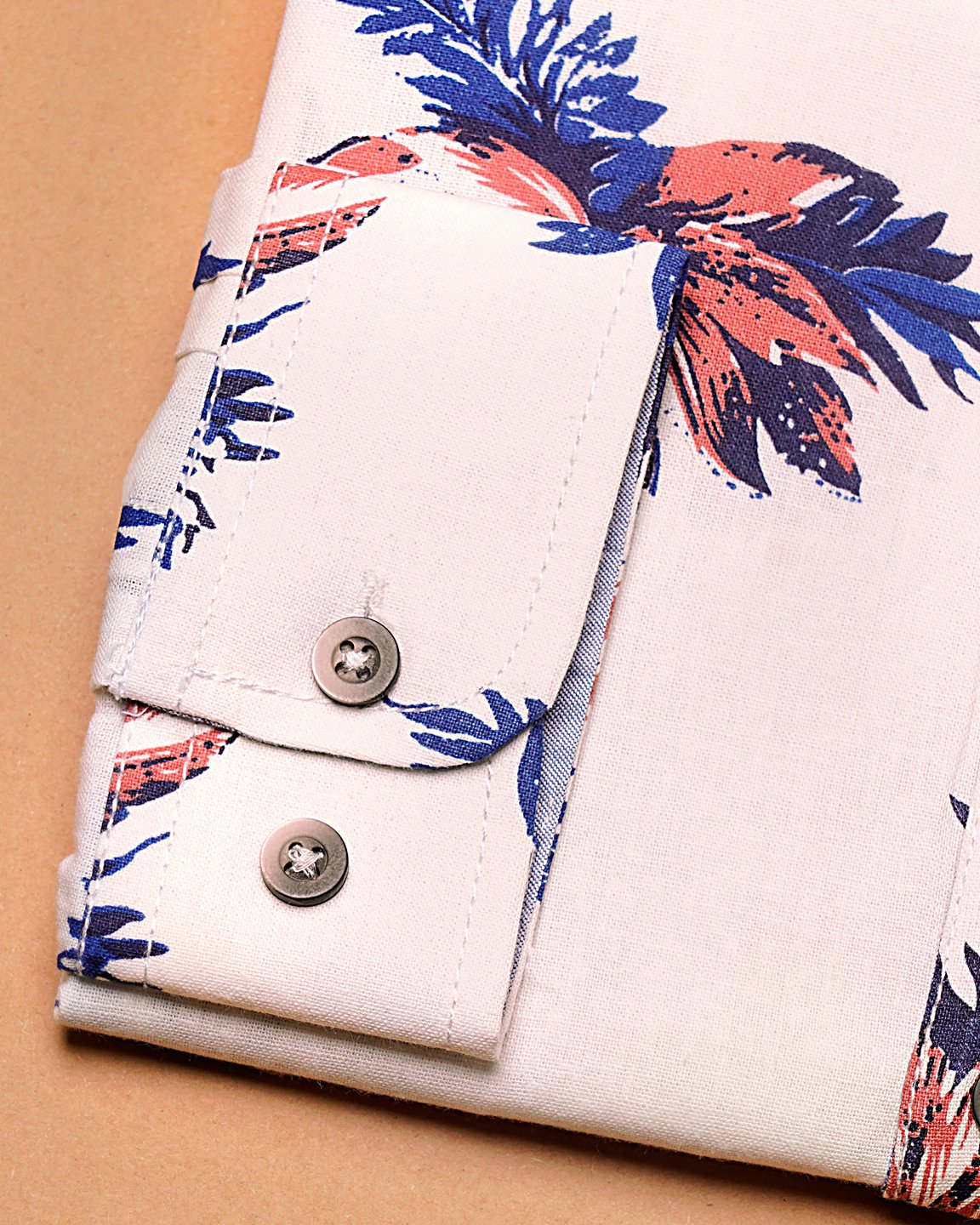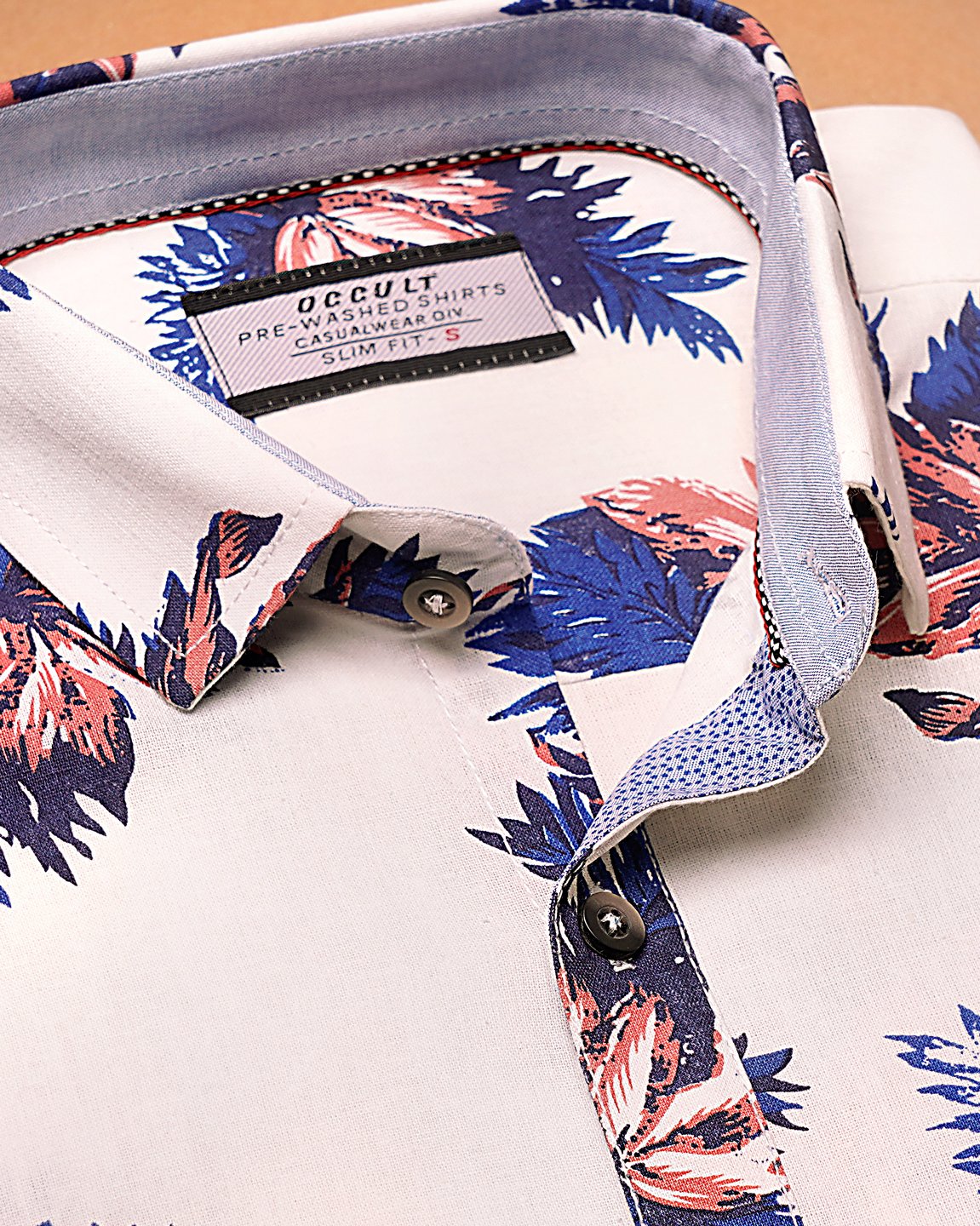 Shallow collar, slim fit Shirt, long Sleeve with inside contrast cuff , front opening button hole placket inside contrast, Collar band inside contrast with twill tape, back yoke streaght, curve hem.