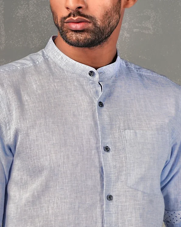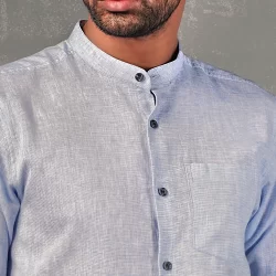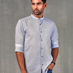 Shallow collar, slim fit Shirt, long Sleeve with twill tape gumble, front opening french button hole placket, inside yoke cut and sew patch with twill tape, back yoke streaght, curve hem.