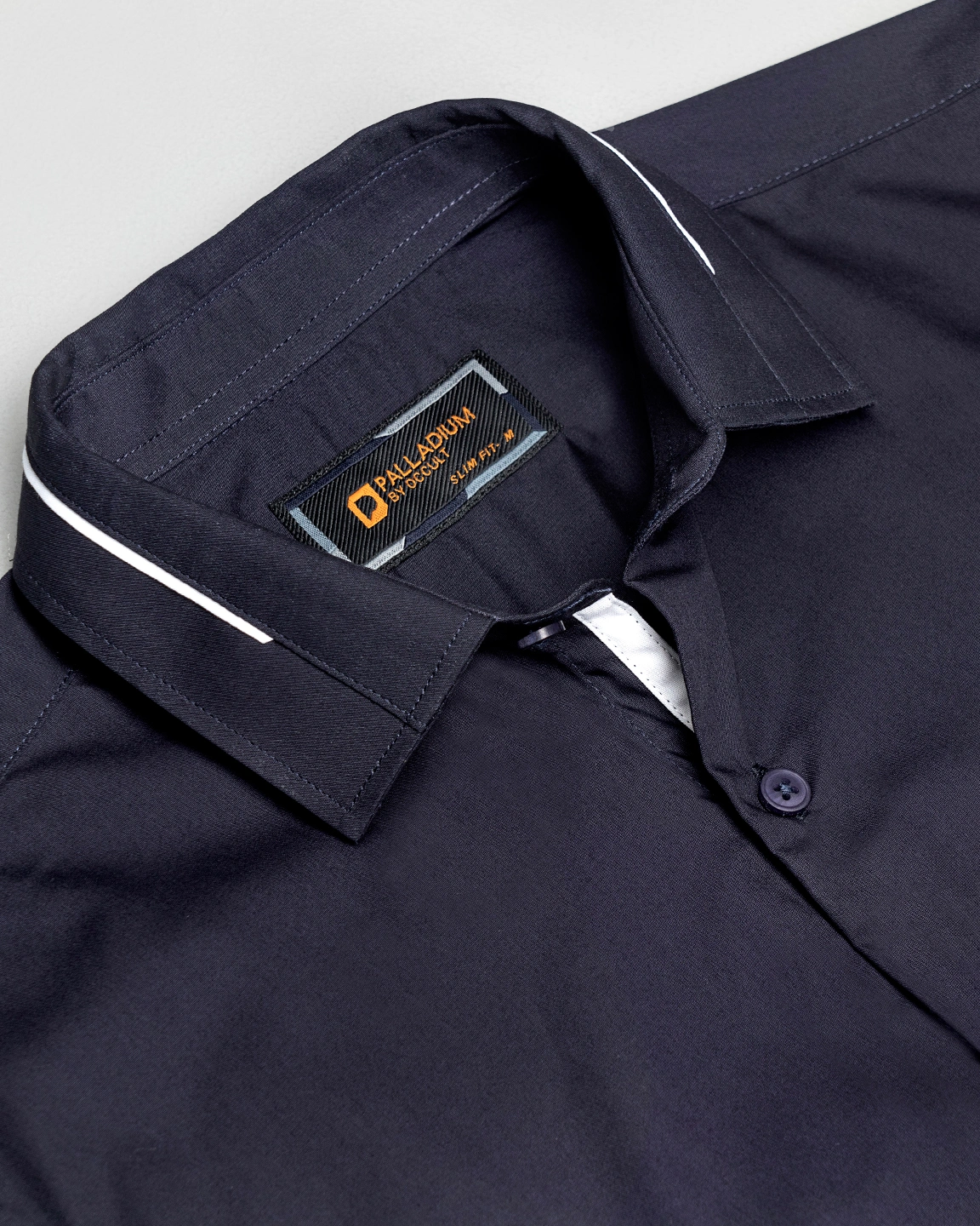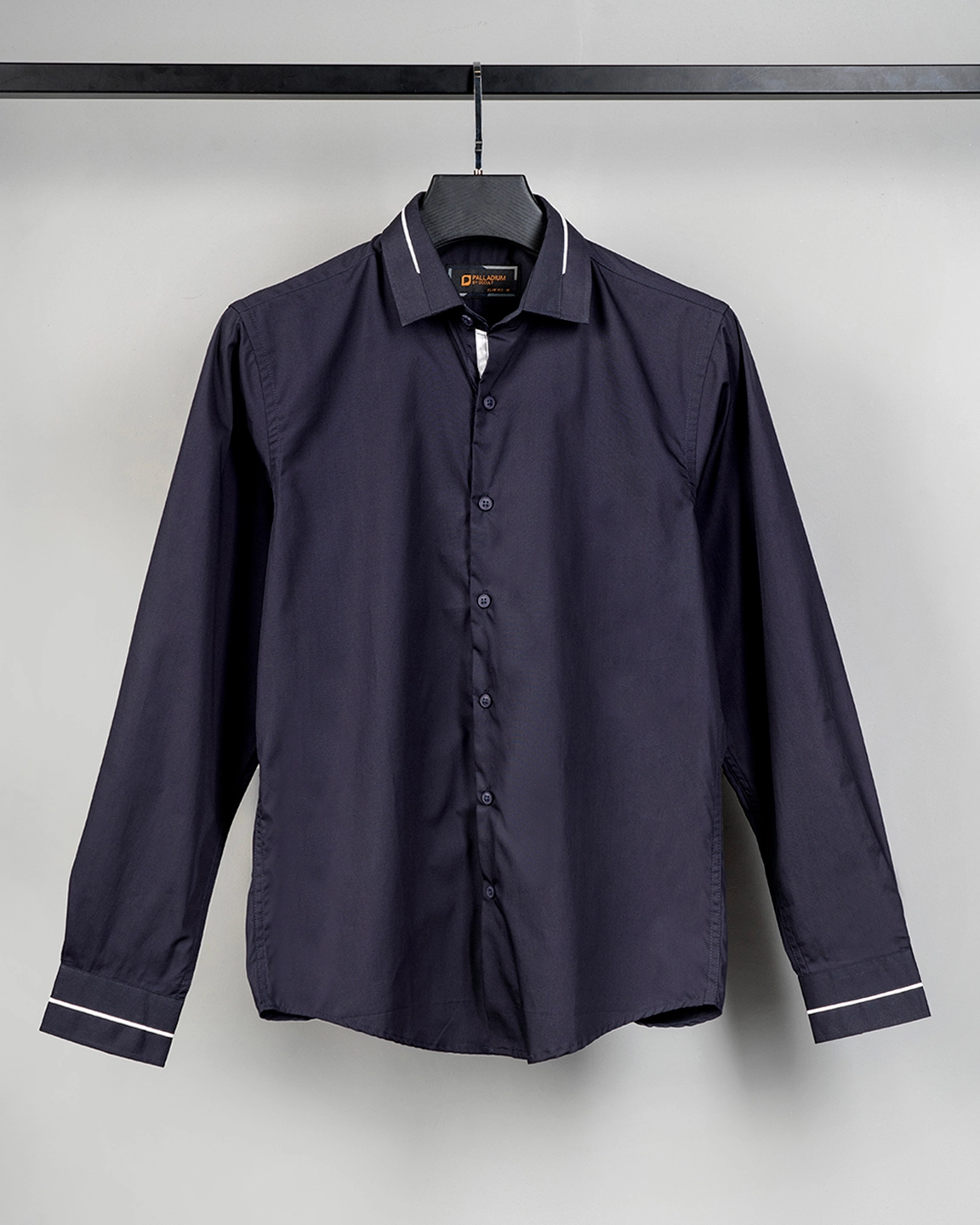 Product Description: Shallow collar, slim fit Shirt. Collar and cuff has contrast piping, long sleeves with gumble, Inner placket twill tape details, back yoke straight and curve hem.