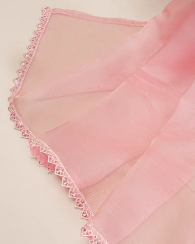 Product Details : Chiffon fine georgette short kameez in round neck with lace work, placket with karchupi work details, has full sleeve and sleeve hemline has lace with details.