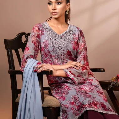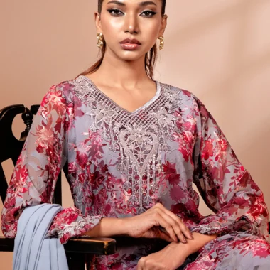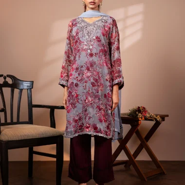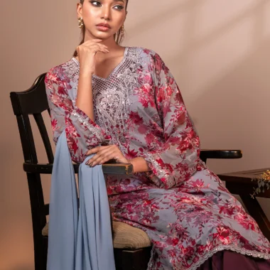 Romantic and refined, this lilac floral chiffon long kameez features intricate thread and sequin embroidery at the neckline, with soft printed textures and scalloped edging that completes your festive look.