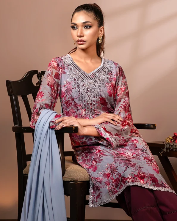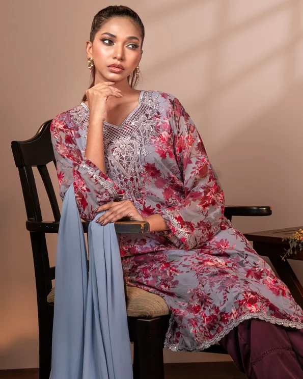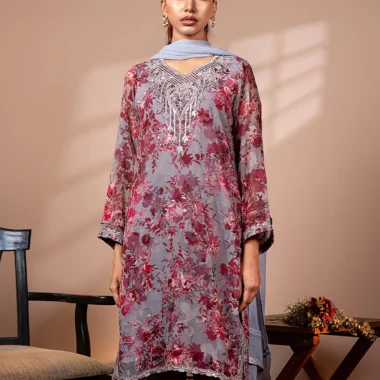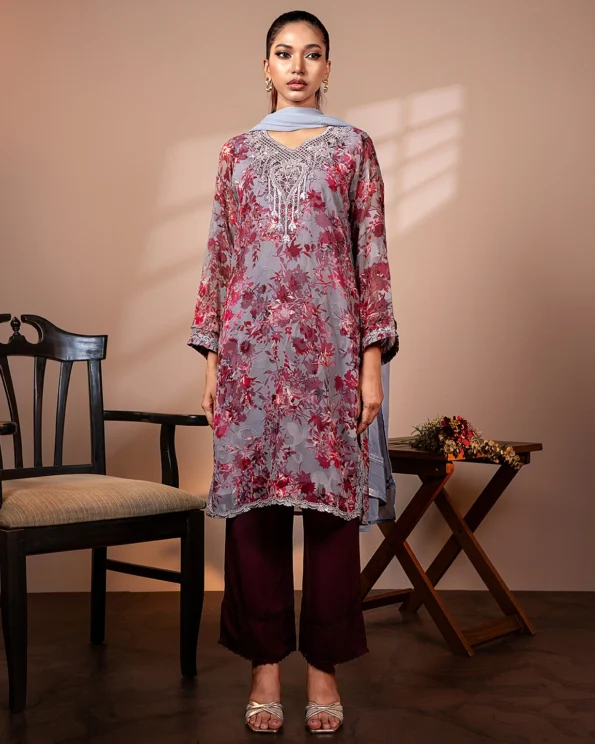 Embroidered Chiffon Floral Long Kameez | Ash