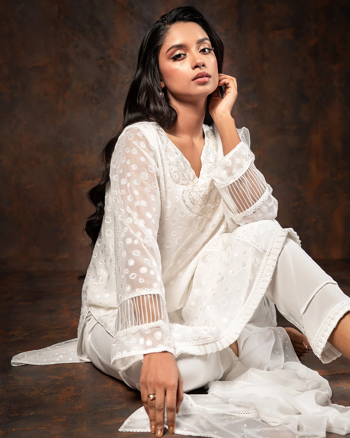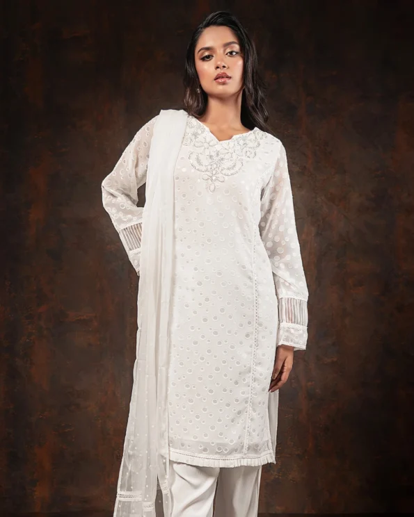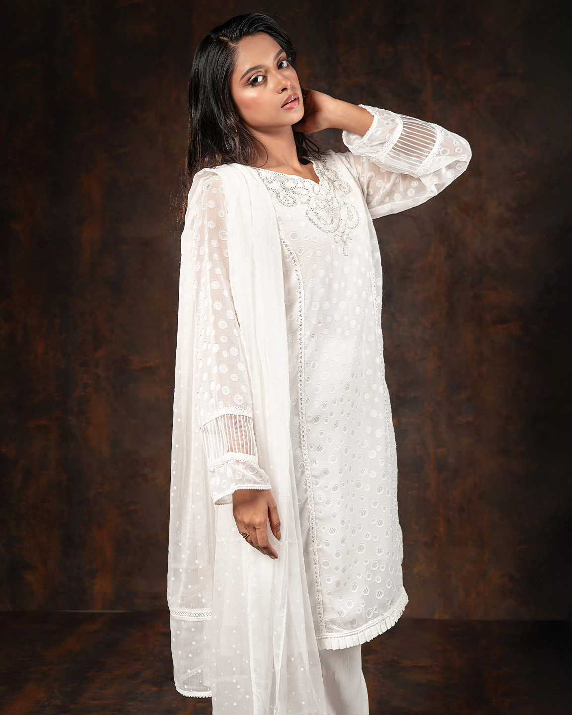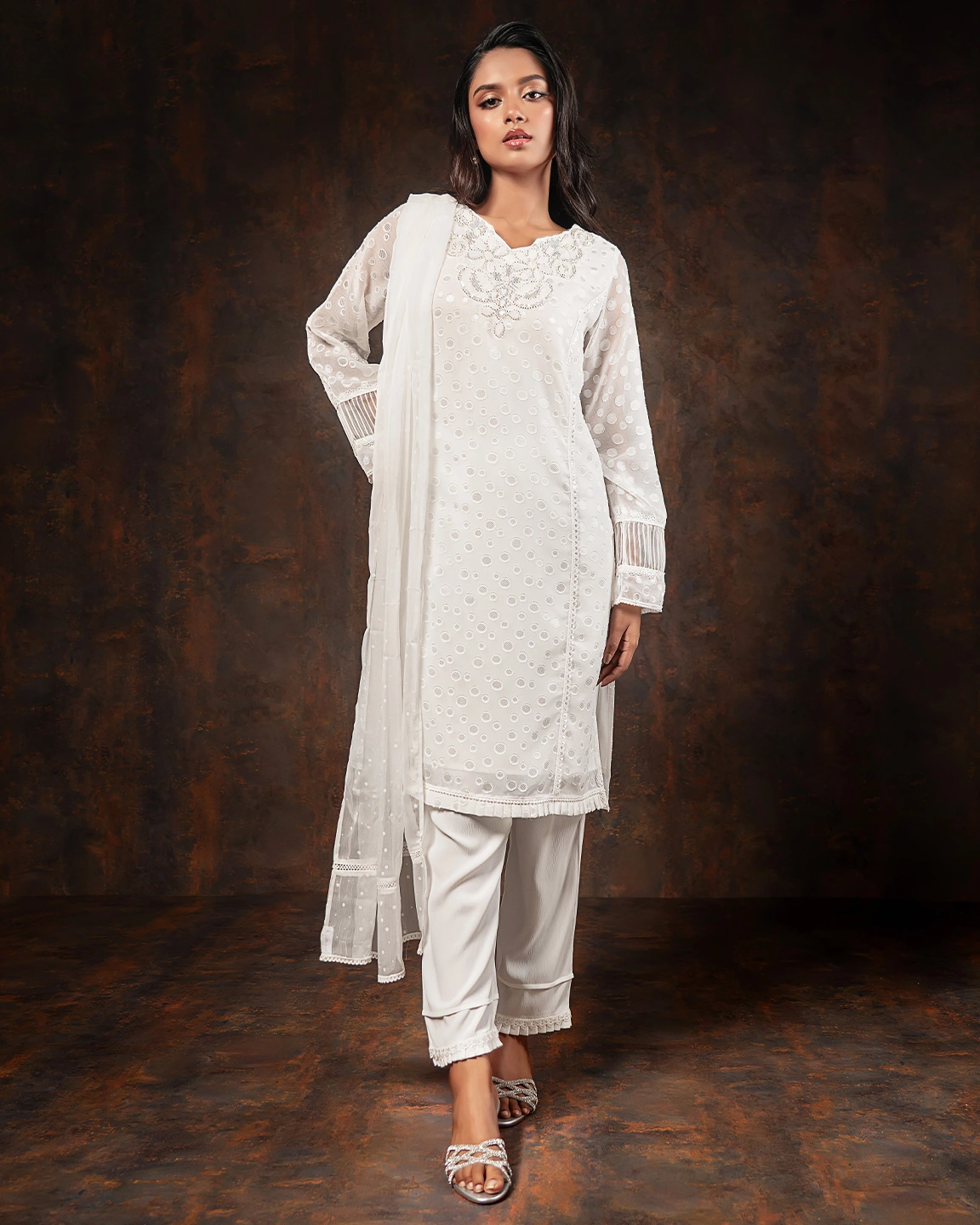 Embroidered Chiffon Velvet Dot Kameez | Ghost White