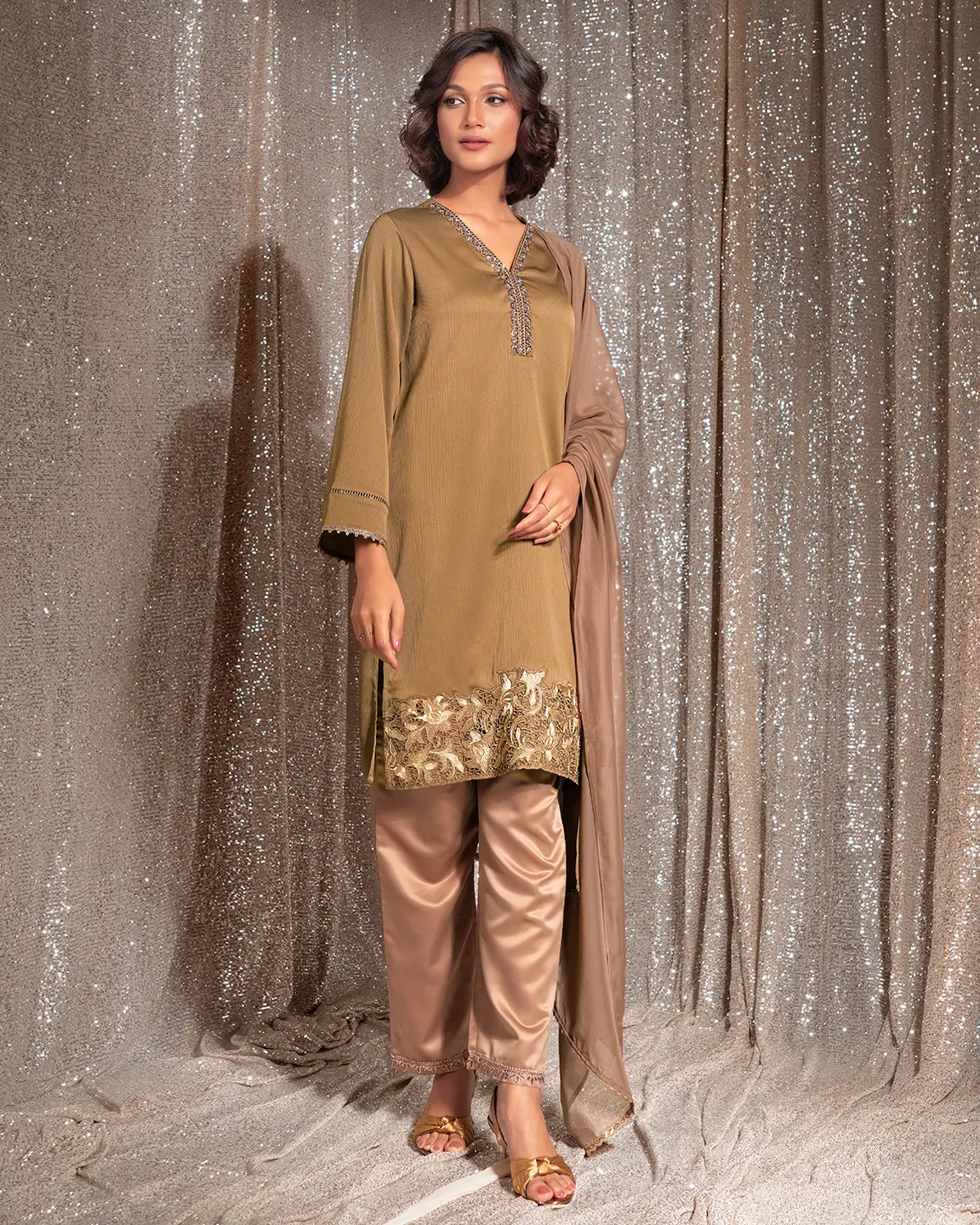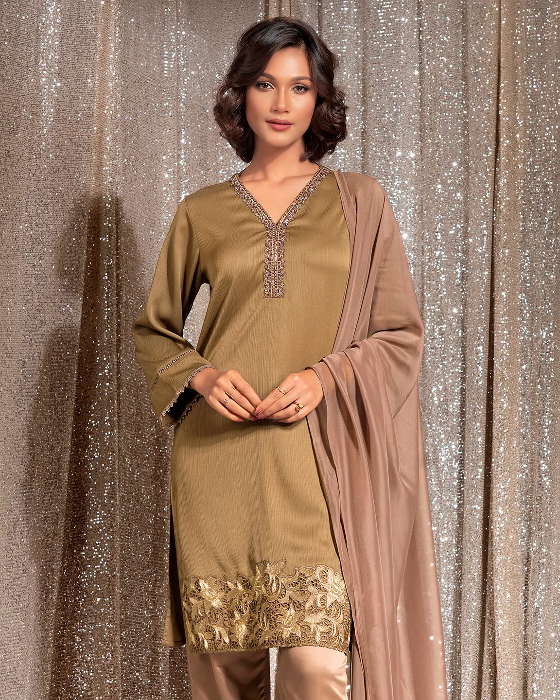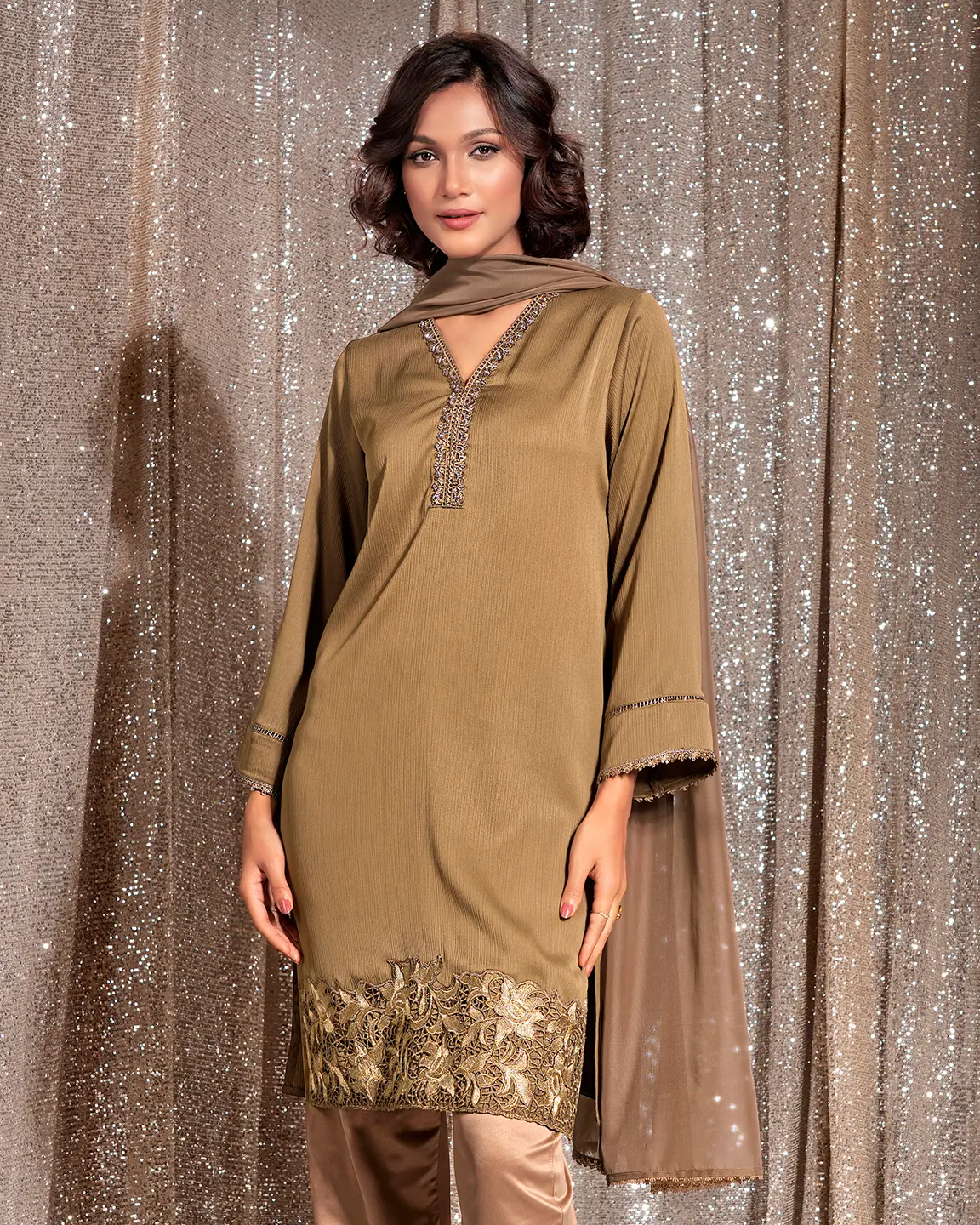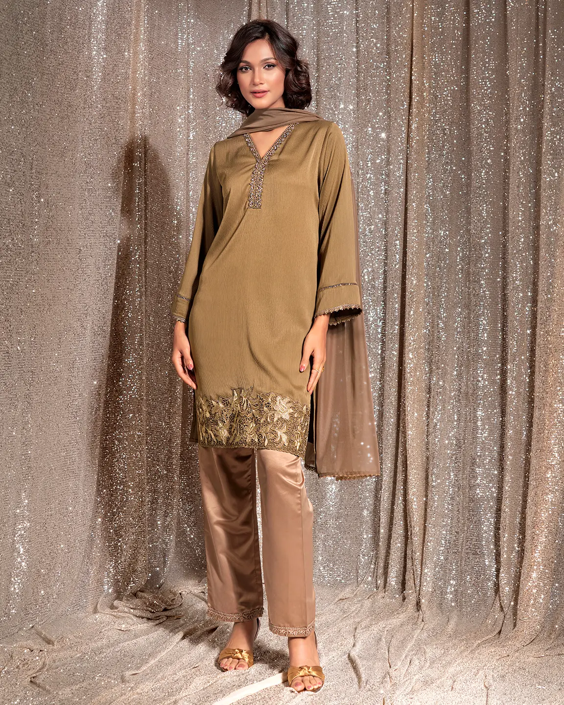 Product Details: A graceful Capulet Olive kameez featuring an embellished V-slit neckline, subtle sleeve detailing, and a delicately embroidered floral hem. Designed in a timeless straight silhouette, perfect for elegant festive moments.