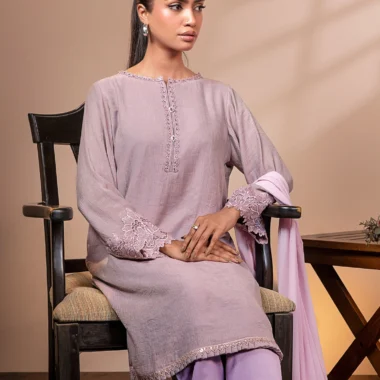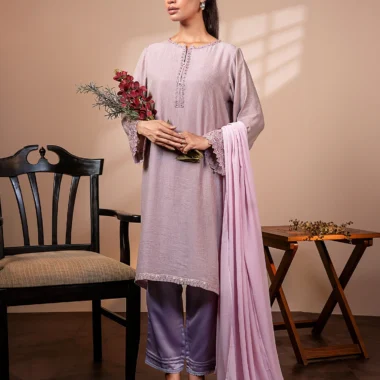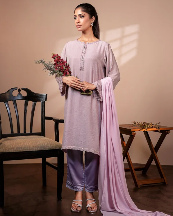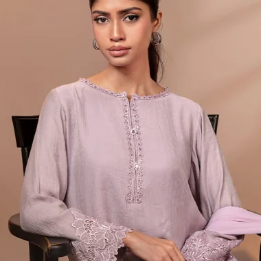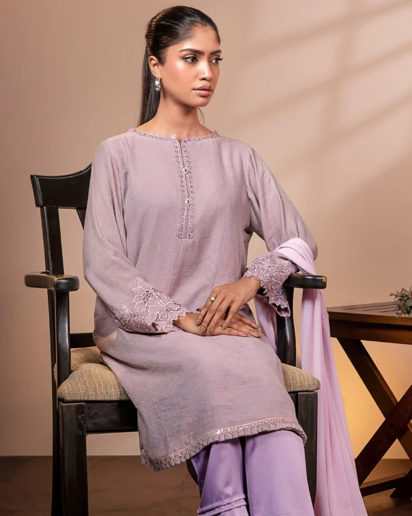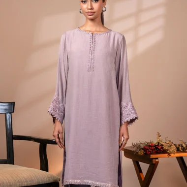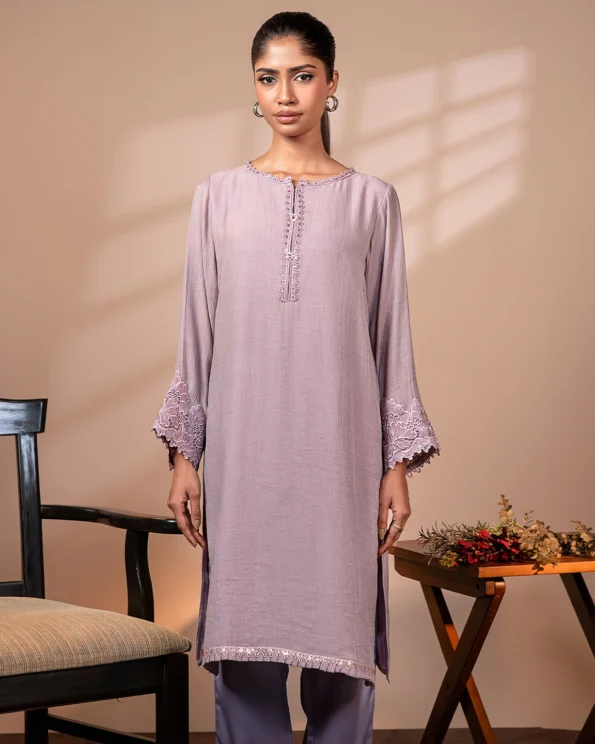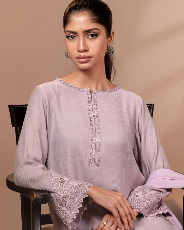 Minimalist and feminine, this dusty lilac short kameez is crafted from breathable crinkle cotton and finished with tonal lace embroidery on the cuffs and neckline. Perfect for your intimate festive gatherings.