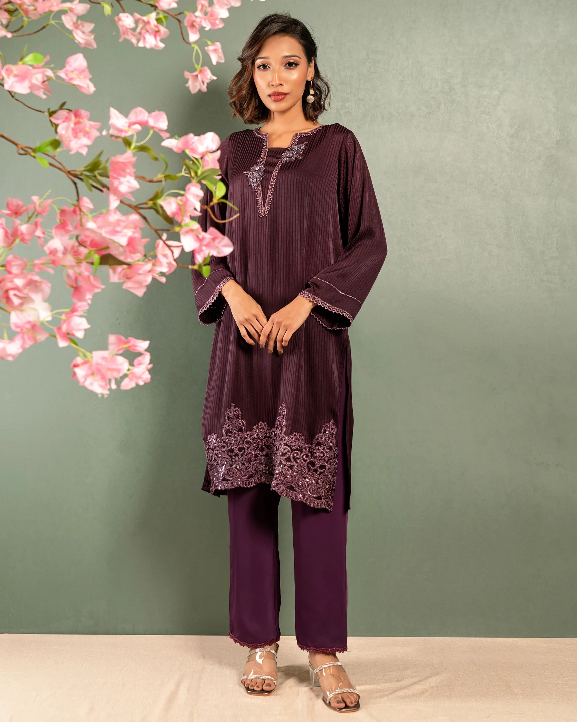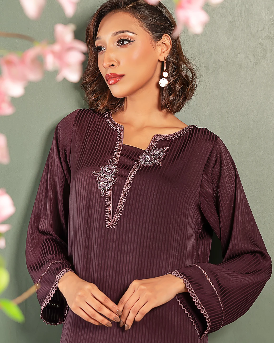 Product Details : Crinkle georgette Straight fit Long Kameez has Round-Neck with neck has lace & karchupi work details, has full sleeve and sleeve hemline has join lace & lace details, hemline has embroidery details, has both side slits details for easy to wear.