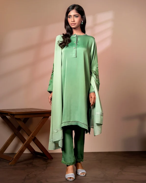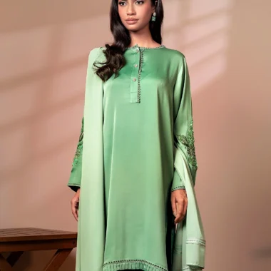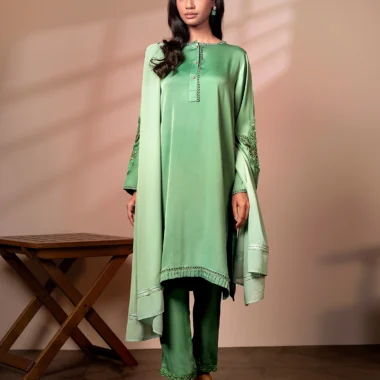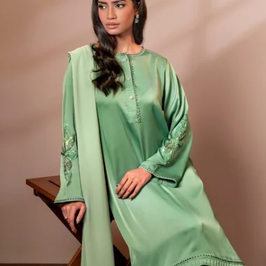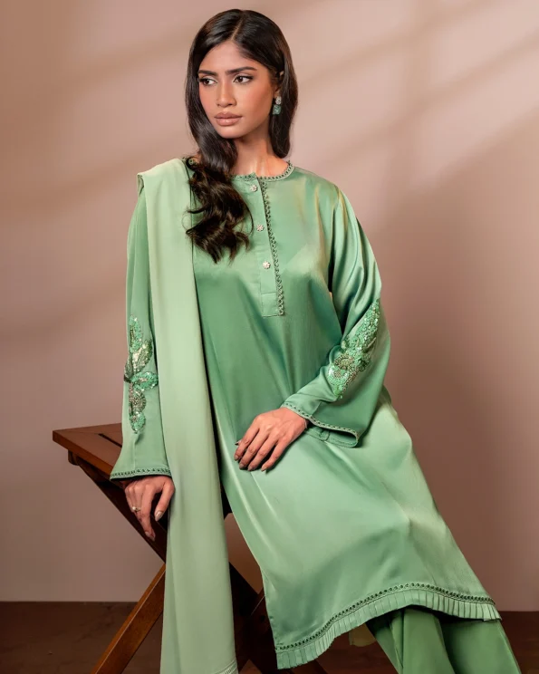 Glowing in Ocean Green, this luxurious crinkle silk kameez is enhanced with Green sequin embroidery on the sleeves and delicate trims at the hem. A versatile choice for both festive days and evening soirées.