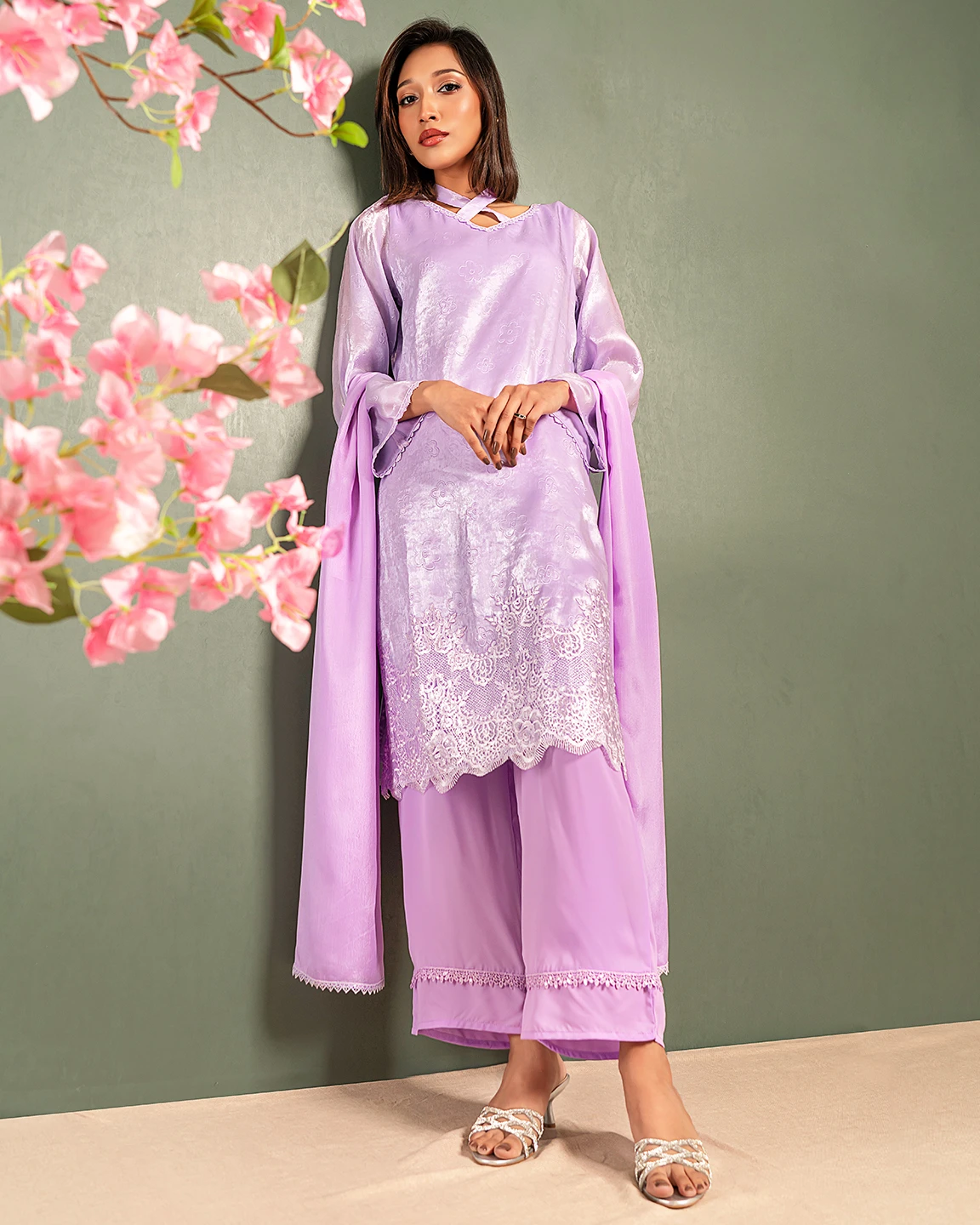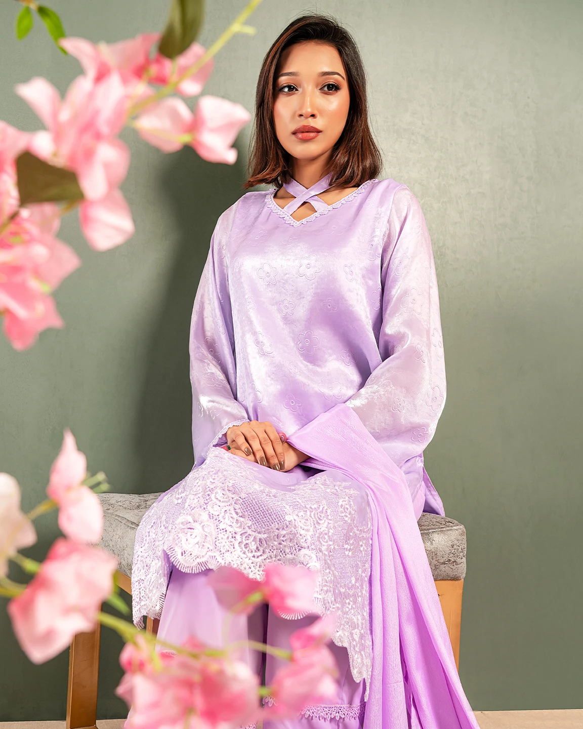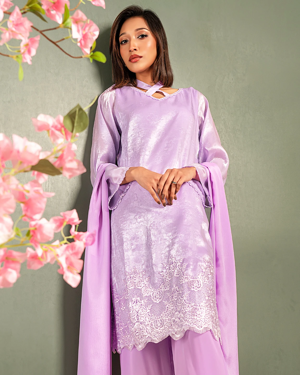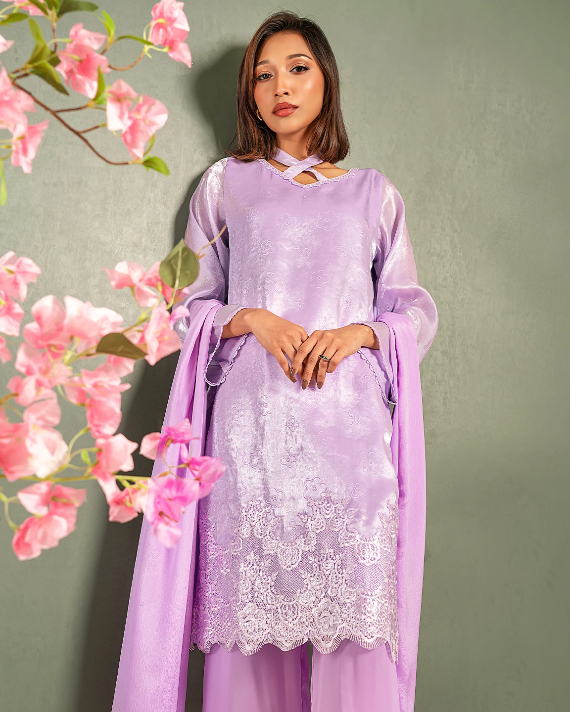 Product Details : Double silk organza loose fit long kameez has fusion neck with neck has lace work details, has full sleeve and sleeve hemline has lace details, hemline has karchupi details, both side slits with attached lining for comfort & easy.