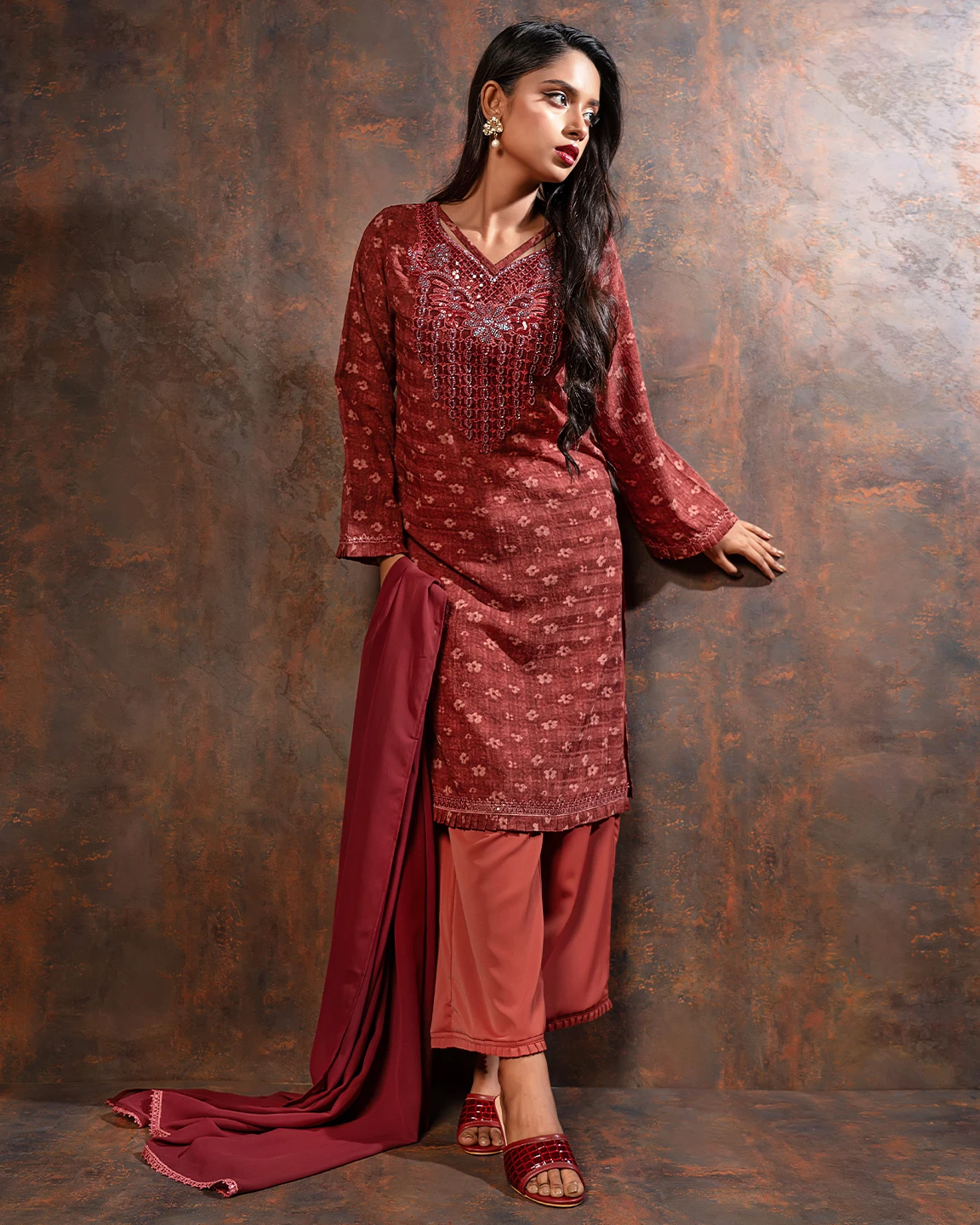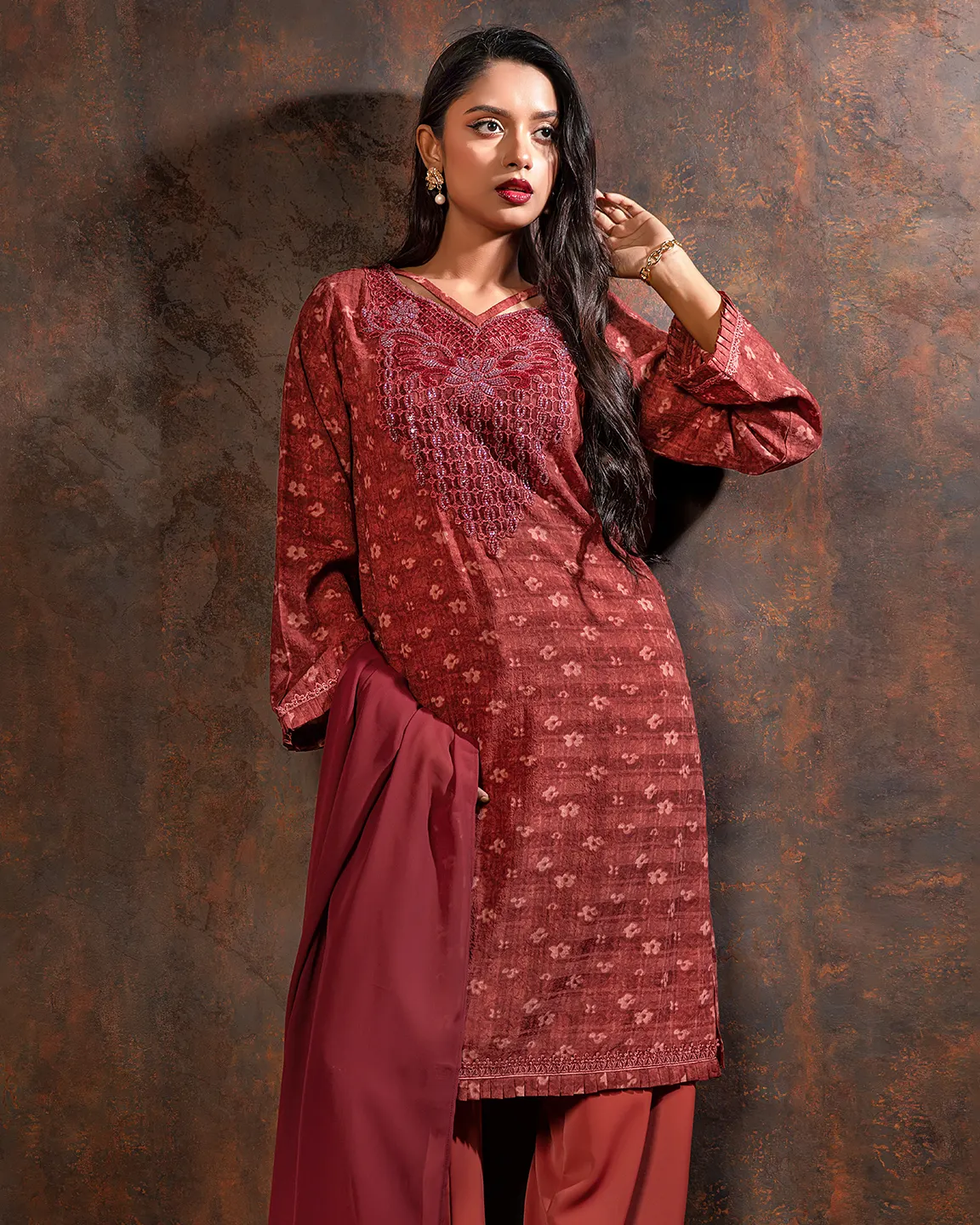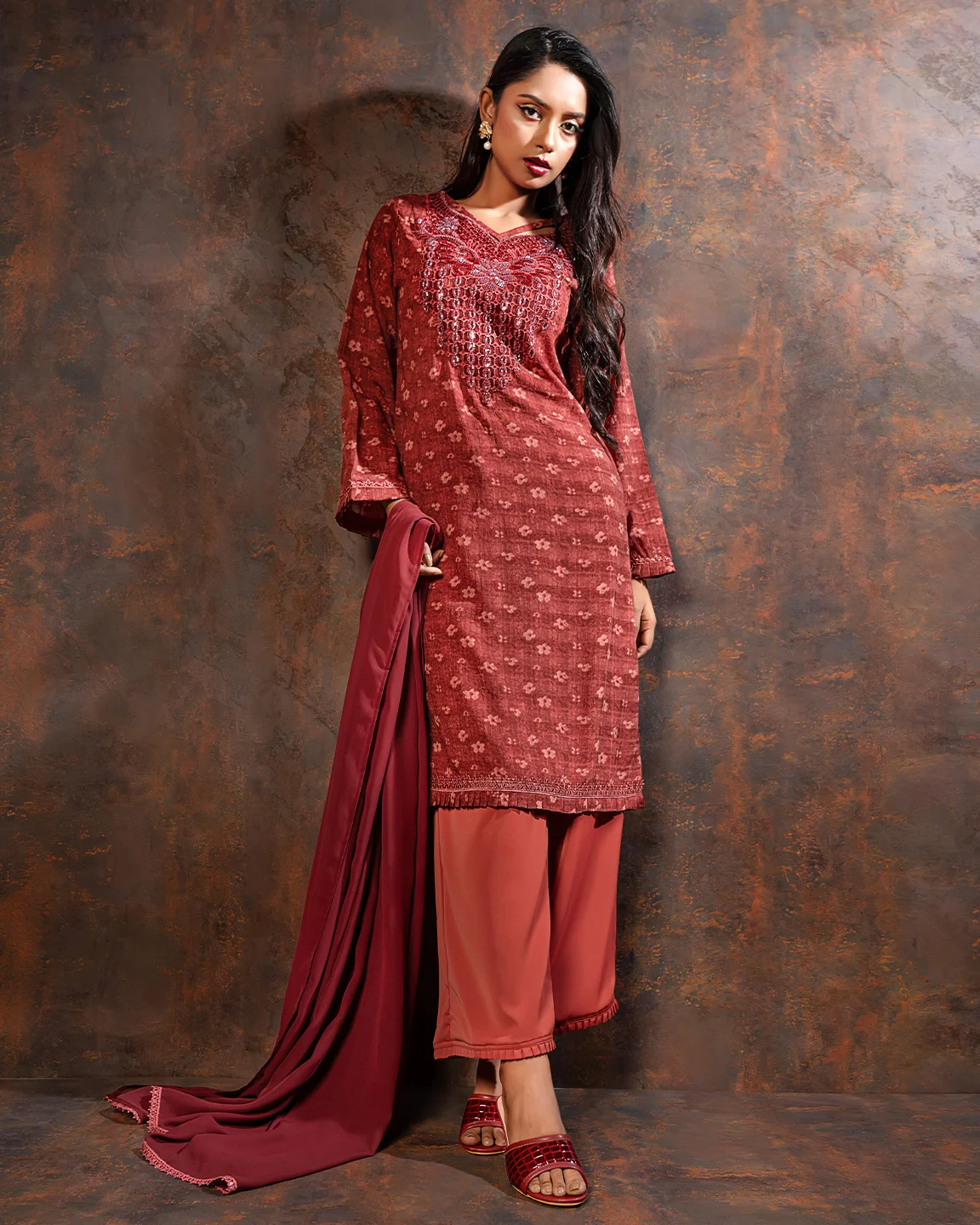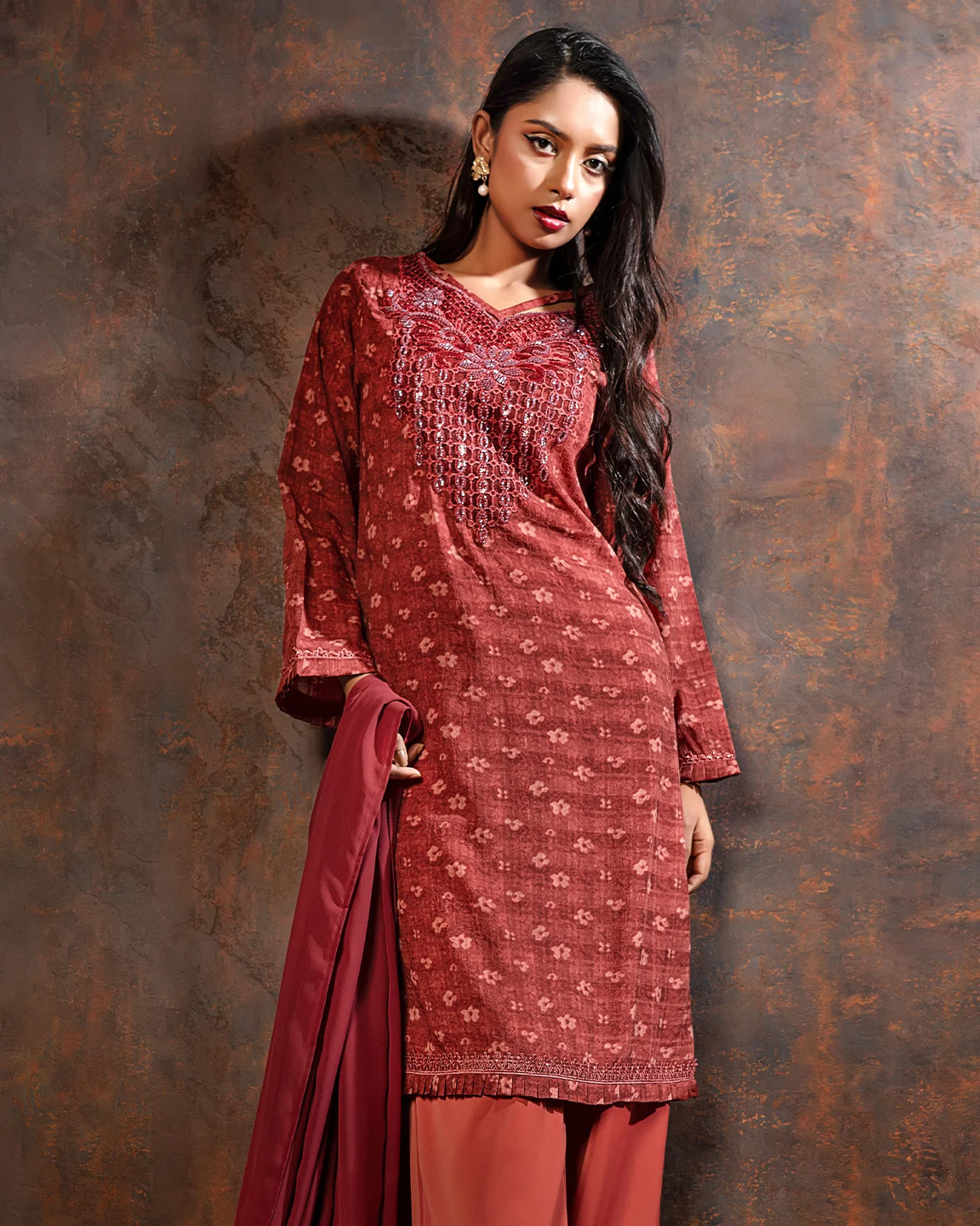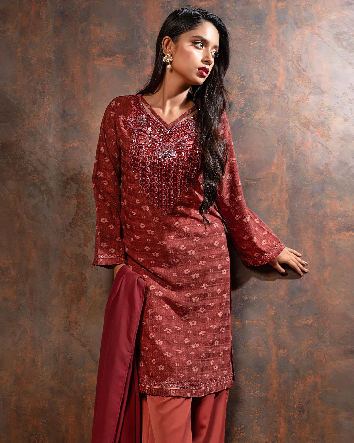 Product Details:Fusion V-neckline Regular Fit long Kameez has neck karchupi work details. Sleeves has full-length, sleeve has ruffle and lace details. The hemline has ruffle with lace details. Both side slits lace for comfort & easy.