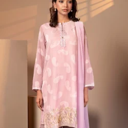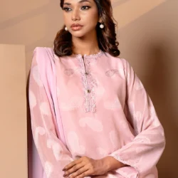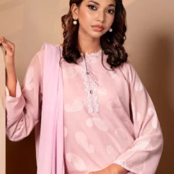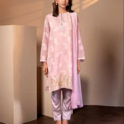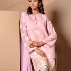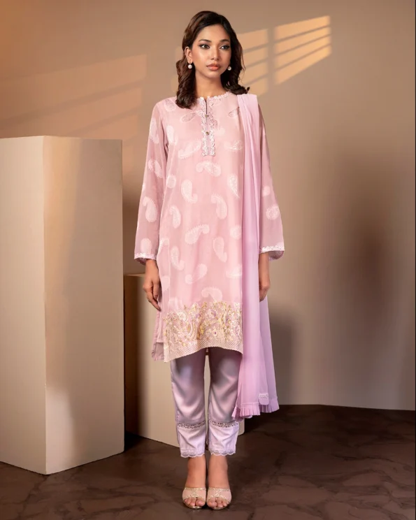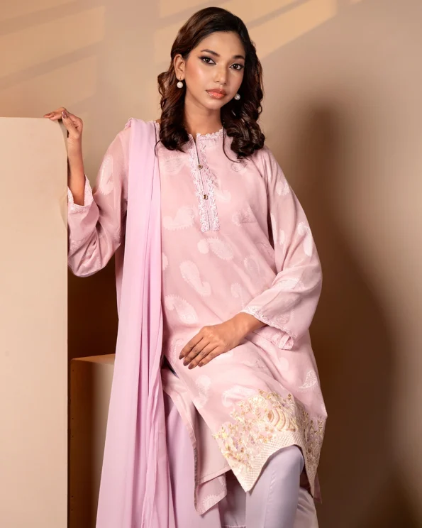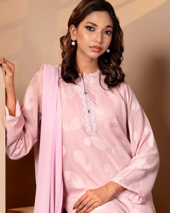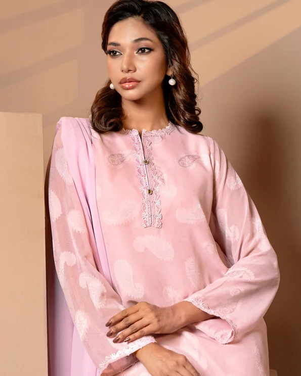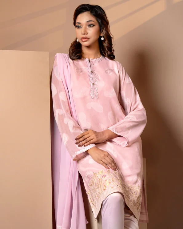 Elegant and easy-going, this pearl pink jacquard short kameez features delicate embroidery at the hem and soft paisley weaving throughout. It’s made for graceful everyday wear with a polished edge.
