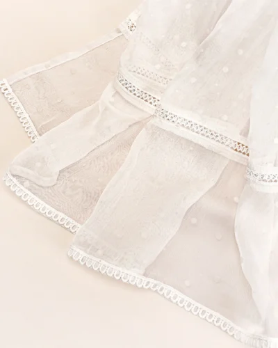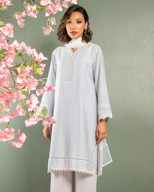 Product Details : Luxury Double Silk Loose fit Long Kameez has Fusion-Neck with neck has karchupi work details, has full sleeve and sleeve hemline has lace and pin tack and lace work details, hemline has lace karchupi work details, has both side slits for easy to wear.