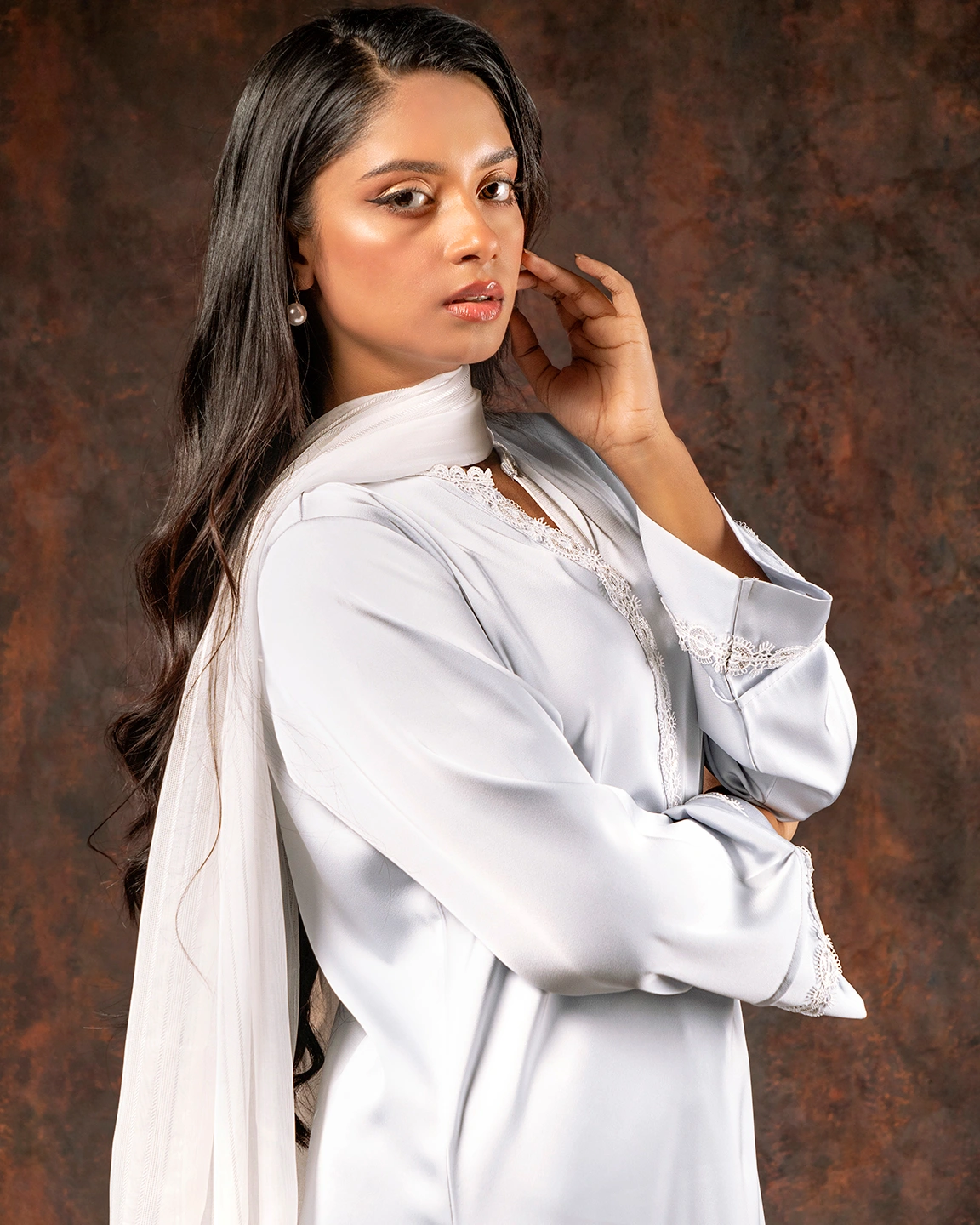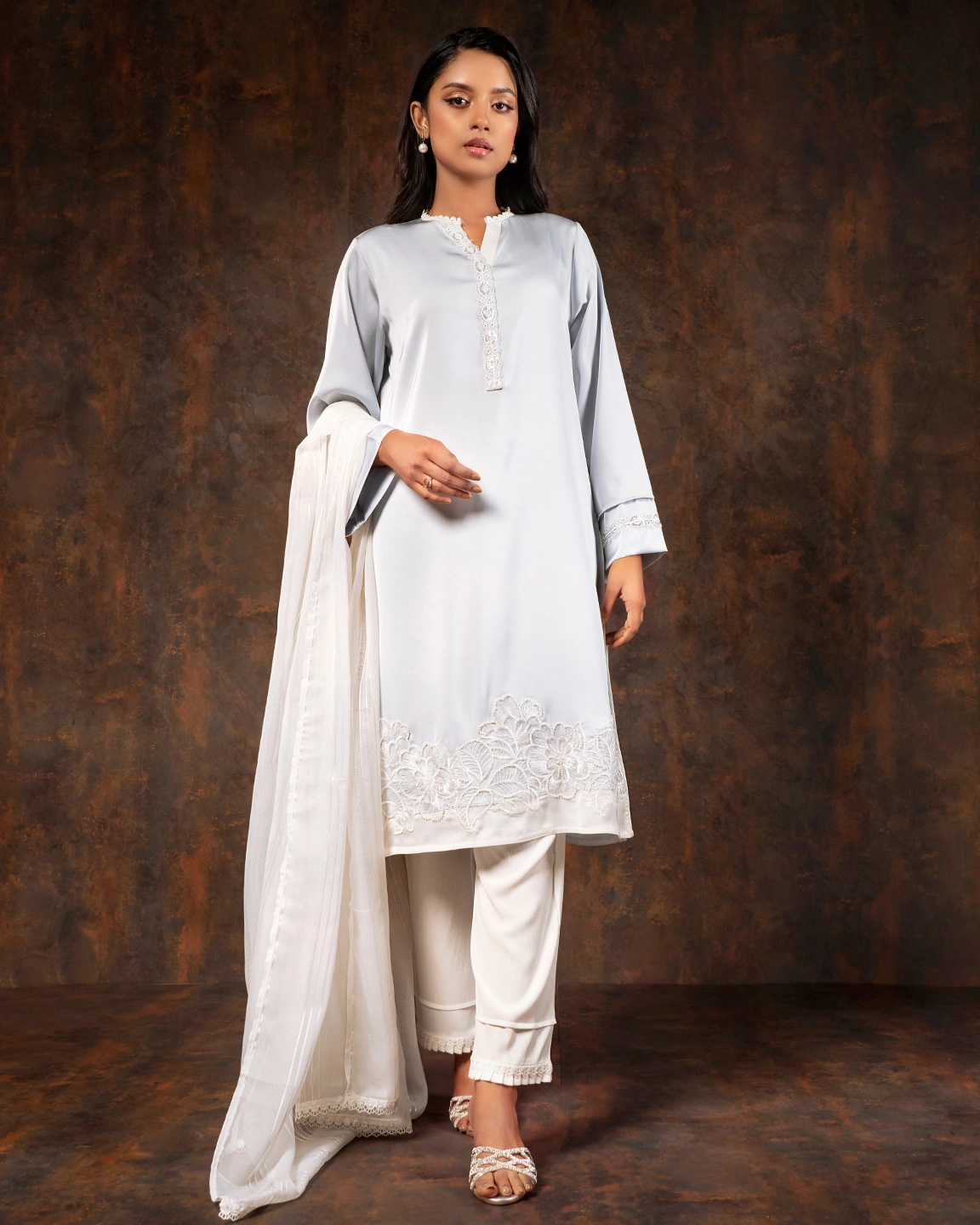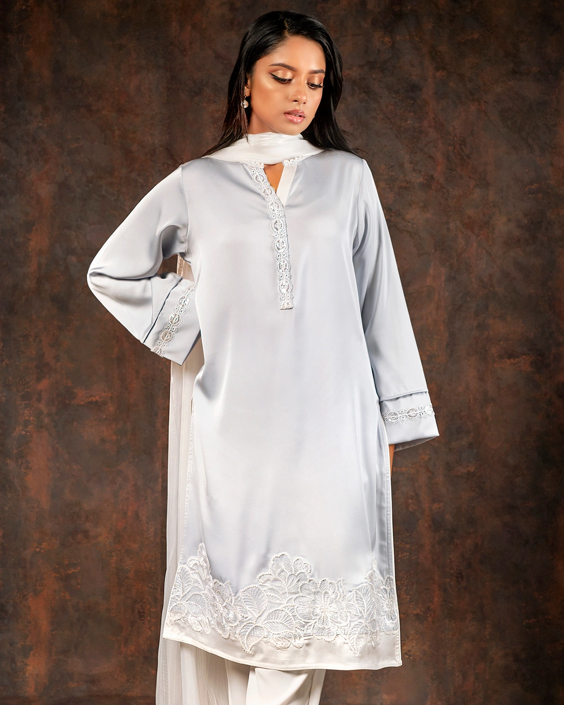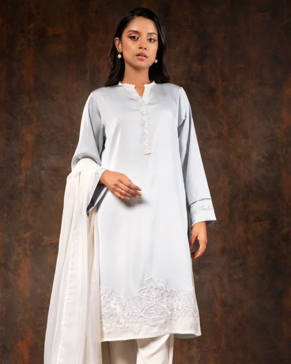 Product Details: Luxury Double silk Straight Fit long Kameez has V neck with lace details, has full sleeve with lace details, hemline has karchupi work details, front placket has lace details, both side slits for comfort & easy.