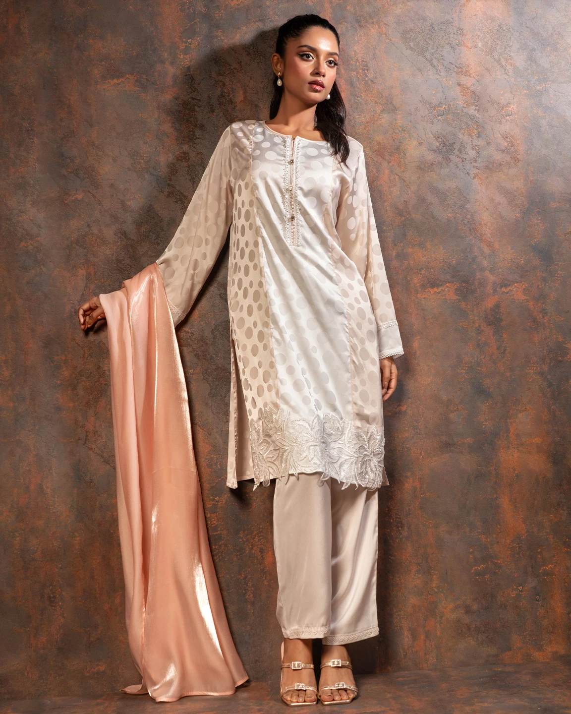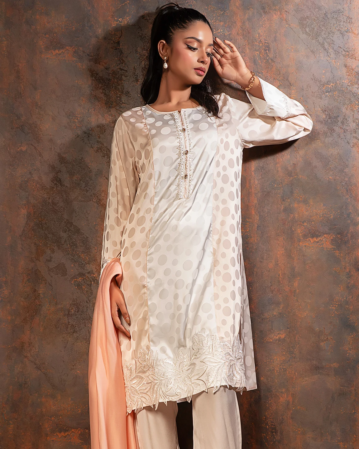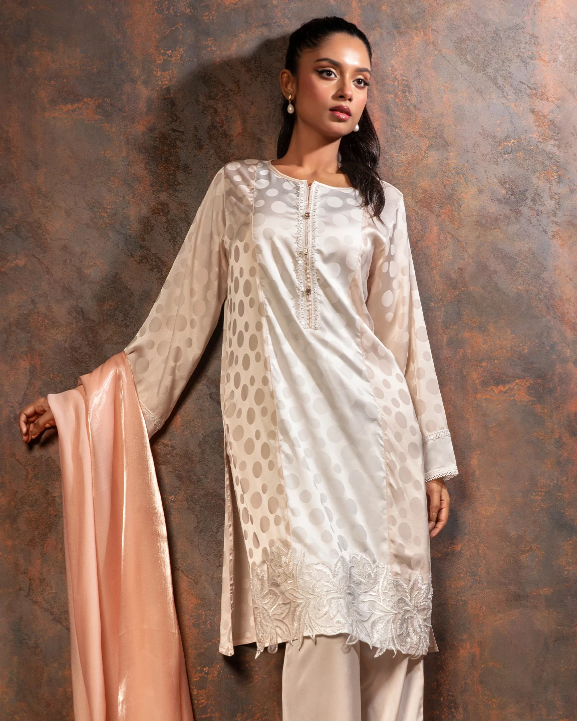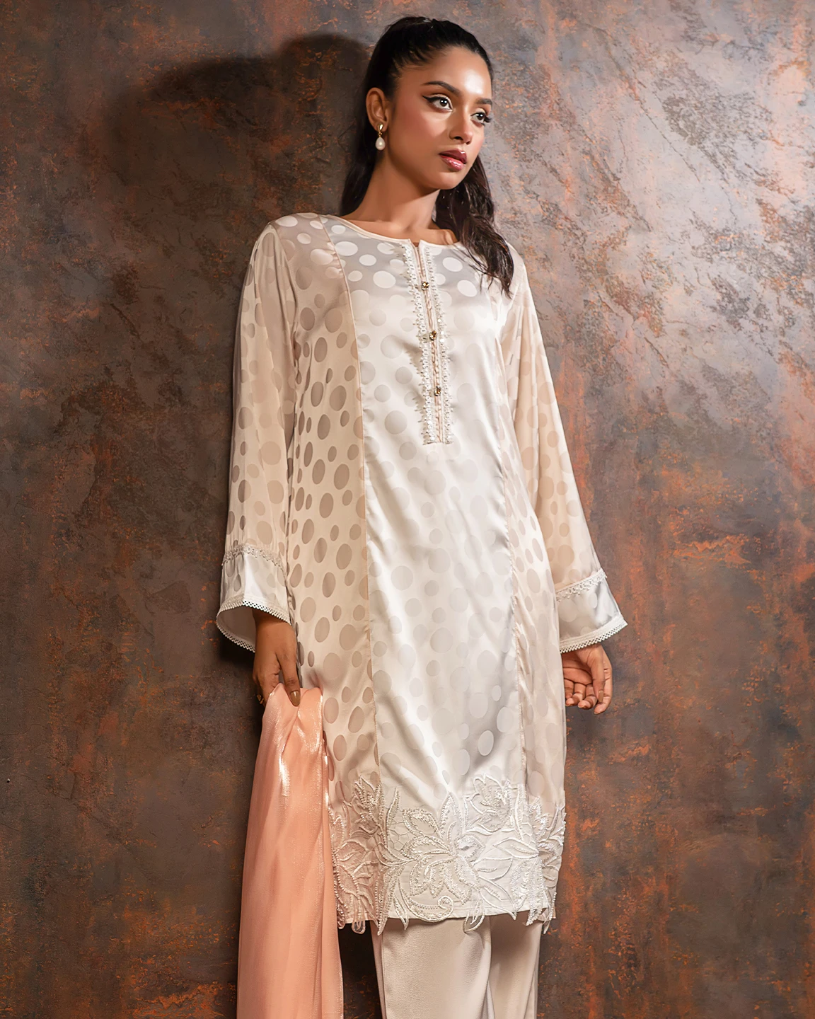 Embroidered luxury Double silk Kameez | Cream White