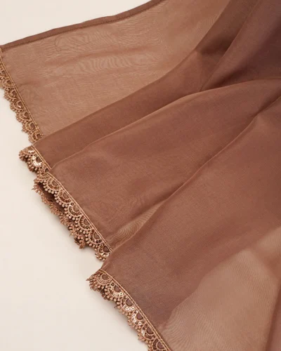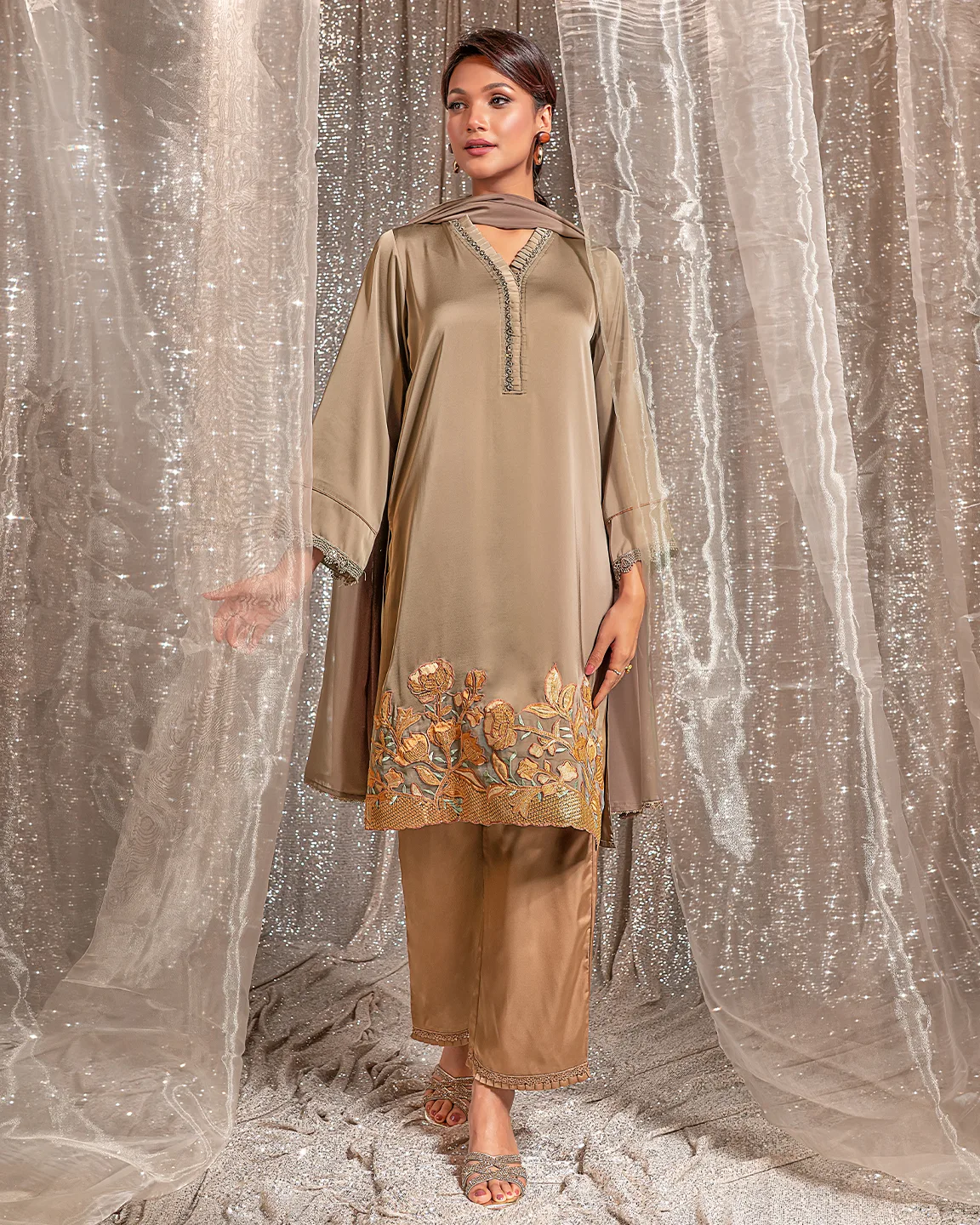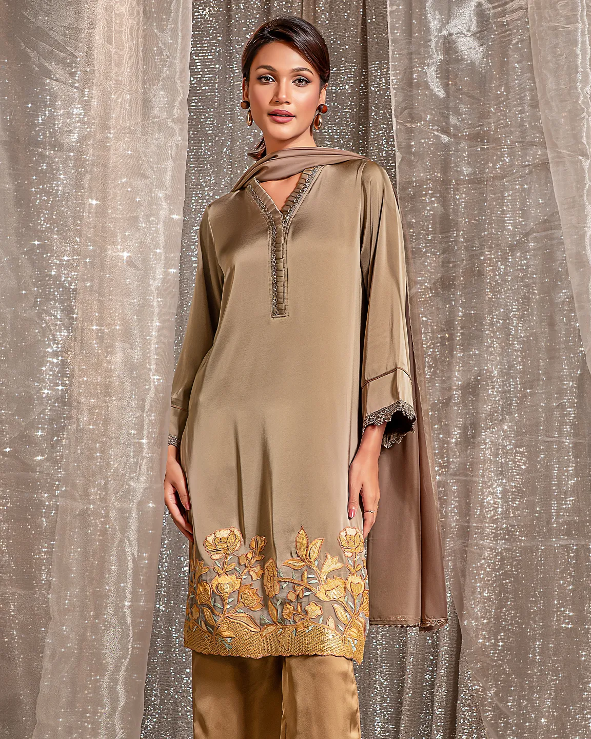 Product Details: A refined Mocha kameez designed with a clean straight silhouette and a delicately detailed neckline. The look is beautifully enhanced with intricate floral embroidery along the hem and subtle lace accents on the sleeves, creating a graceful festive statement perfect for Eid and special gatherings.