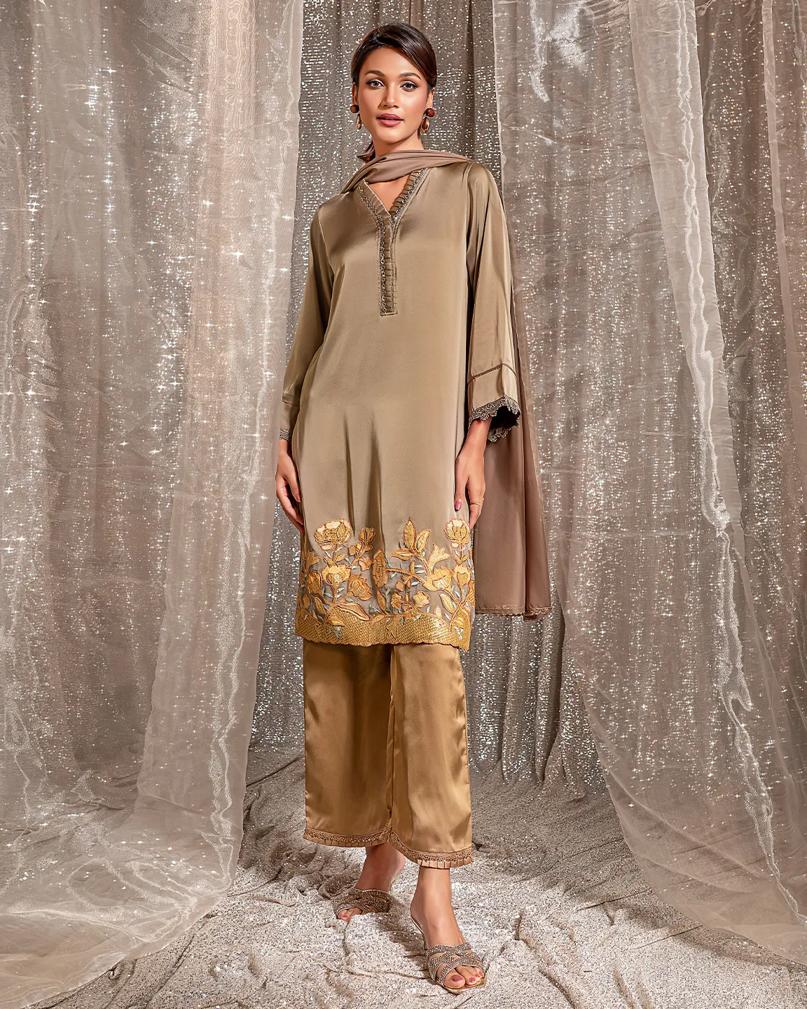 Embroidered Luxury Double Silk Long Kameez | Mocha