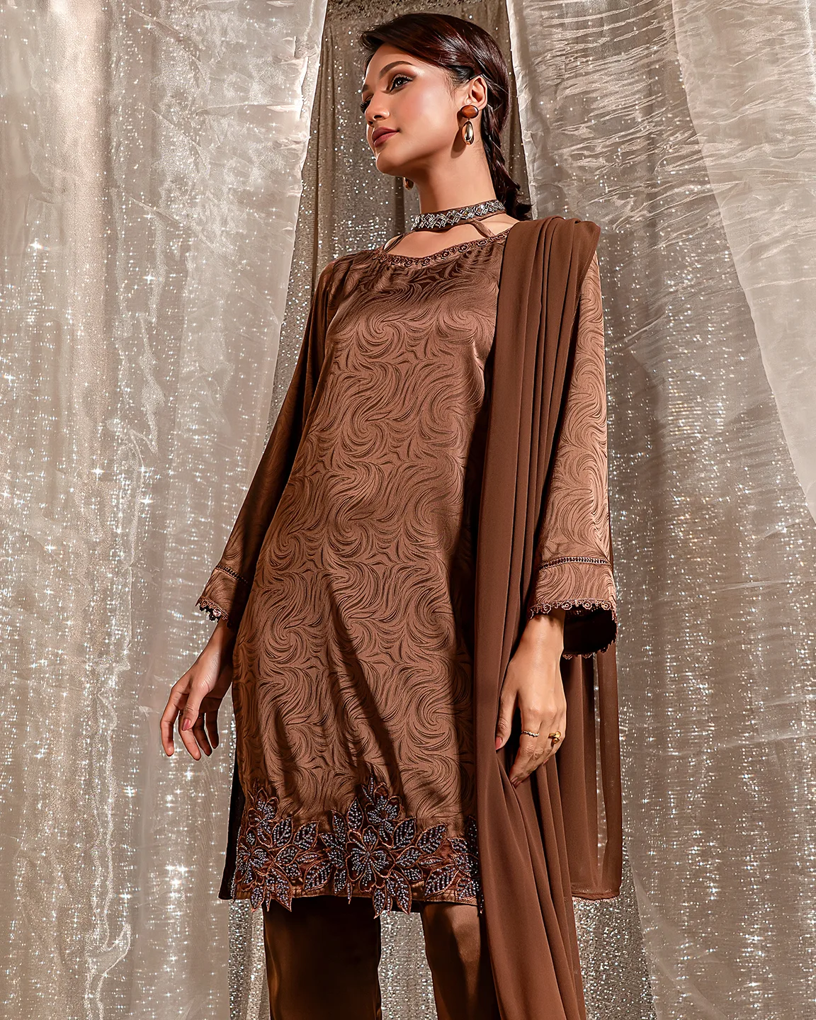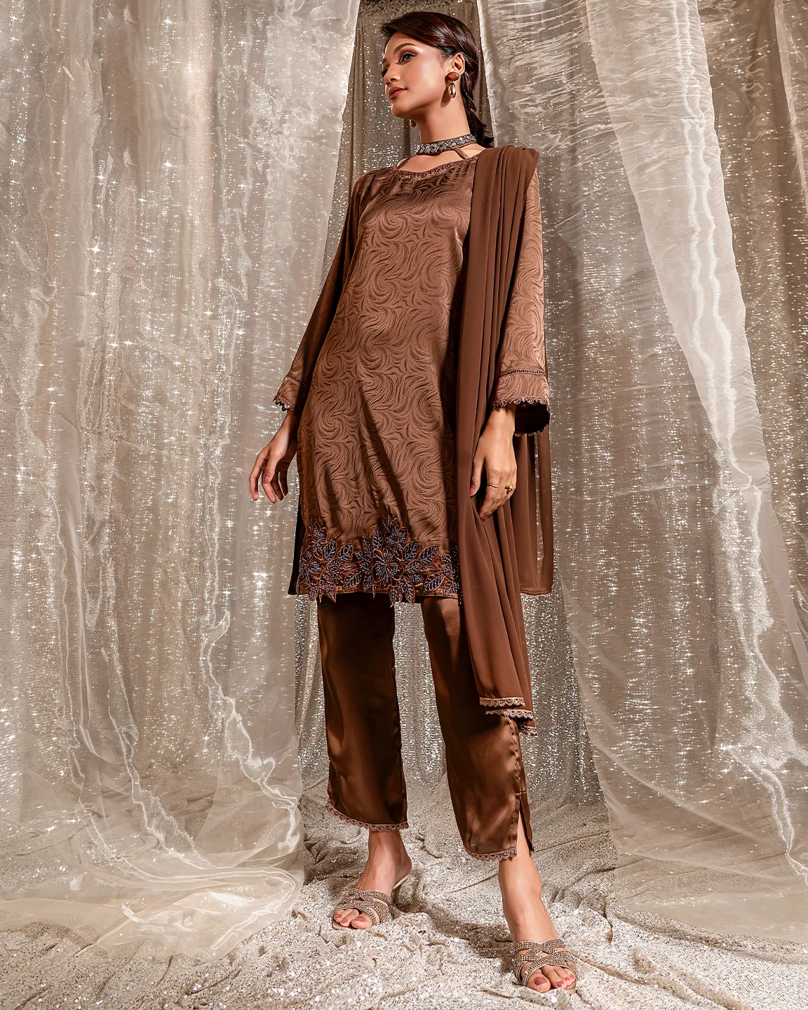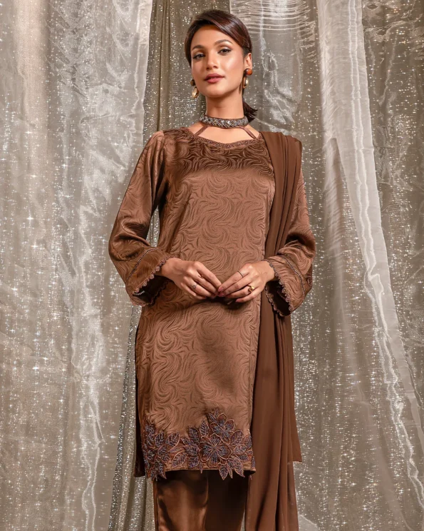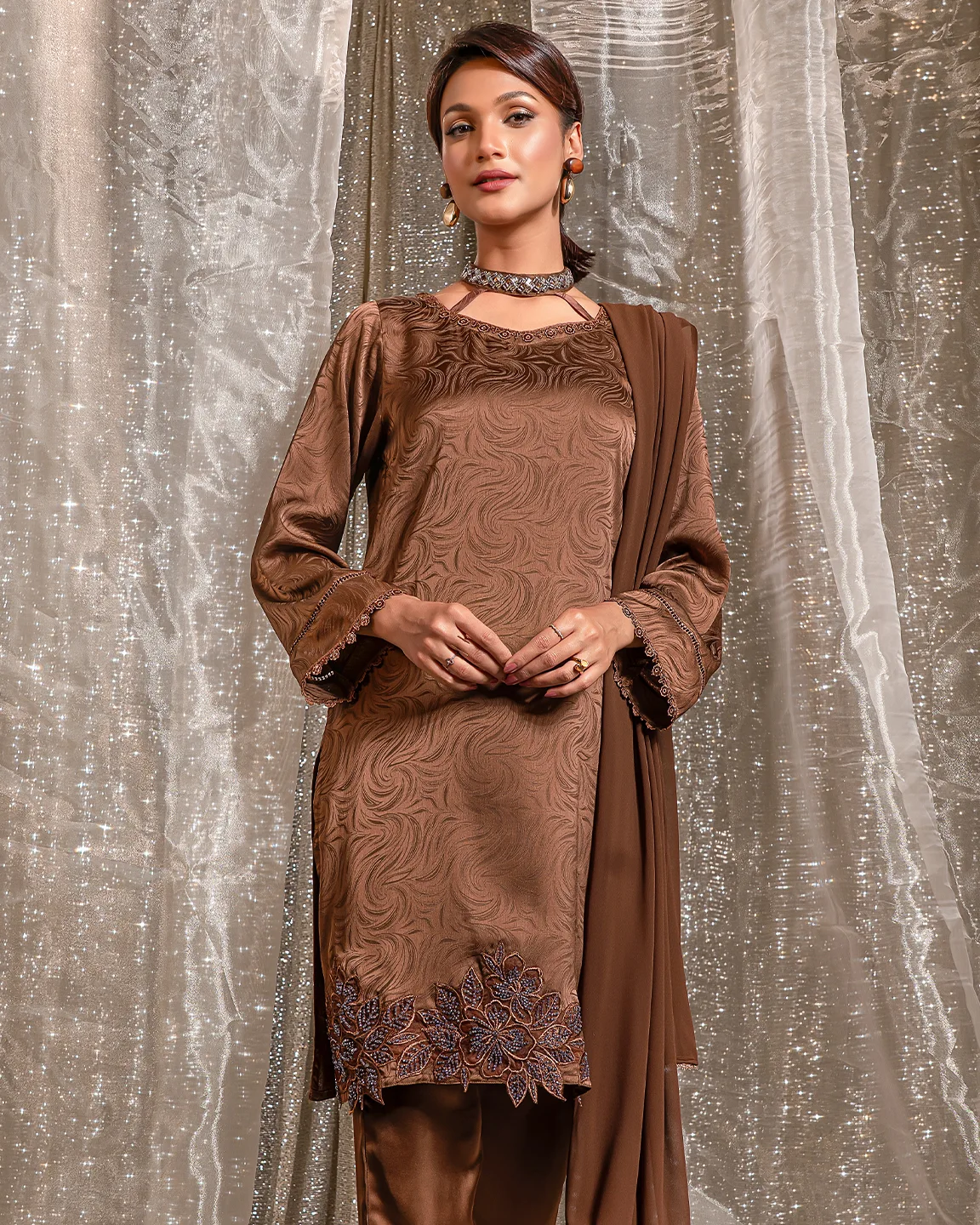 Product Details: A refined Chocolate Truffle-toned kameez featuring an elegant swirl-textured finish and a delicately detailed neckline. The silhouette is beautifully enhanced with intricate floral embroidery along the hem and subtle lace accents on the sleeves, creating a graceful festive look perfect for Eid gatherings and evening occasions.