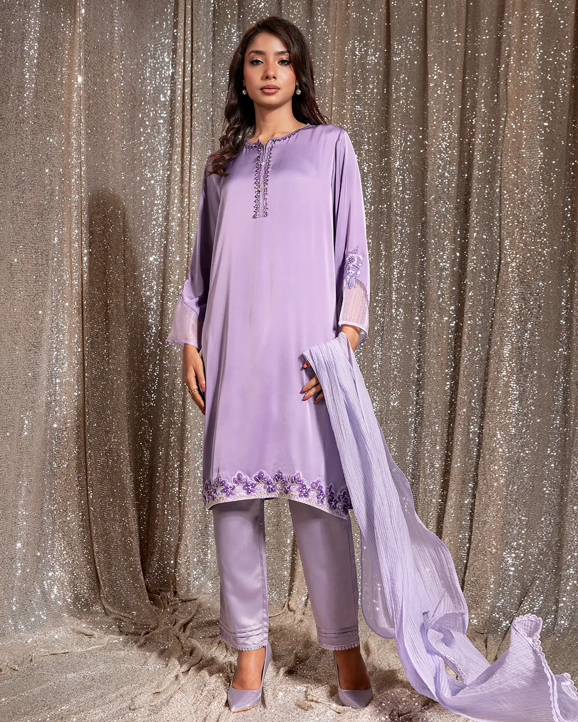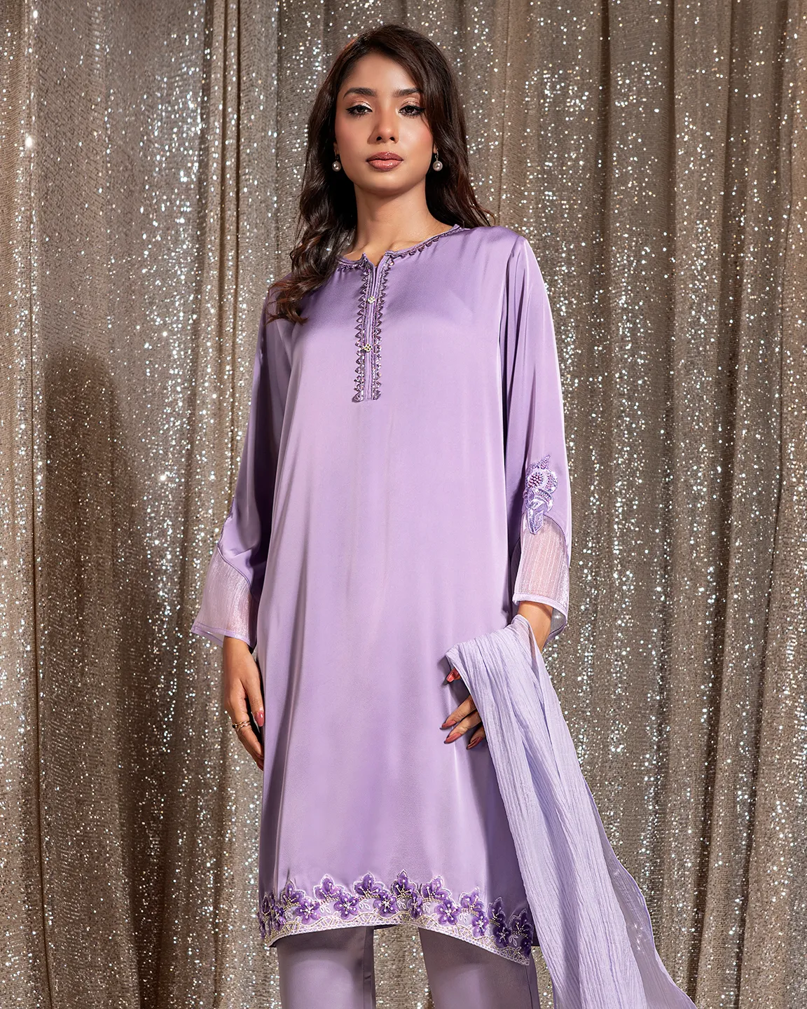 Product Details : A graceful Dark Violet kameez featuring a delicately detailed front placket and sheer sleeve accents. Finished with intricate floral embroidery along the hem for an elegant and refined festive look.
