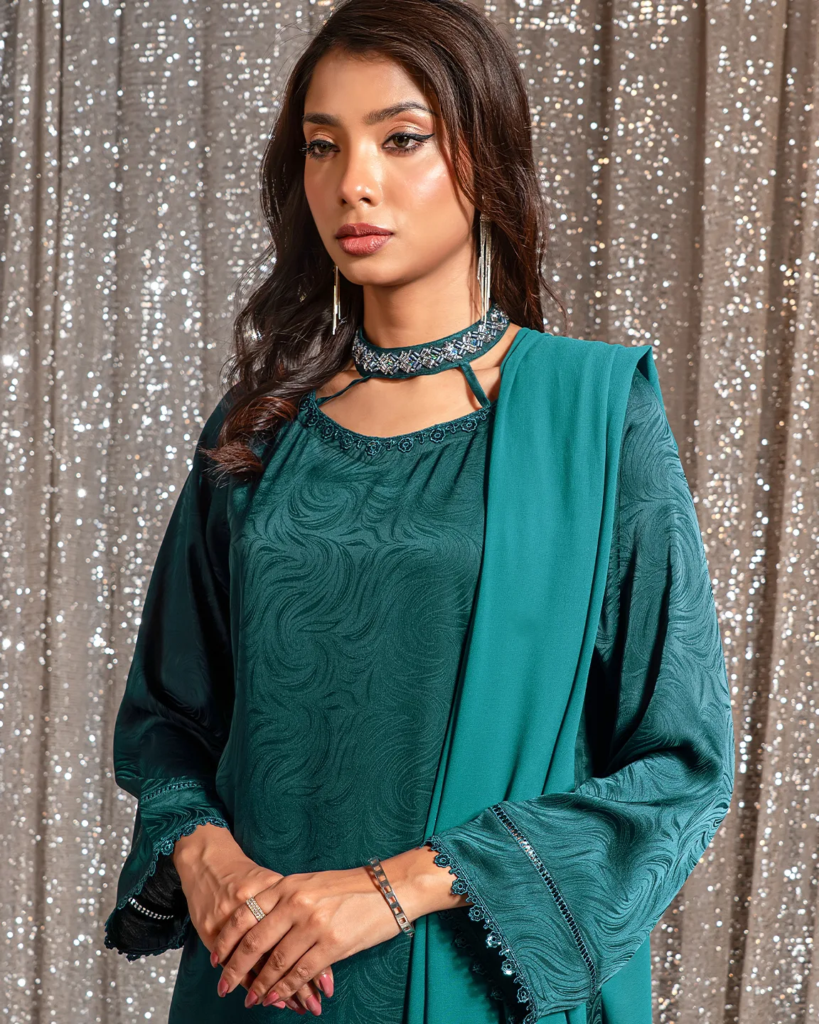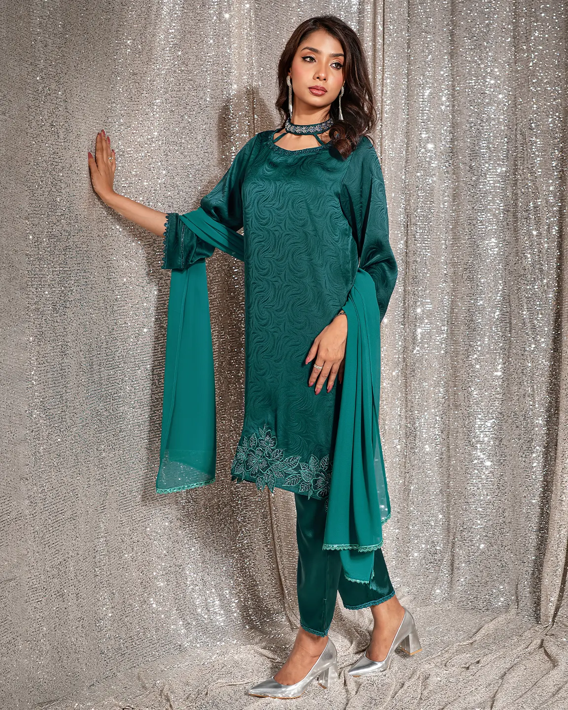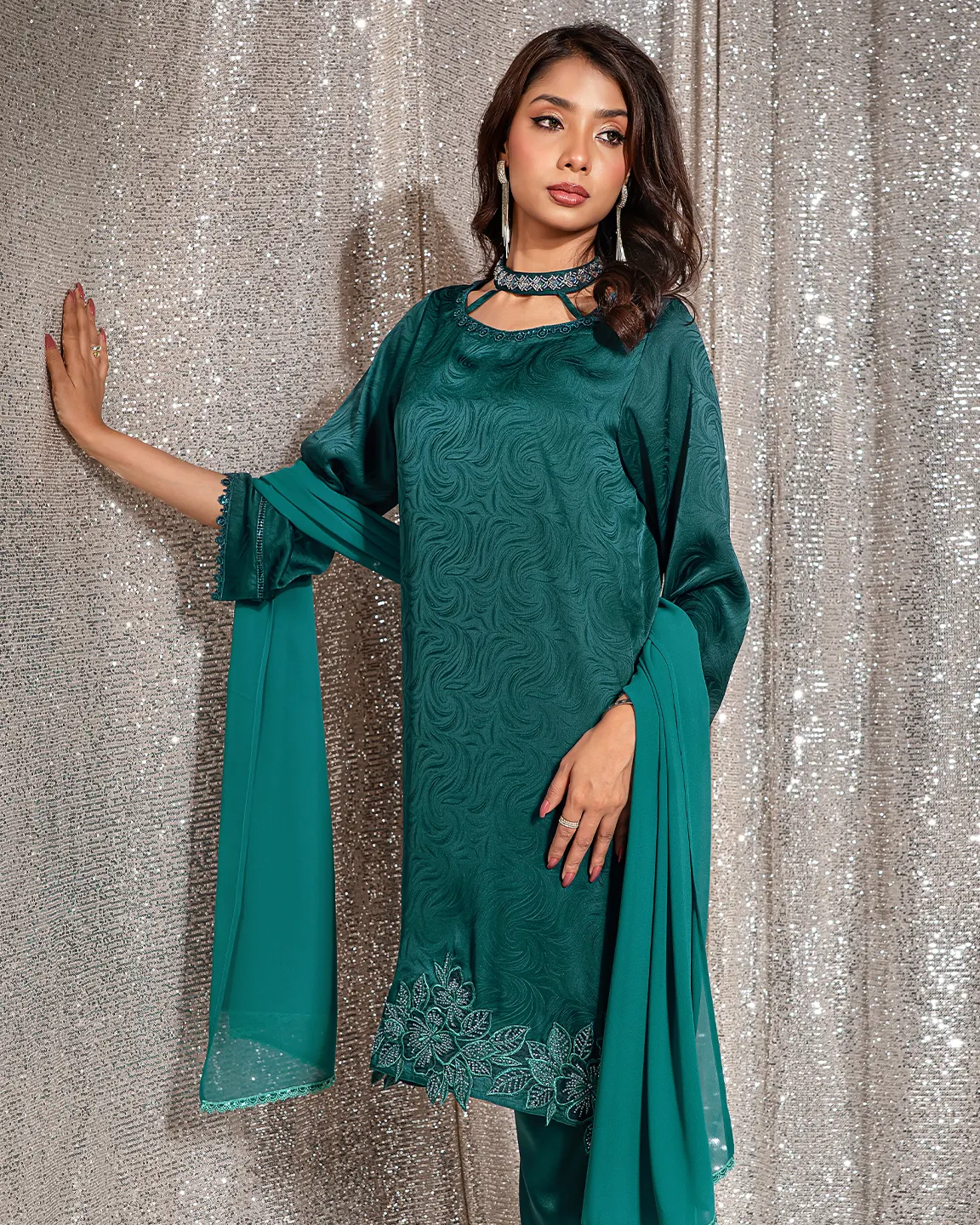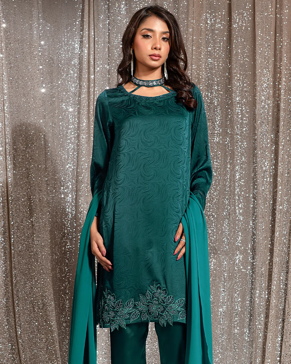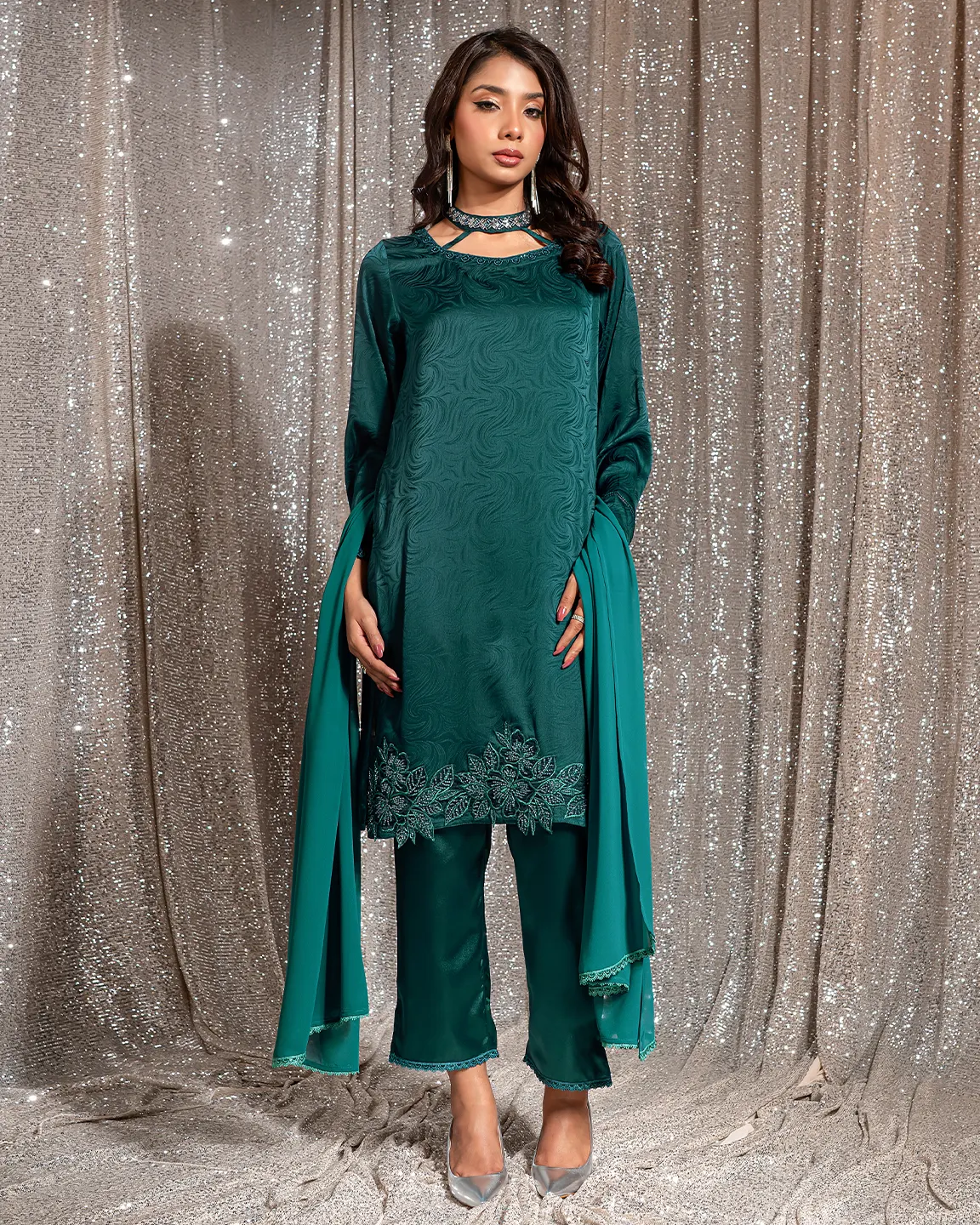Product Details:A refined Deep Sea Green Truffle-toned kameez featuring an elegant swirl-textured finish and a delicately detailed neckline. The silhouette is beautifully enhanced with intricate floral embroidery along the hem and subtle lace accents on the sleeves, creating a graceful festive look perfect for Eid gatherings and evening occasions.