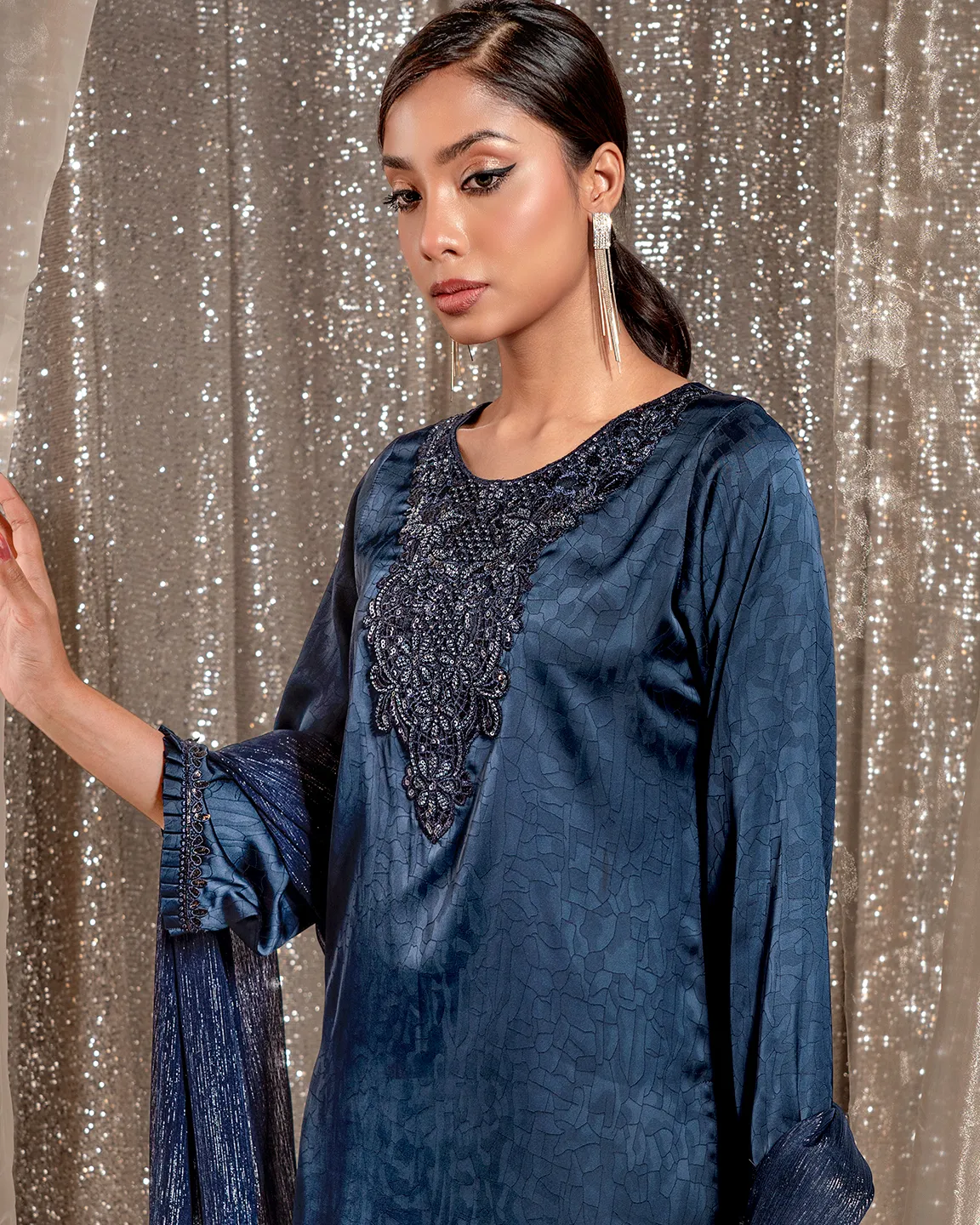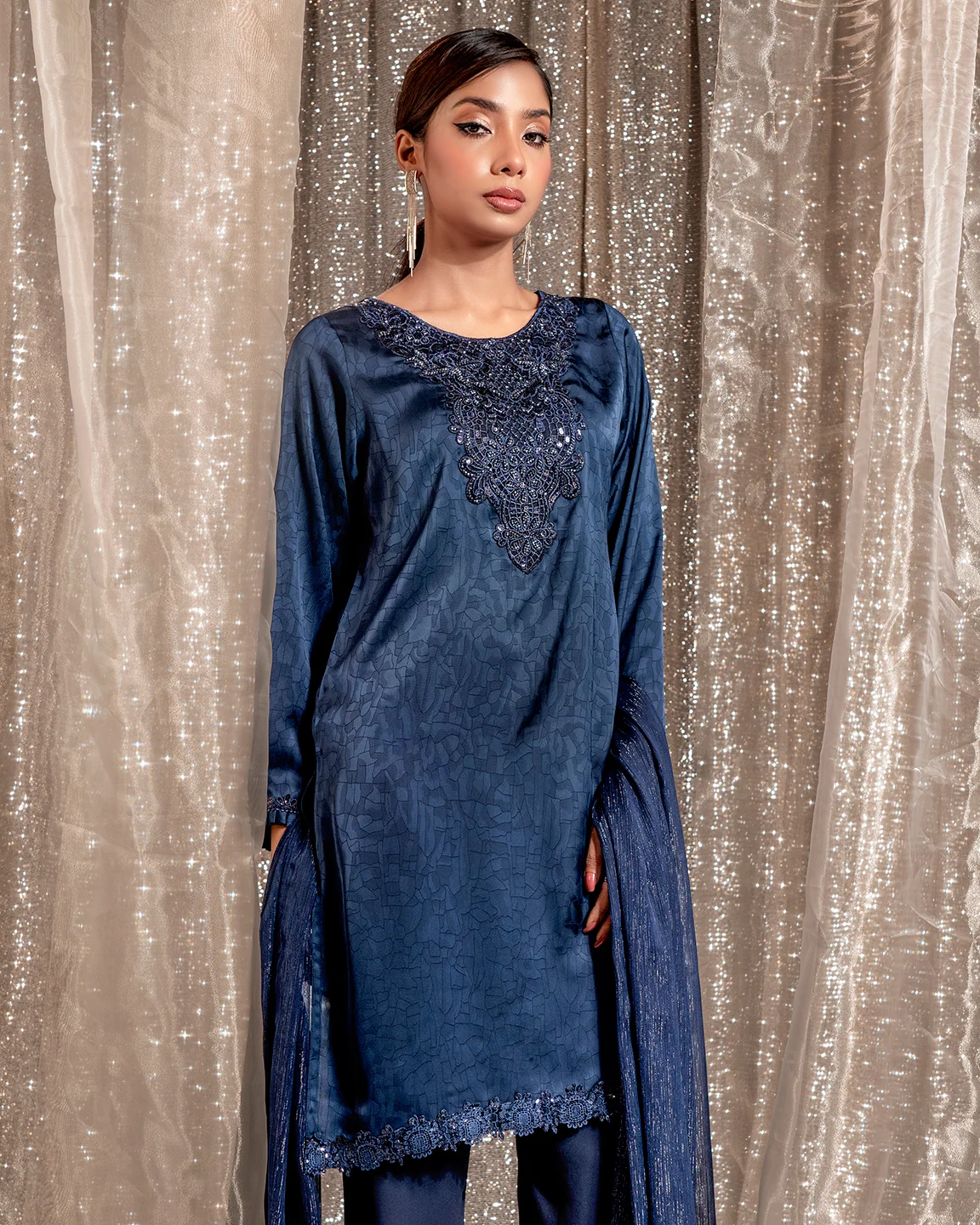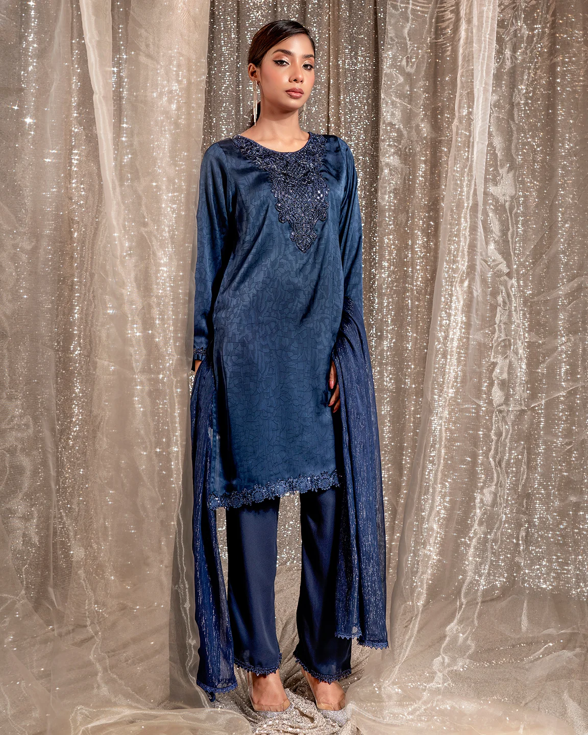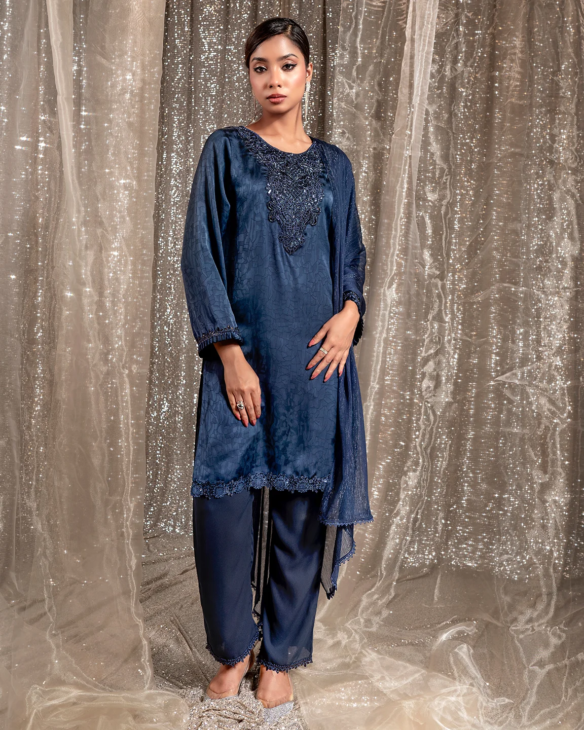 Product Details : A rich Admiral Blue kameez featuring an intricately embroidered statement neckline and delicate trim detailing on the sleeves and hem. Designed in a graceful straight silhouette for refined festive elegance.