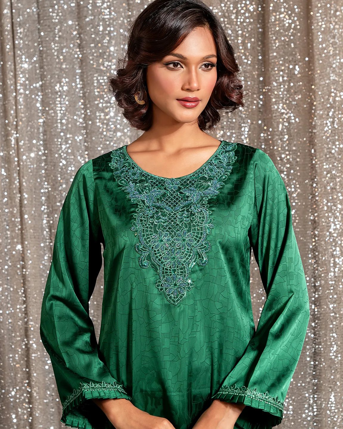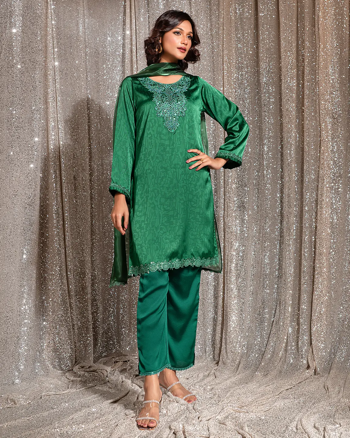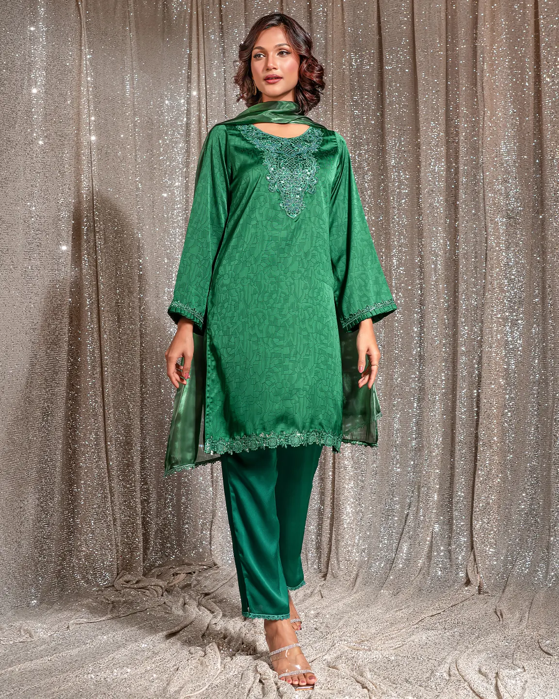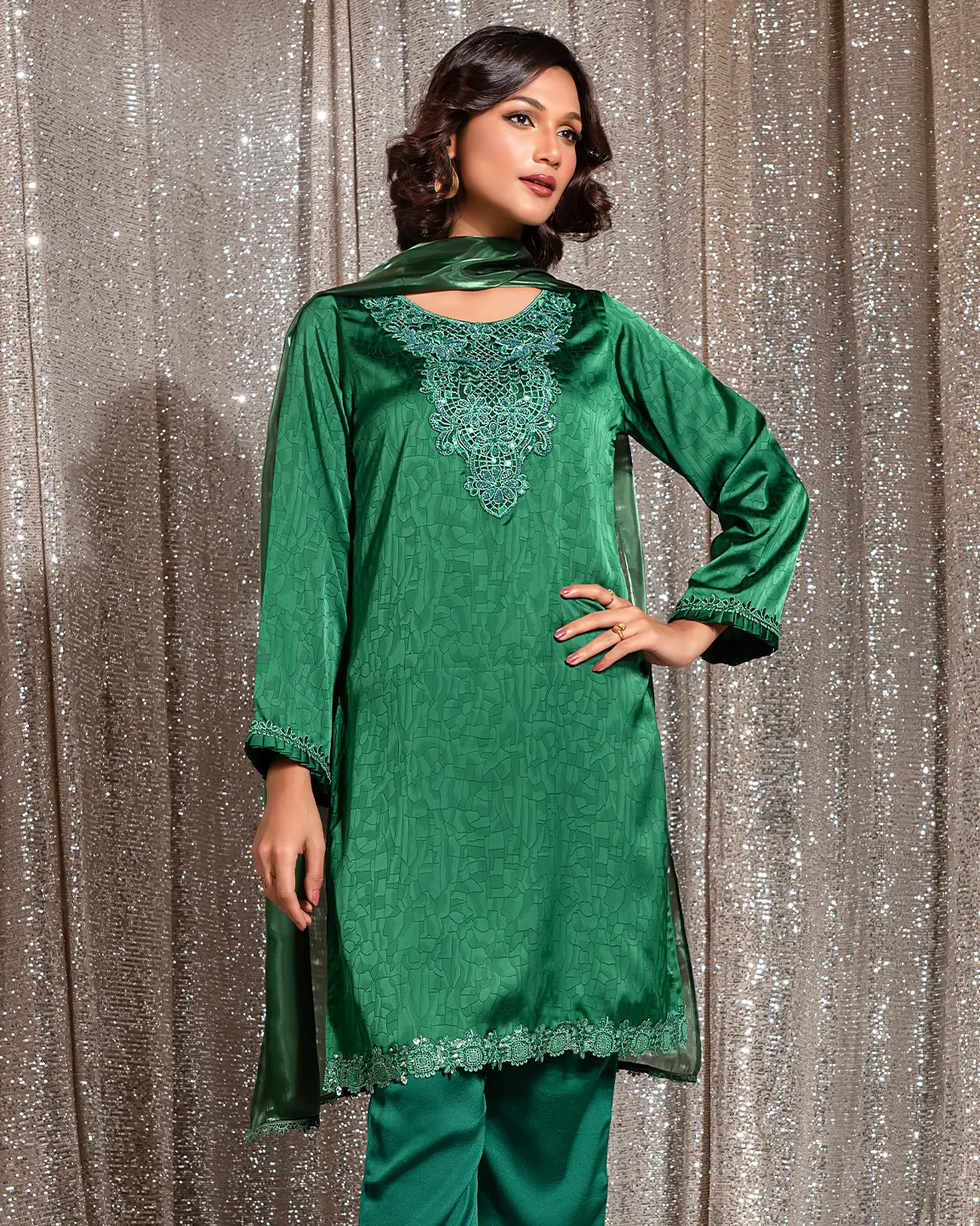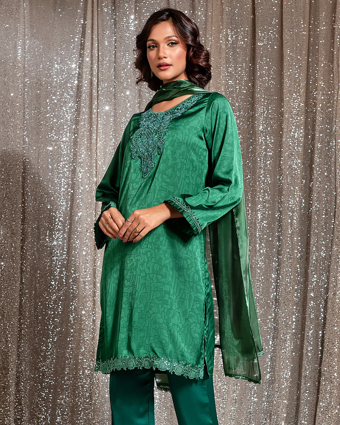 Product Details : A rich Castleton Green kameez featuring an intricately embroidered statement neckline and delicate trim detailing on the sleeves and hem. Designed in a graceful straight silhouette for refined festive elegance.