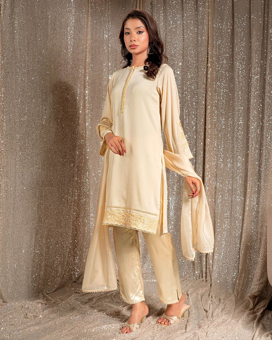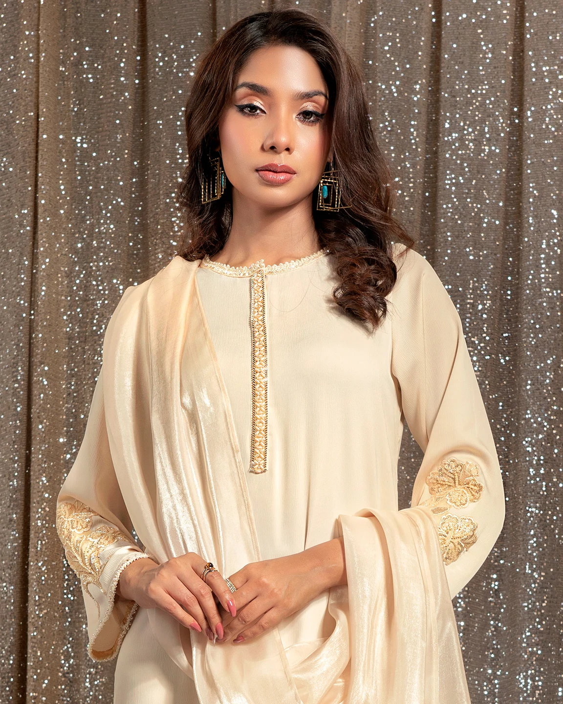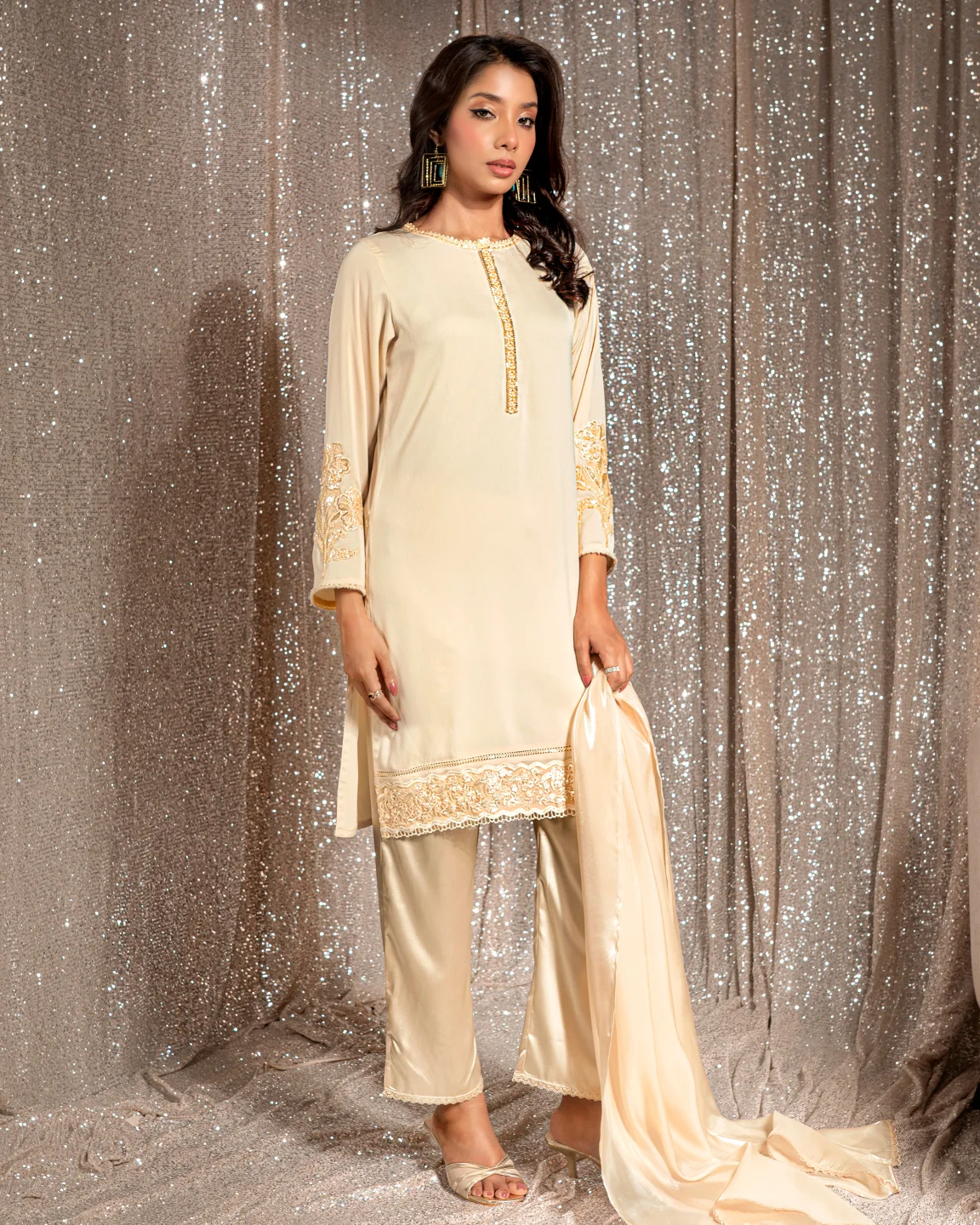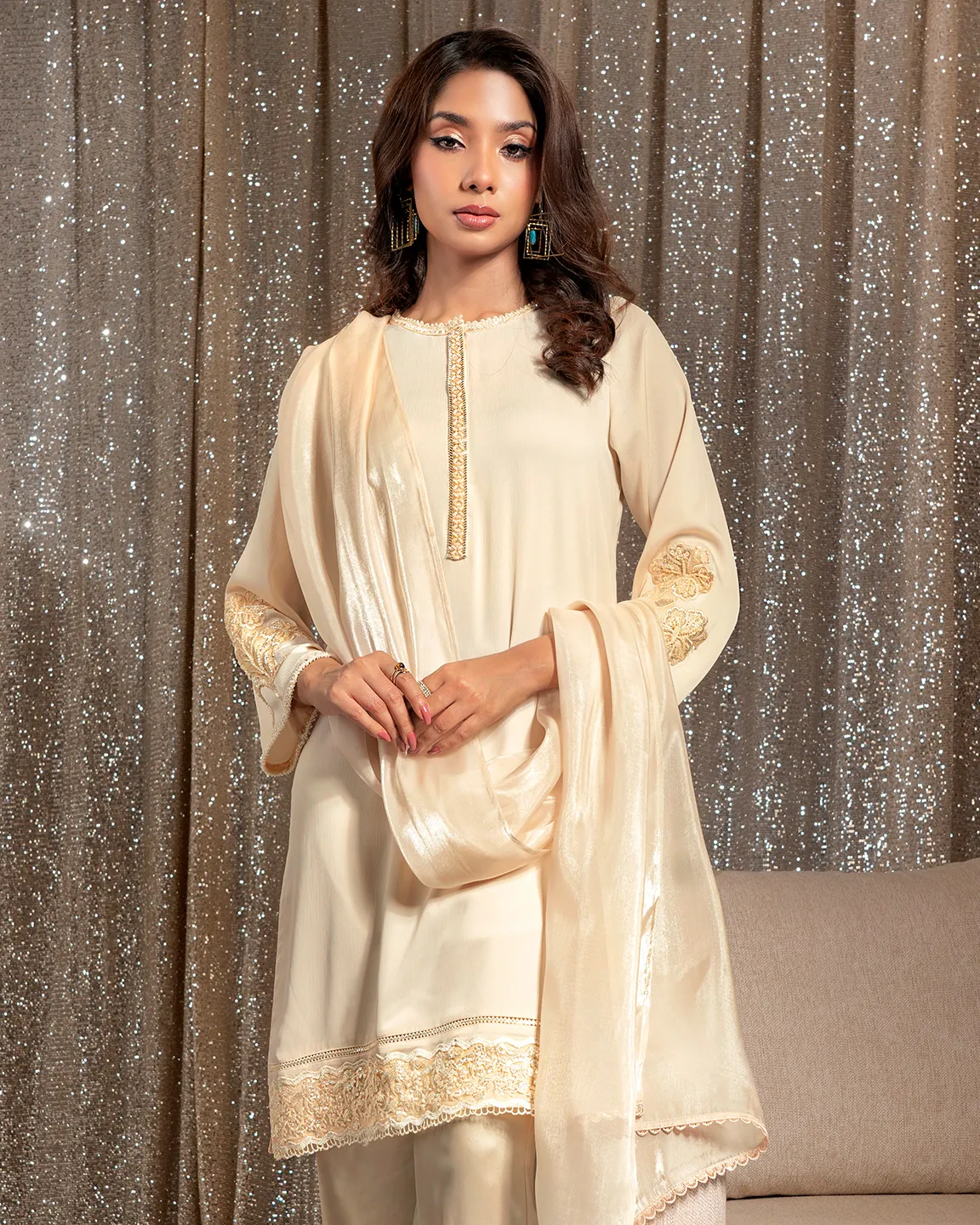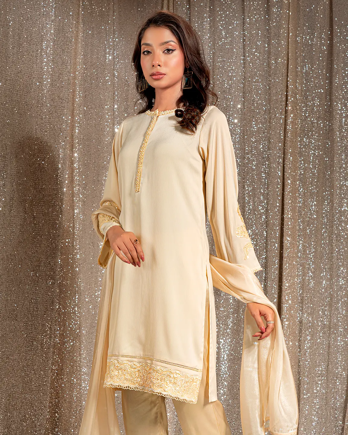 Product Details : A timeless Cream White kameez featuring a delicately embellished front placket and elegant floral embroidery on the sleeves and hem. Designed in a clean straight silhouette for refined festive sophistication.