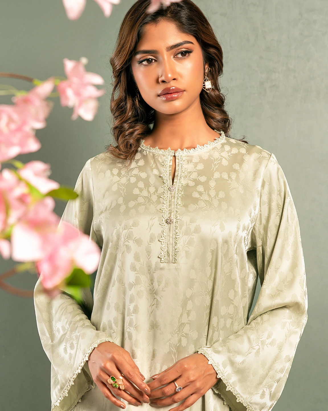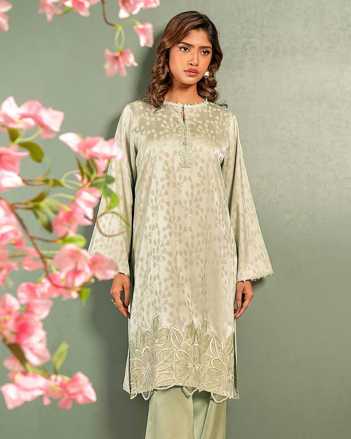 Product Details : The Luxury Double Silk Short Kameez features a fusion neckline adorned with intricate karchupi work. The full-length sleeves are embellished with elegant lace detailing, while the hemline is finished with delicate lace accents. Side slits on both sides ensure comfort and ease to movement.