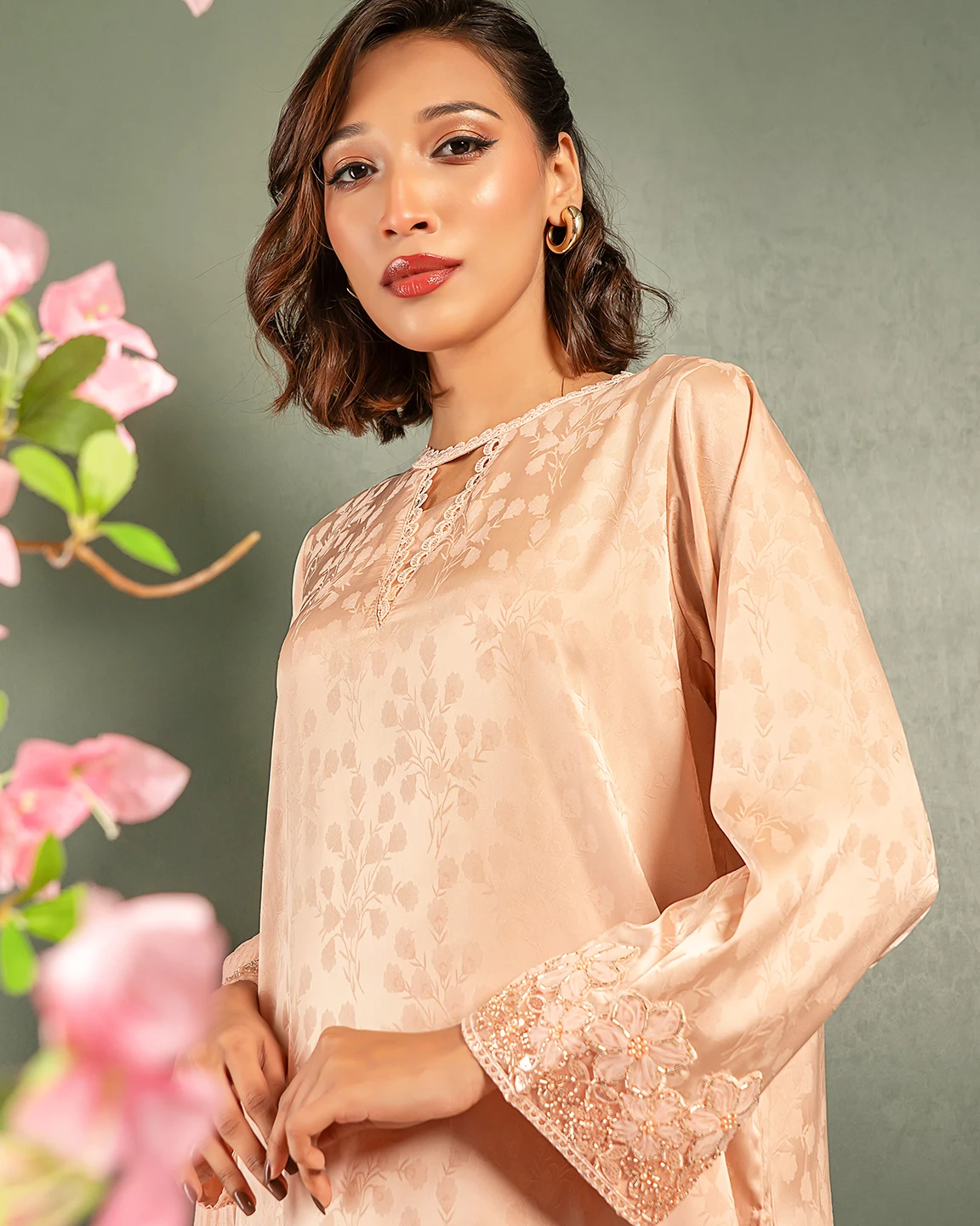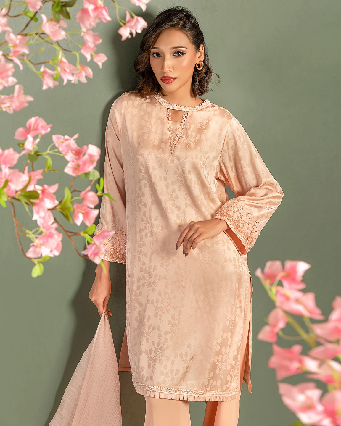 Product Details : Luxury double silk straight fit short kameez has fusion round neck with lace work in details, has full sleeve and sleeve hemline has karchupi details, hemline has lace and ruffle work details.