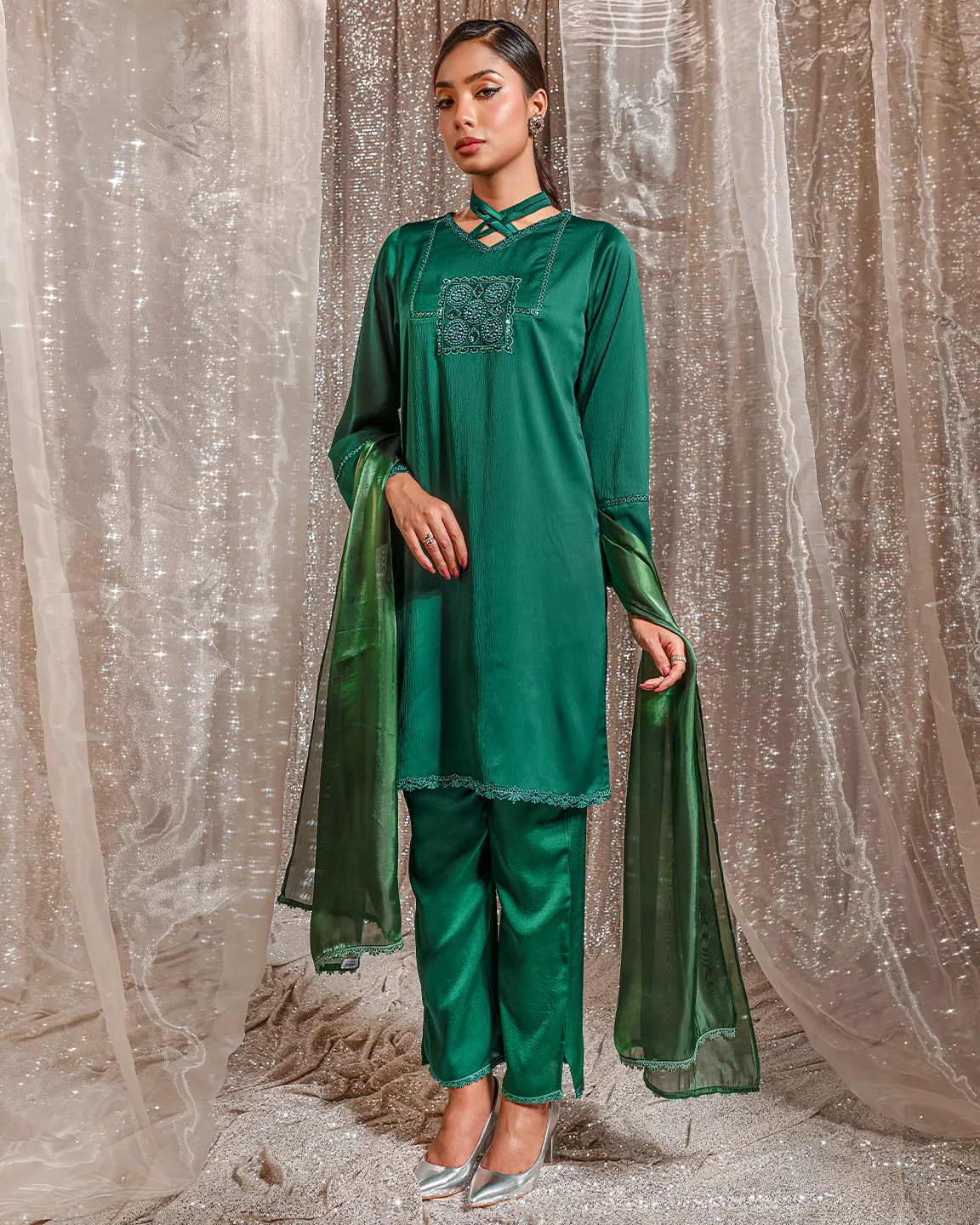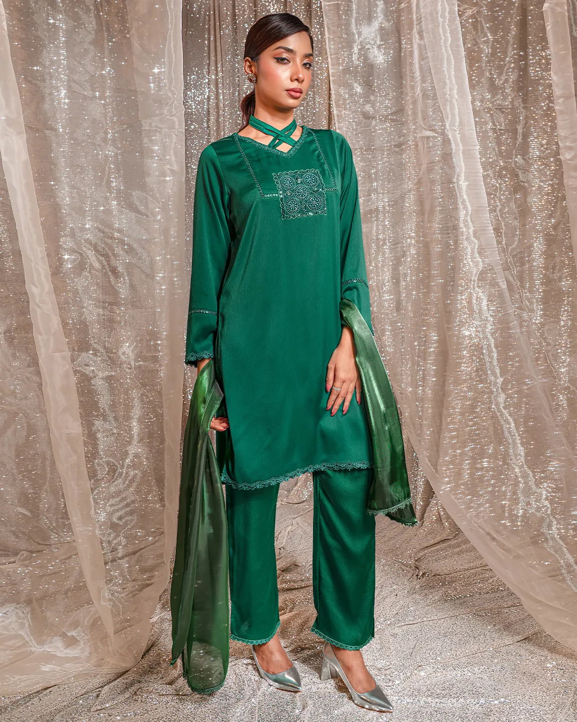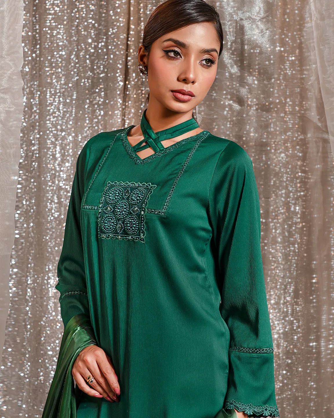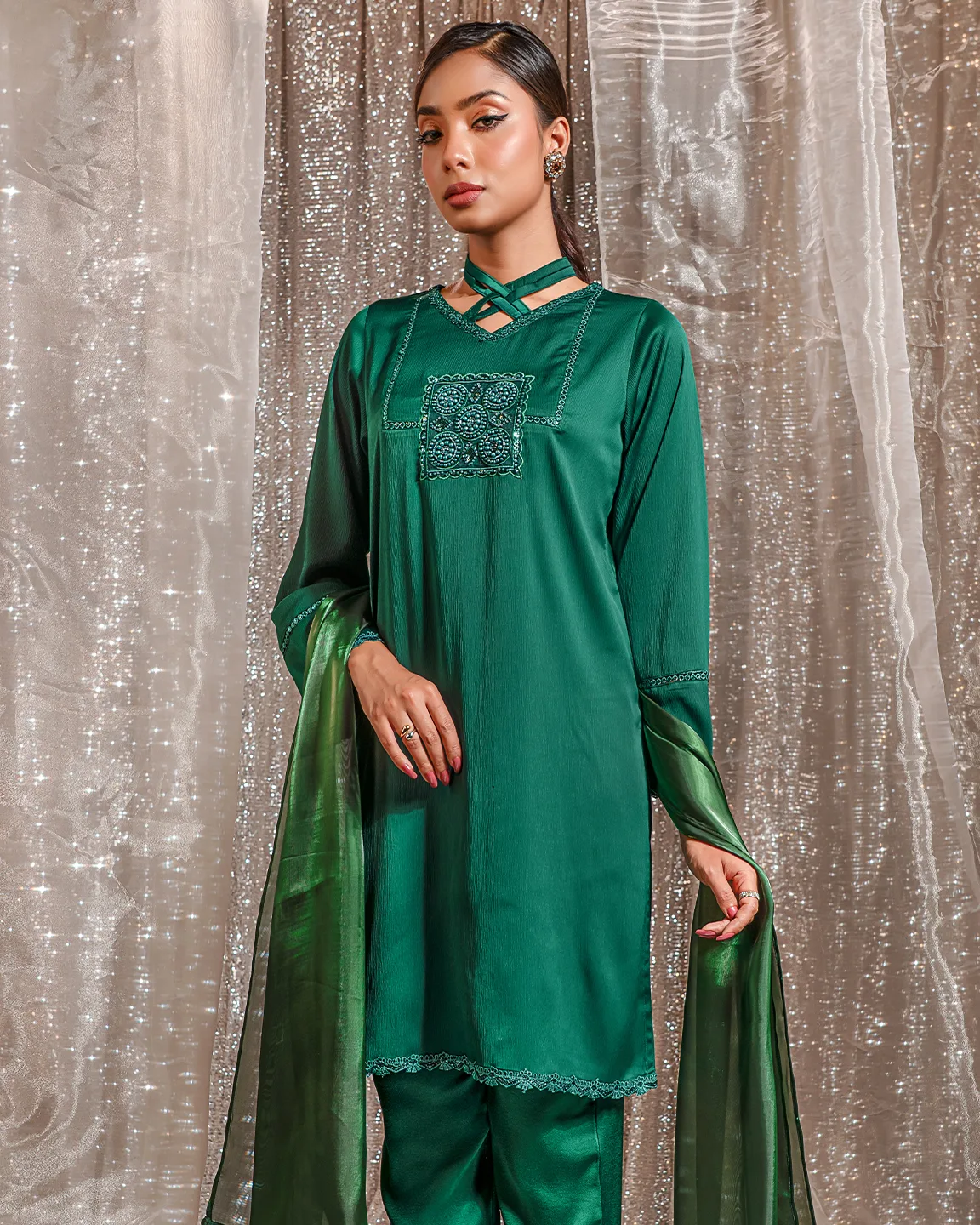 Product Details: A graceful Bottle Green kameez featuring a modern criss-cross neckline and a delicately embroidered front panel detail. The silhouette is finished with subtle trim accents on the sleeves and hem, creating a refined festive look perfect for Eid celebrations and elegant evening gatherings.