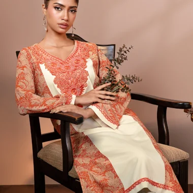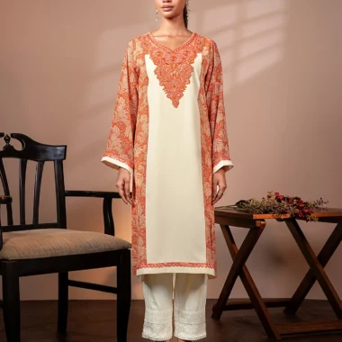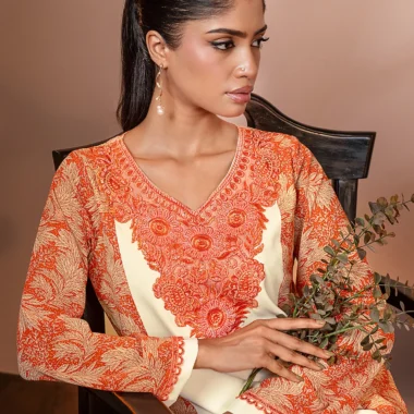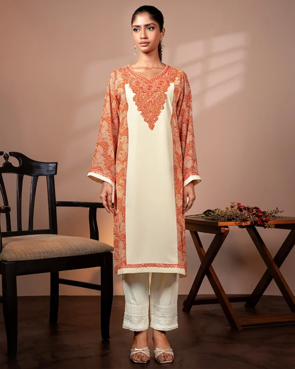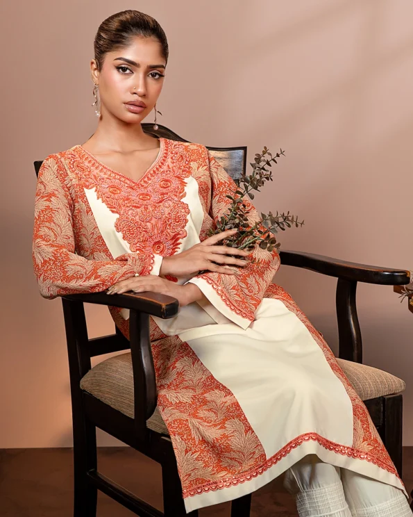 A vibrant blend of tradition and modern elegance, this cream long kameez features intricate tangerine embroidery along the neckline and front panel. Paired with printed sleeves and lace-detailed, it’s a refreshing choice for festive wear.