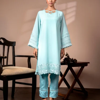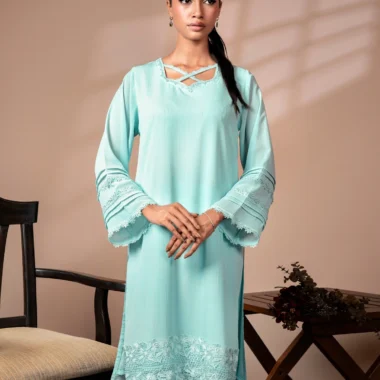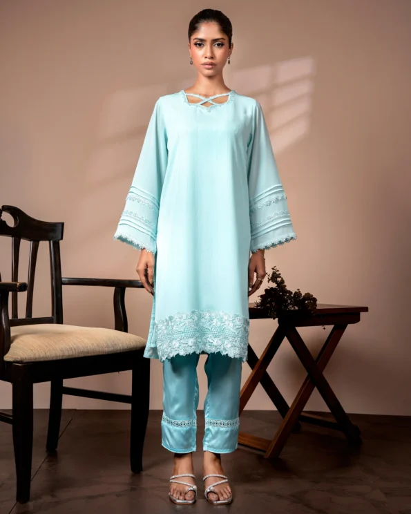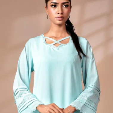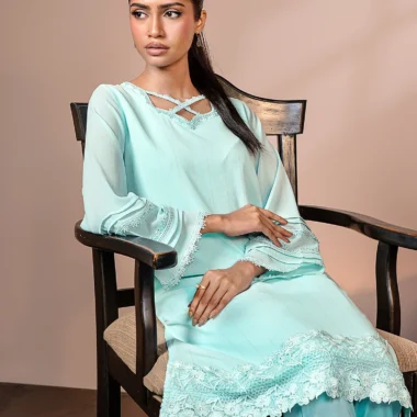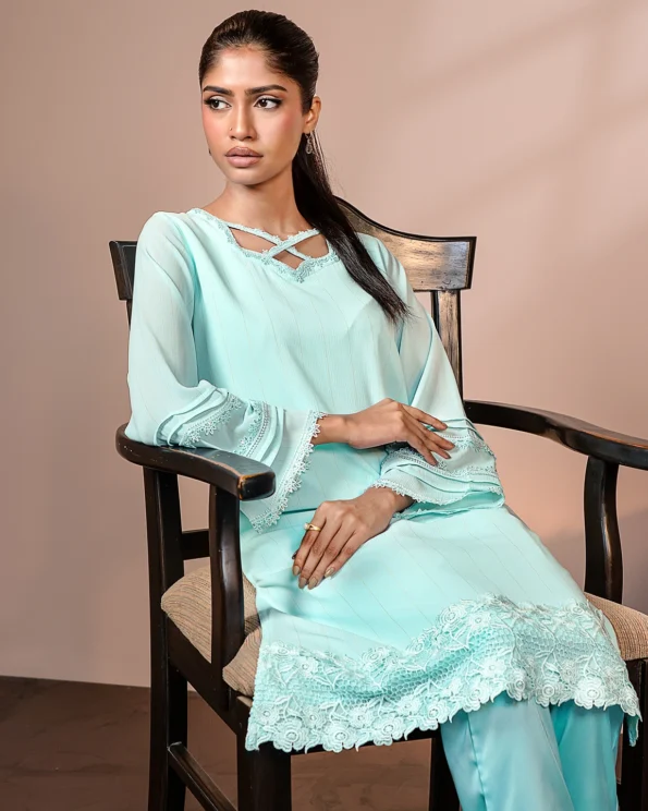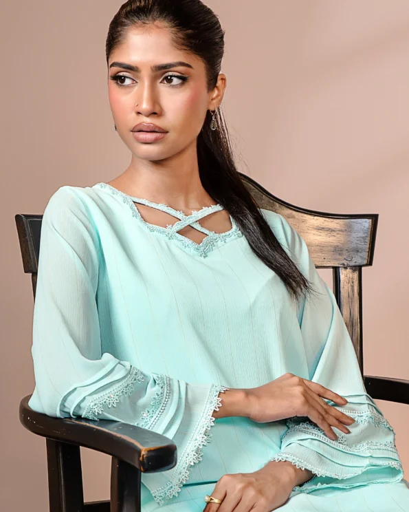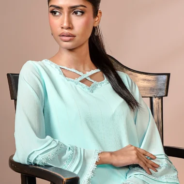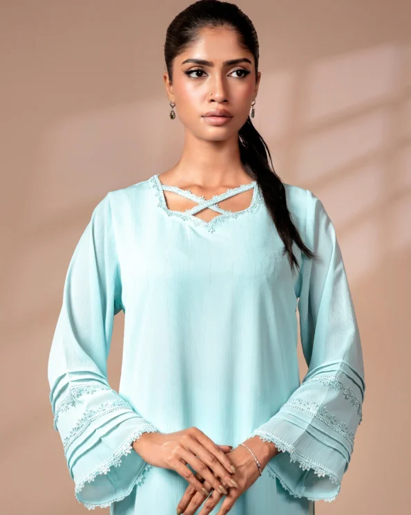 Feminine and fresh, this powder blue crepe short kameez is detailed with lace embroidery on the hem and sleeves, paired with delicate pin tuck lines and a crossover neckline for a soft yet structured look. A dreamy choice for daytime events and semi-formal gatherings.