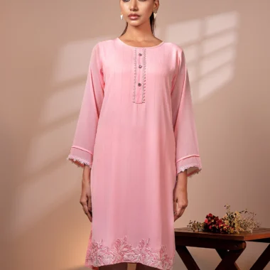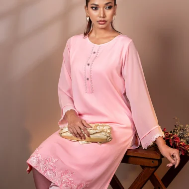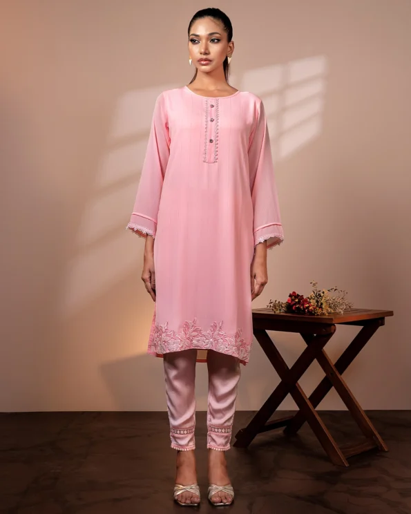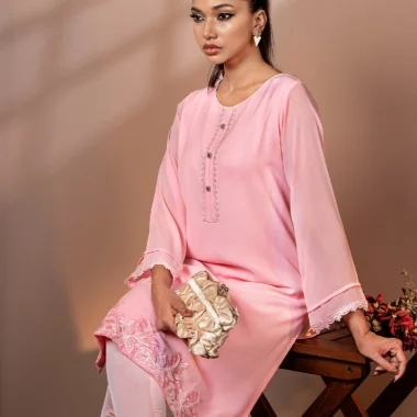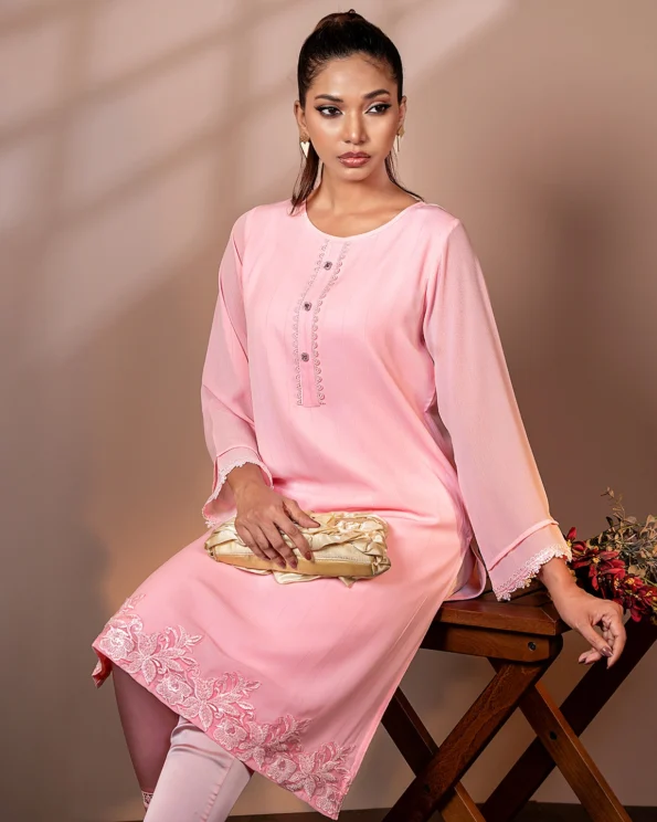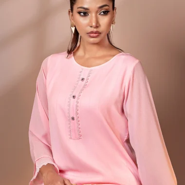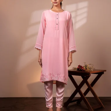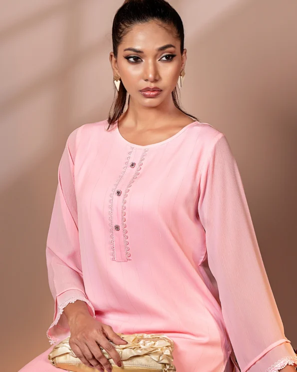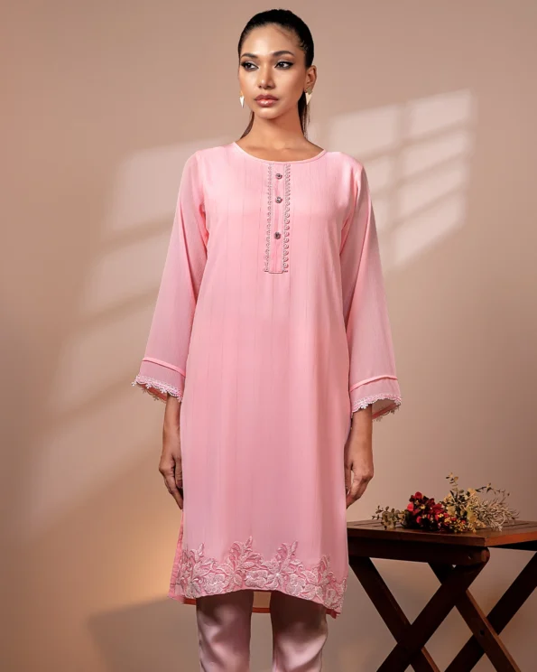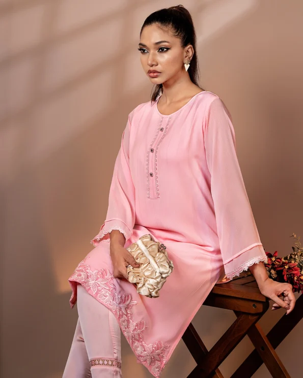 Soft, graceful, and detailed to perfection, this baby pink designer long kameez is tailored in textured crepe georgette and enhanced with subtle zari embroidery along the hem and sleeves. The front placket features delicate button embellishments, paired with tonal embroidered pants for a complete festive-ready look.