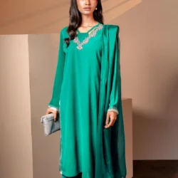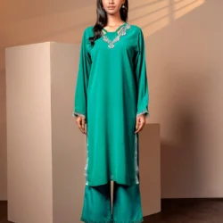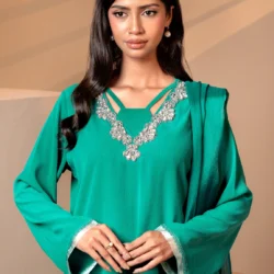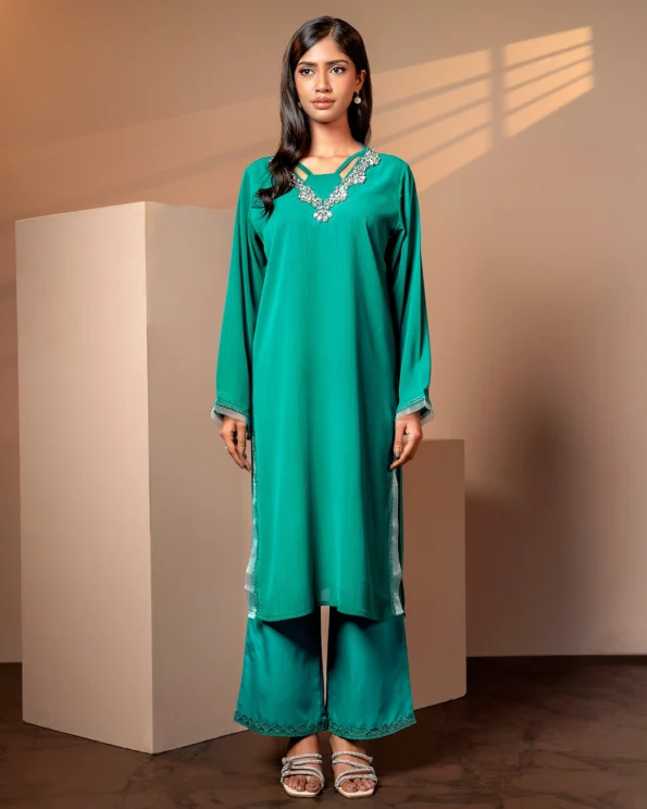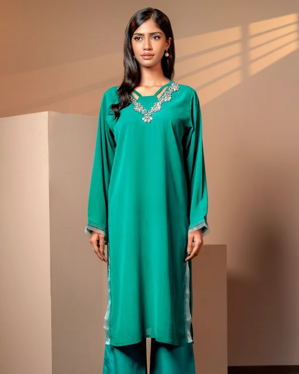 A soft, graceful pick for day-to-evening elegance. This Blue Green kameez features intricate hand embellishment on the neckline and lace details, making it a perfect fit for subtle celebrations or elevated everyday wear.