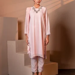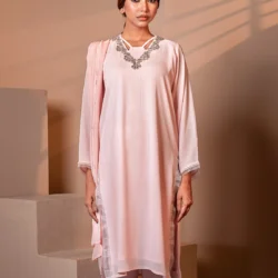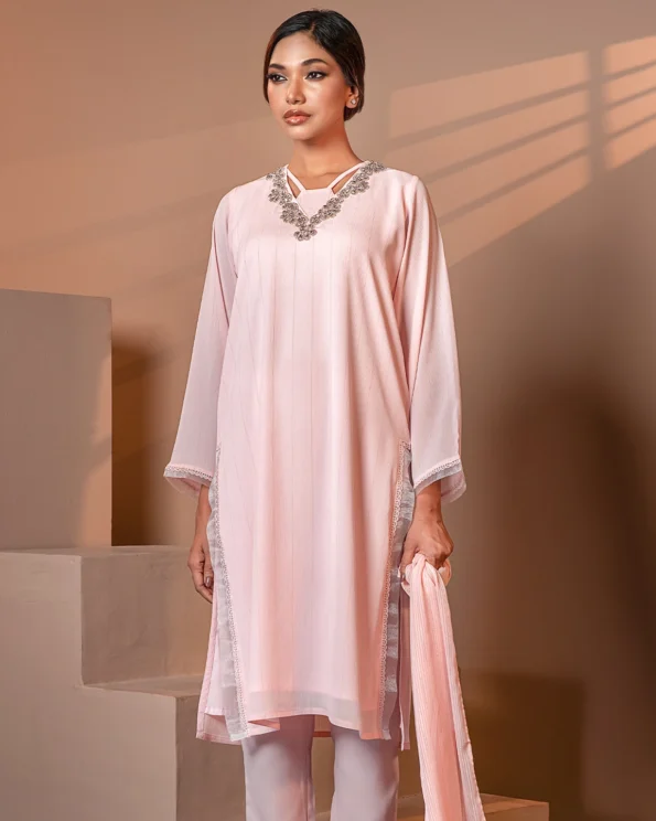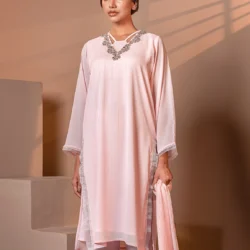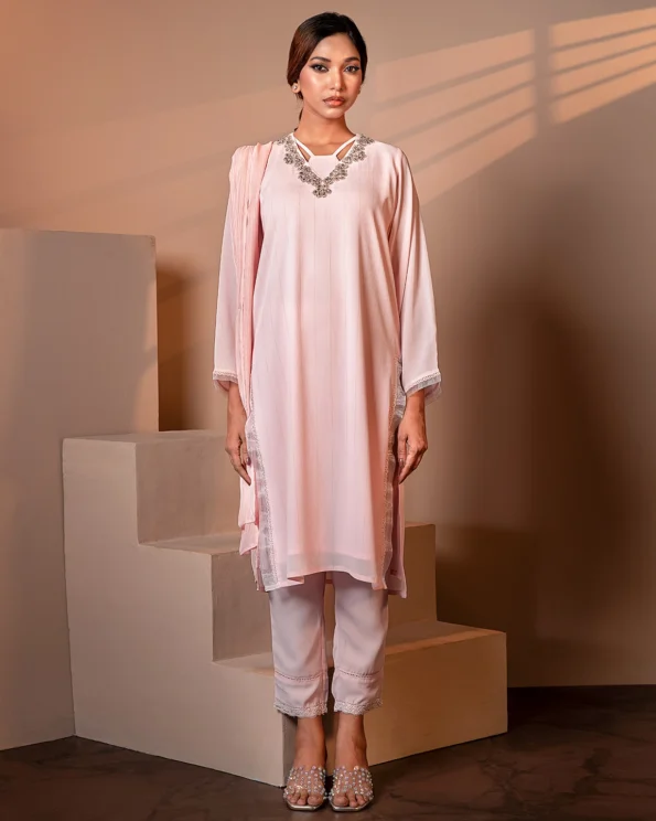 A soft, graceful pick for day-to-evening elegance. This Crepe Pink long kameez features intricate hand embellishment on the neckline and lace details, making it a perfect fit for subtle celebrations or elevated everyday wear.