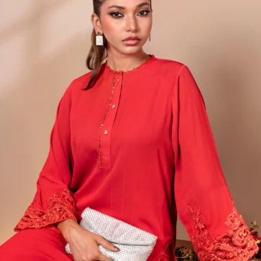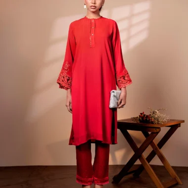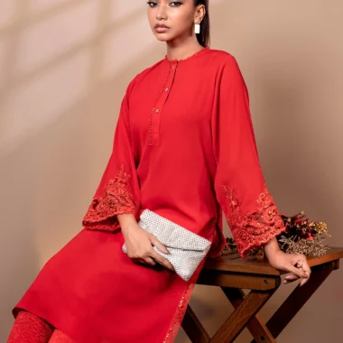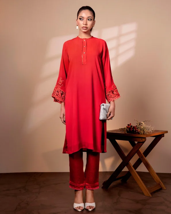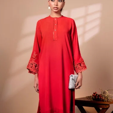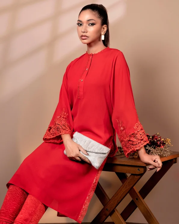Bold and elegant, this Imperial Red designer long kameez is crafted from textured crepe georgette and finished with shimmering zari and sequin embroidery on the sleeves. A statement piece perfect for festive nights and formal occasions.