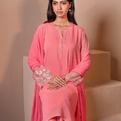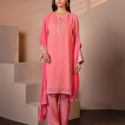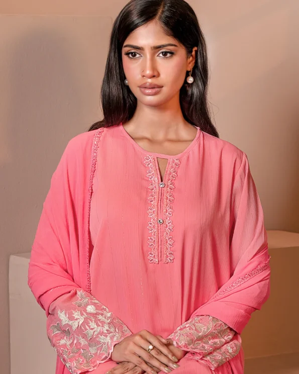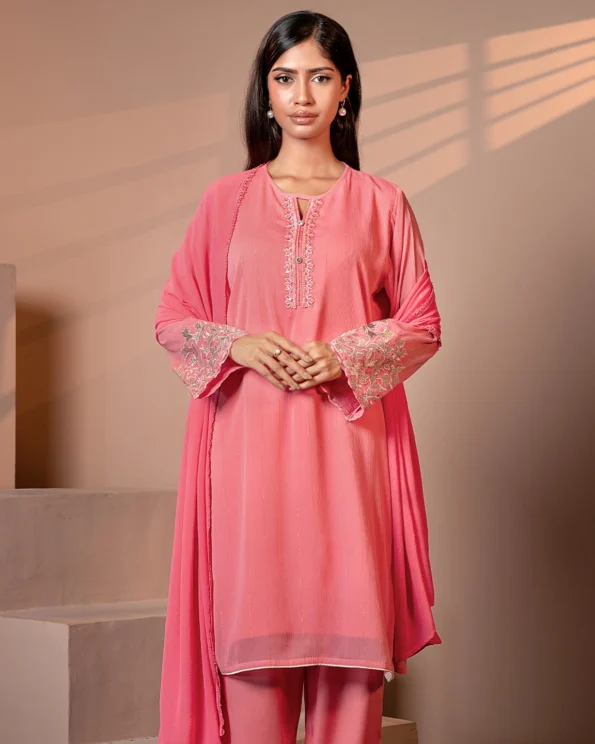 A delicate blend of femininity and charm, this Water melon Pink embroidered kameez features floral threadwork on the sleeves and a flowing silhouette, ideal for brunch dates, meetups, or soft festive days.