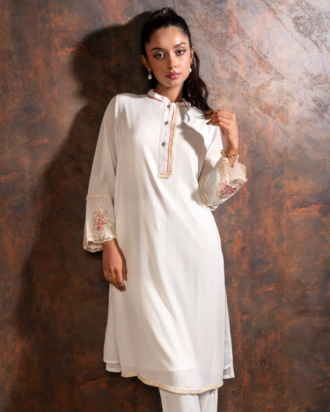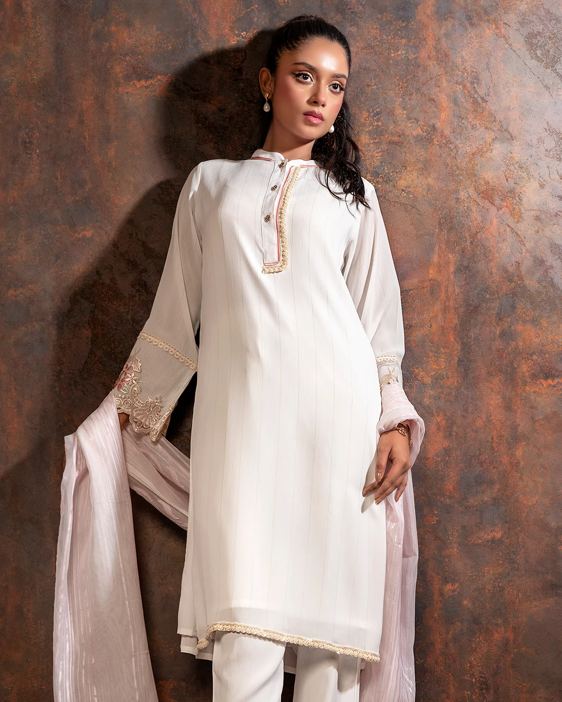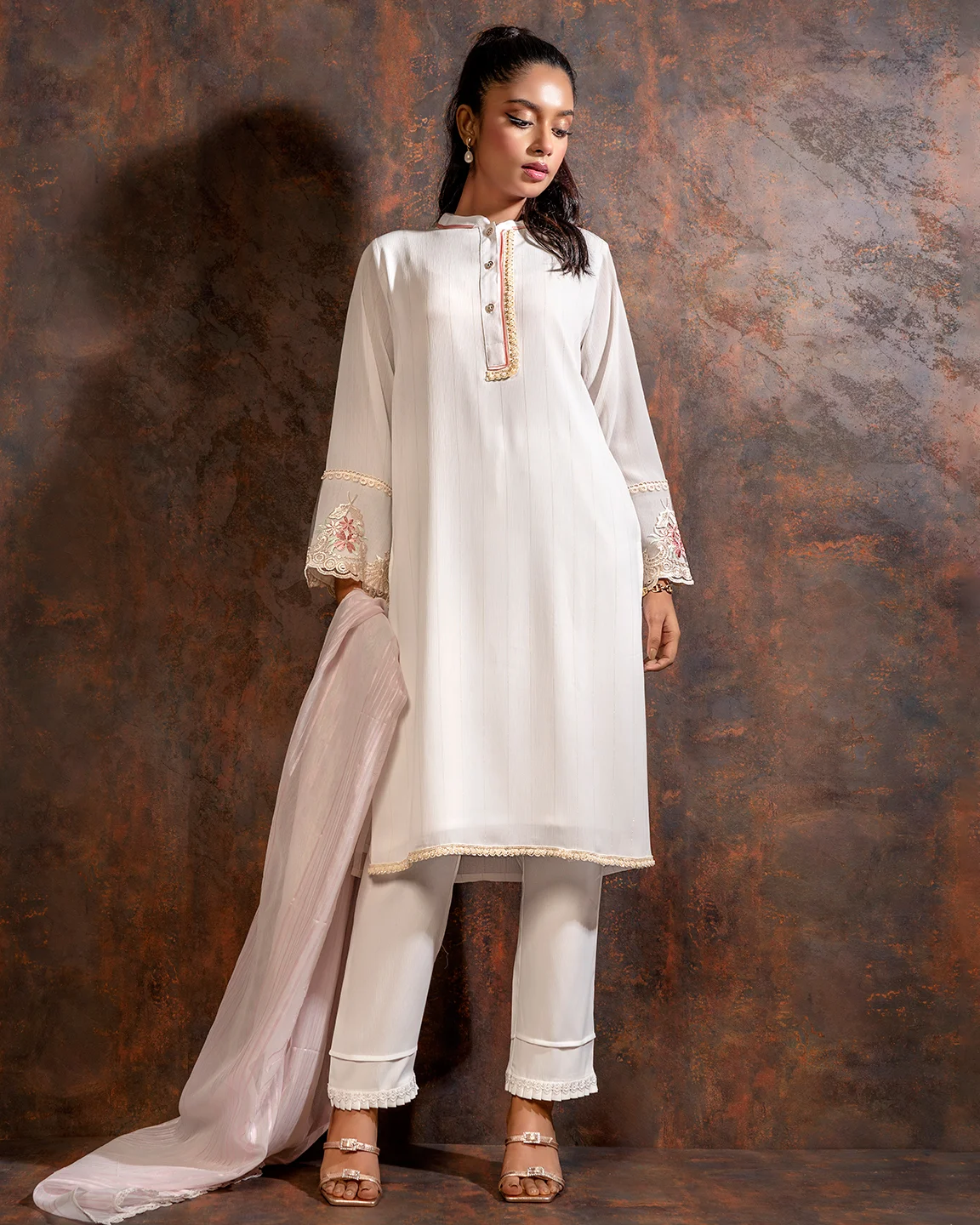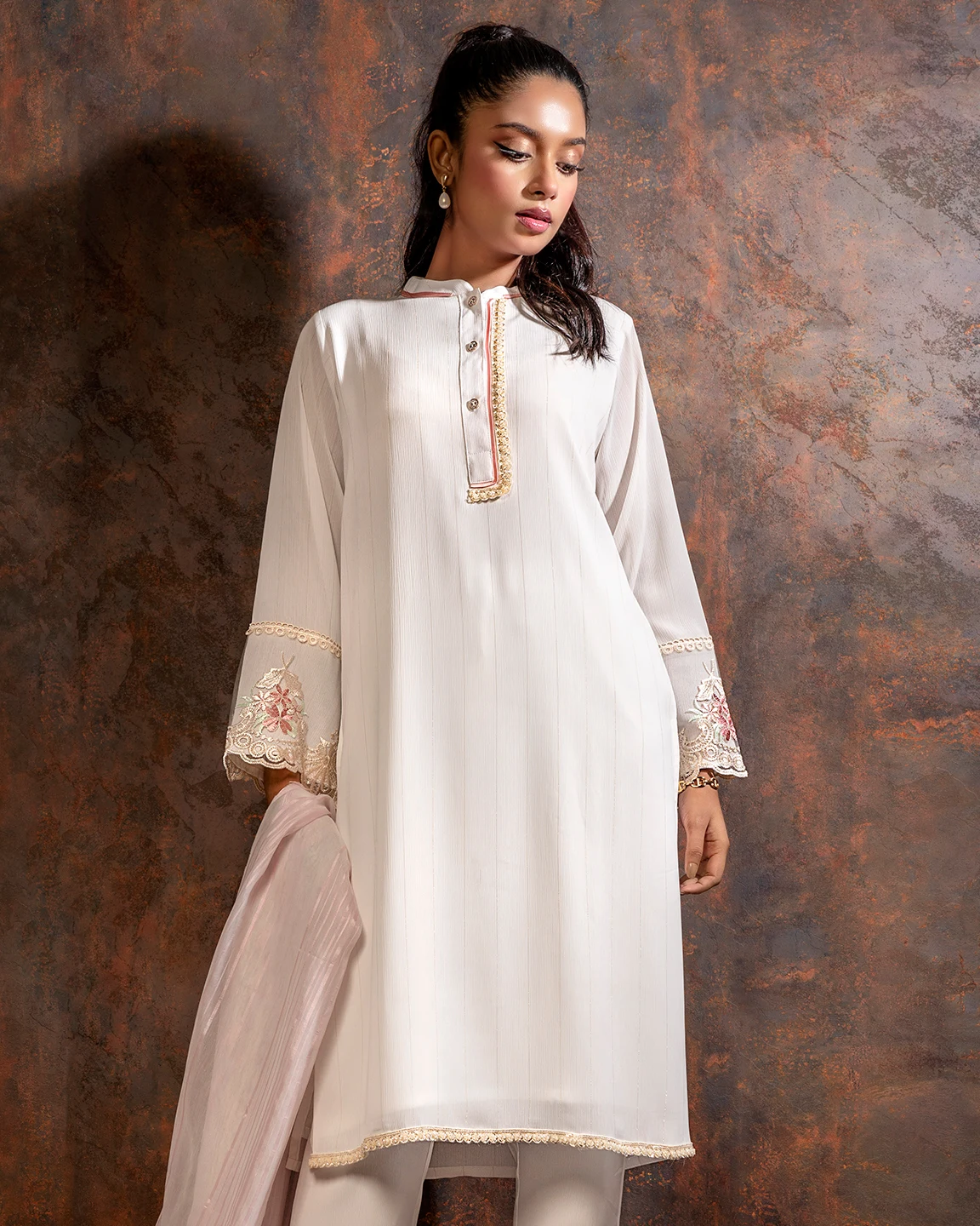 Product Details: Graceful and timeless, this Whisper White Zari Crepe Georgette set features intricate thread embroidery on the hem and cuffs, paired with straight pants and a lightweight dupatta. A perfect pick for daytime events, festive gatherings, or elegant evening wear.