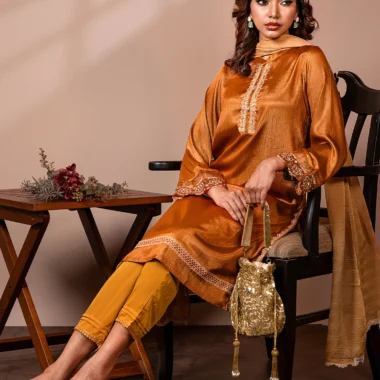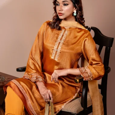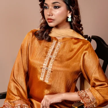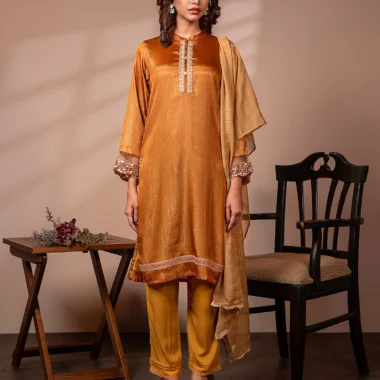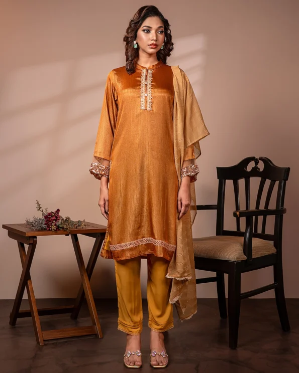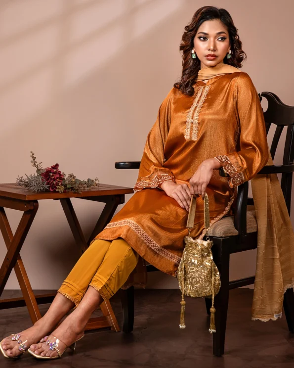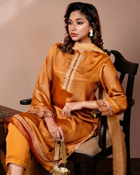 Crafted from luxurious crinkle silk, this burnt gold designer long kameez features delicate zari embroidery and lace detailing on the sleeves and hem. It’s perfect for wedding guests and festive evenings.
