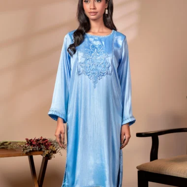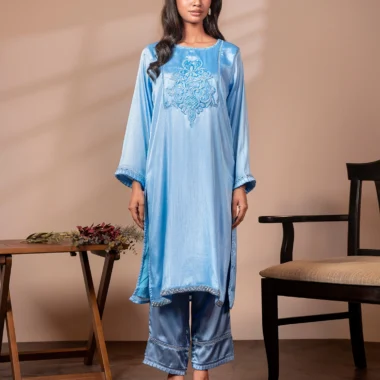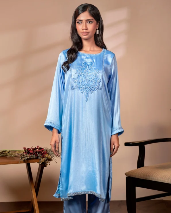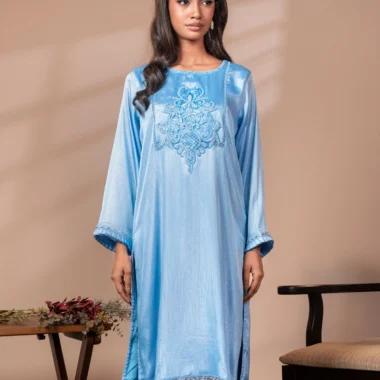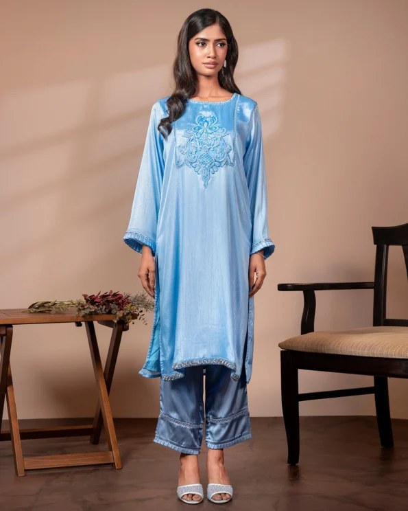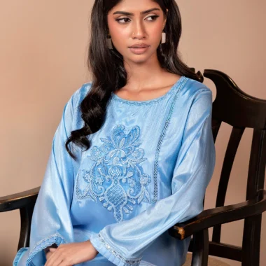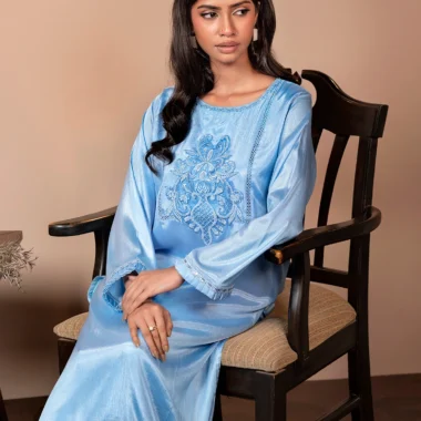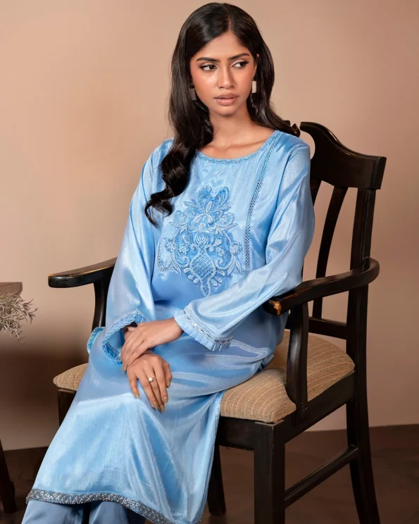 Breezy and radiant, this sky blue long kameez is crafted from lightweight luxury textured silk and adorned with elegant central embroidery and silver sequin highlights. A graceful blend of comfort and festive charm.