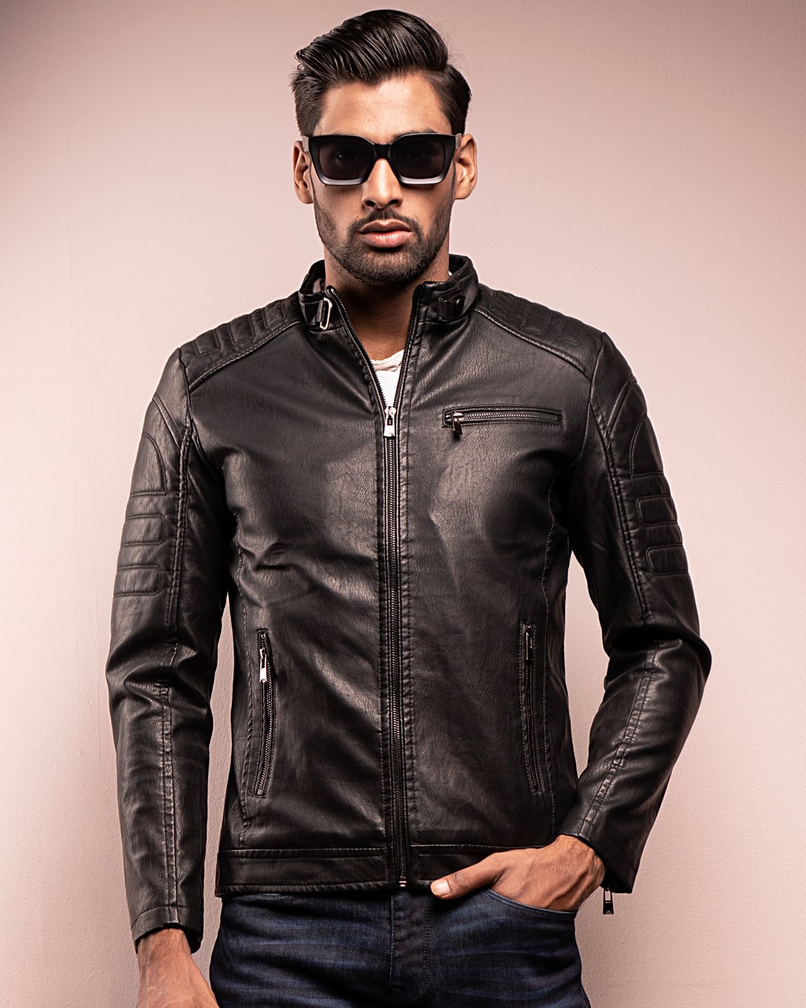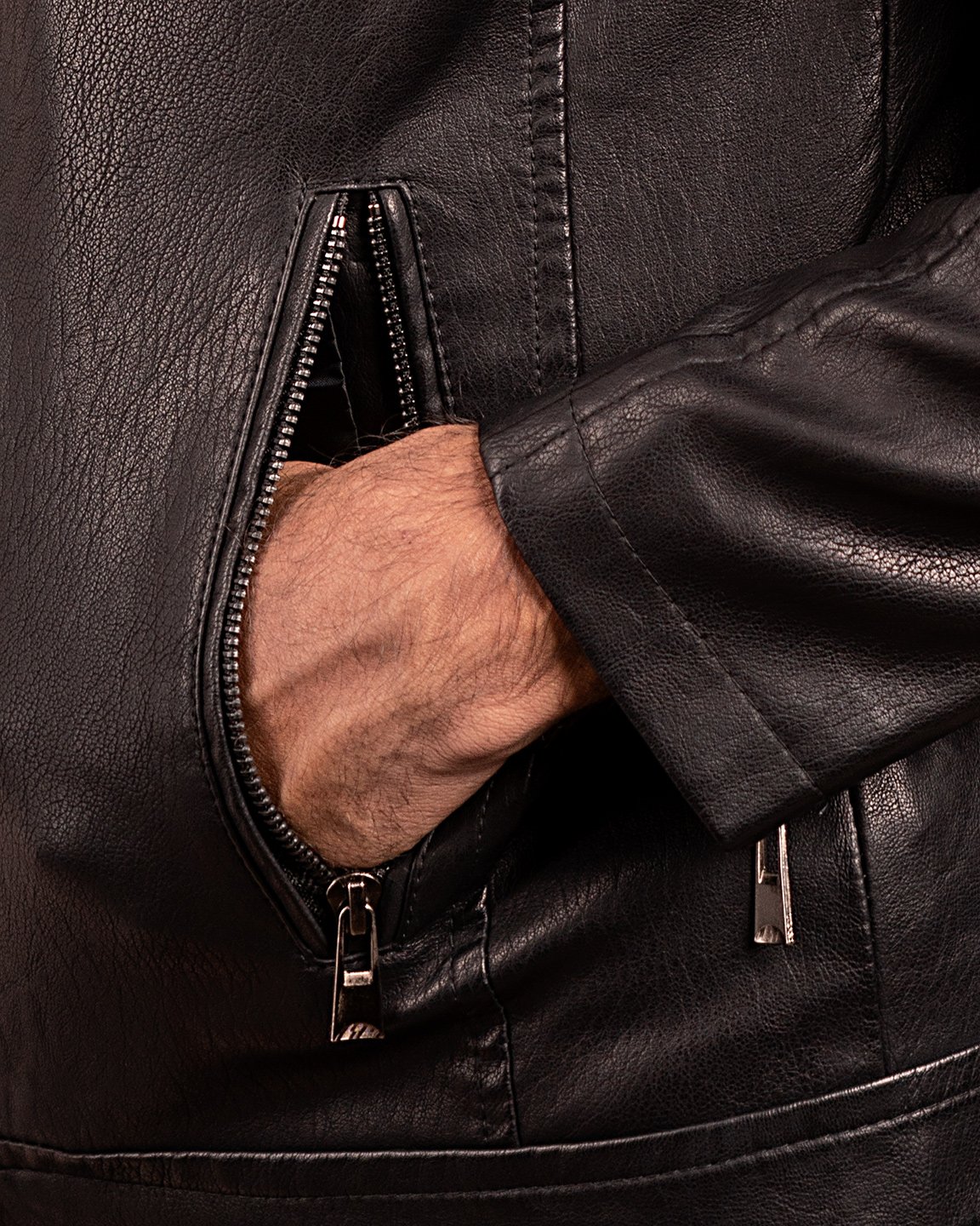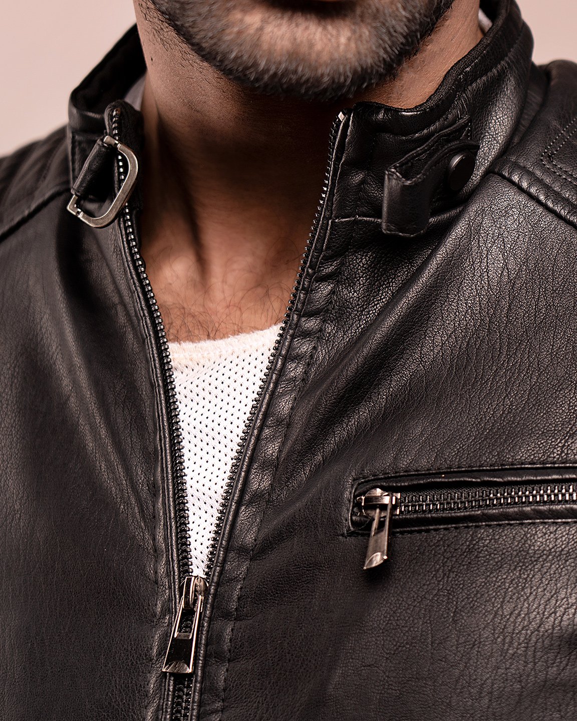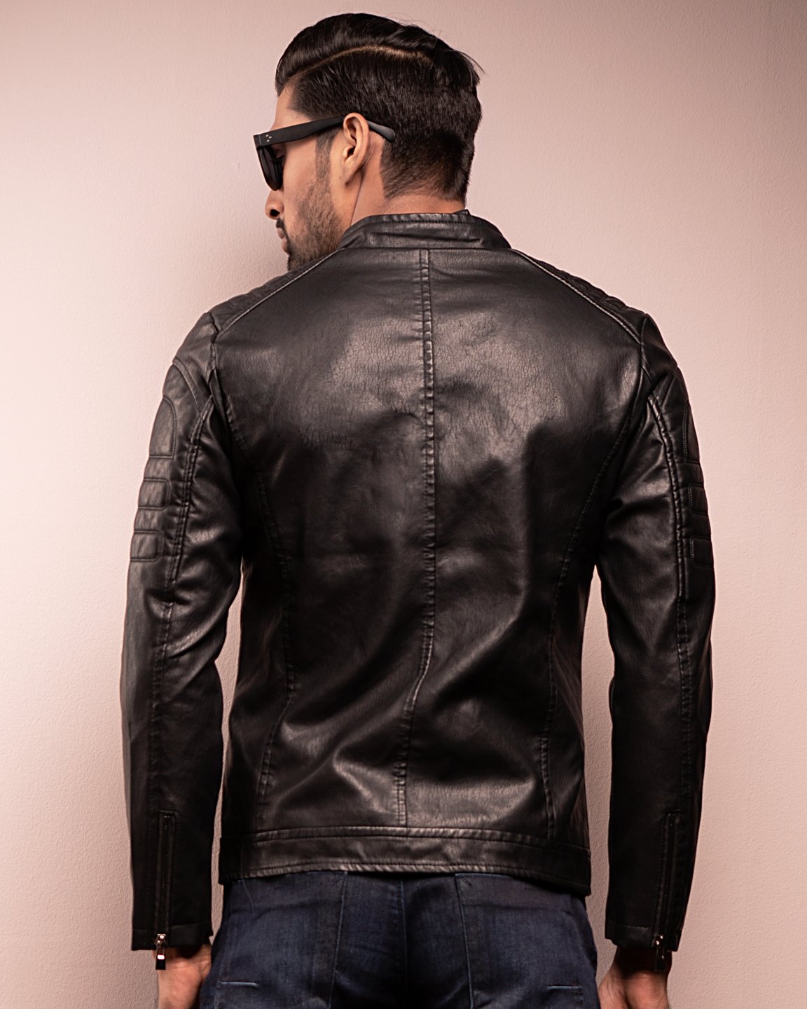 Stand-up-collar with loop button faux leather jacket, Long sleeve with zip cuff, Shoulder and sleeve padding,