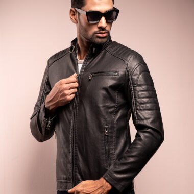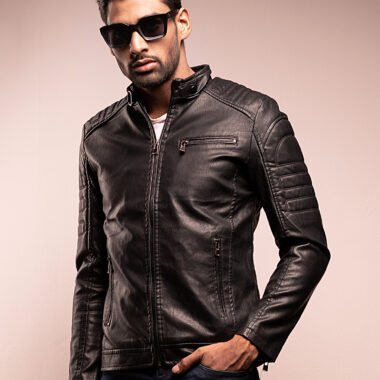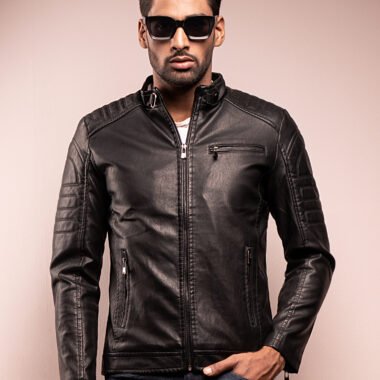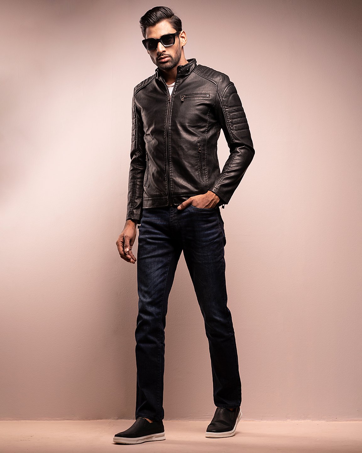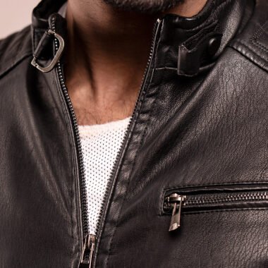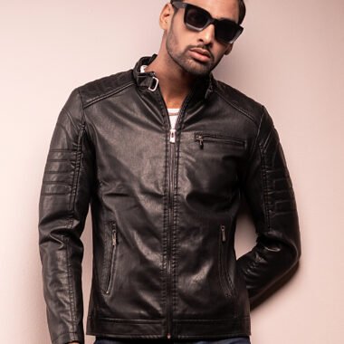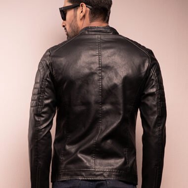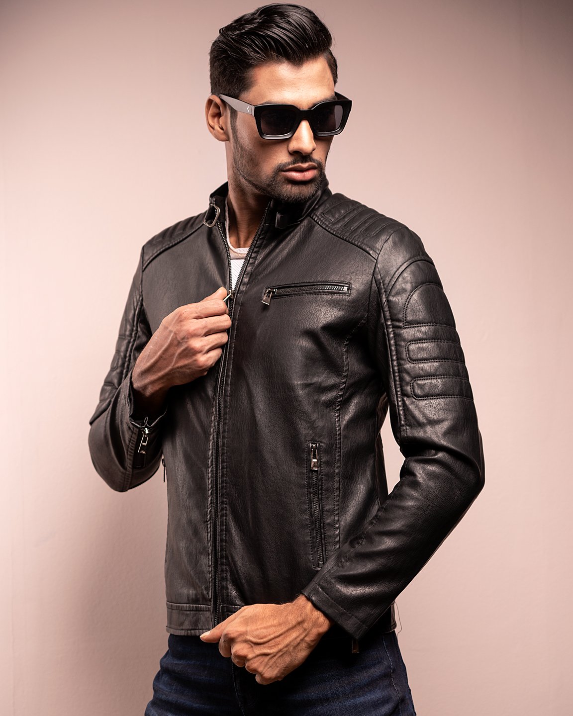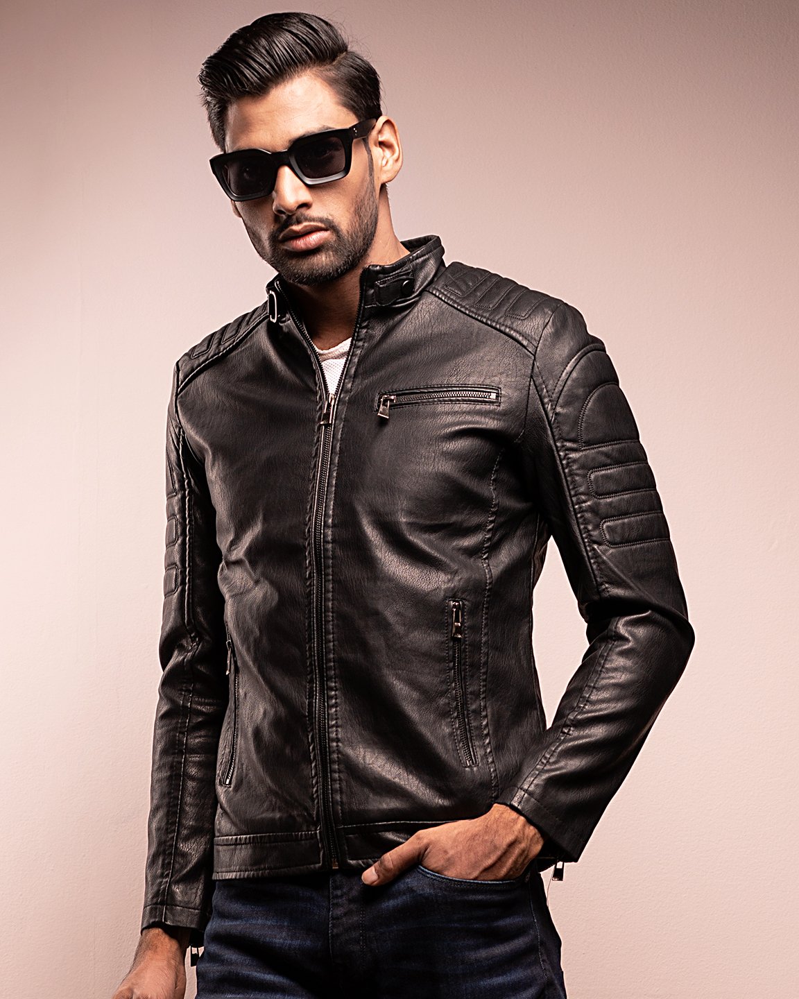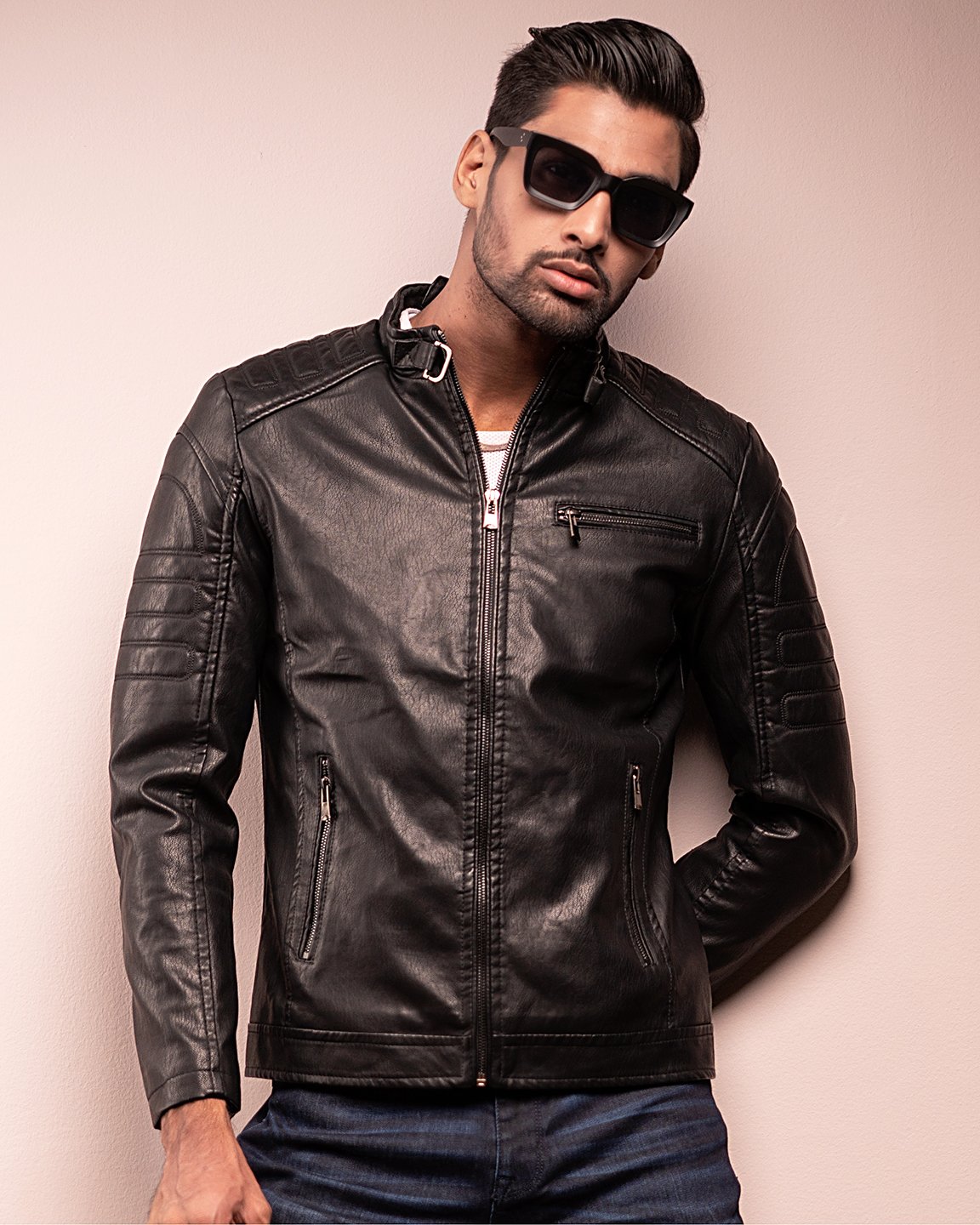 Stand-up-collar with loop button faux leather jacket, Long sleeve with zip cuff, Shoulder and sleeve padding,
