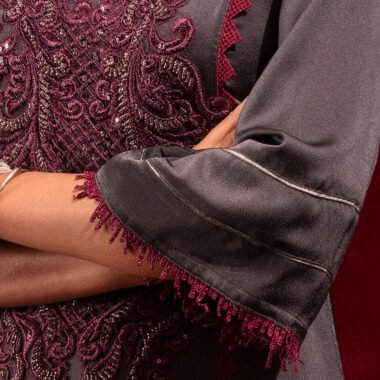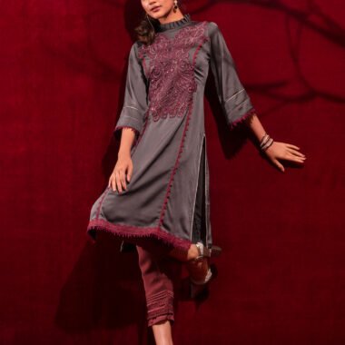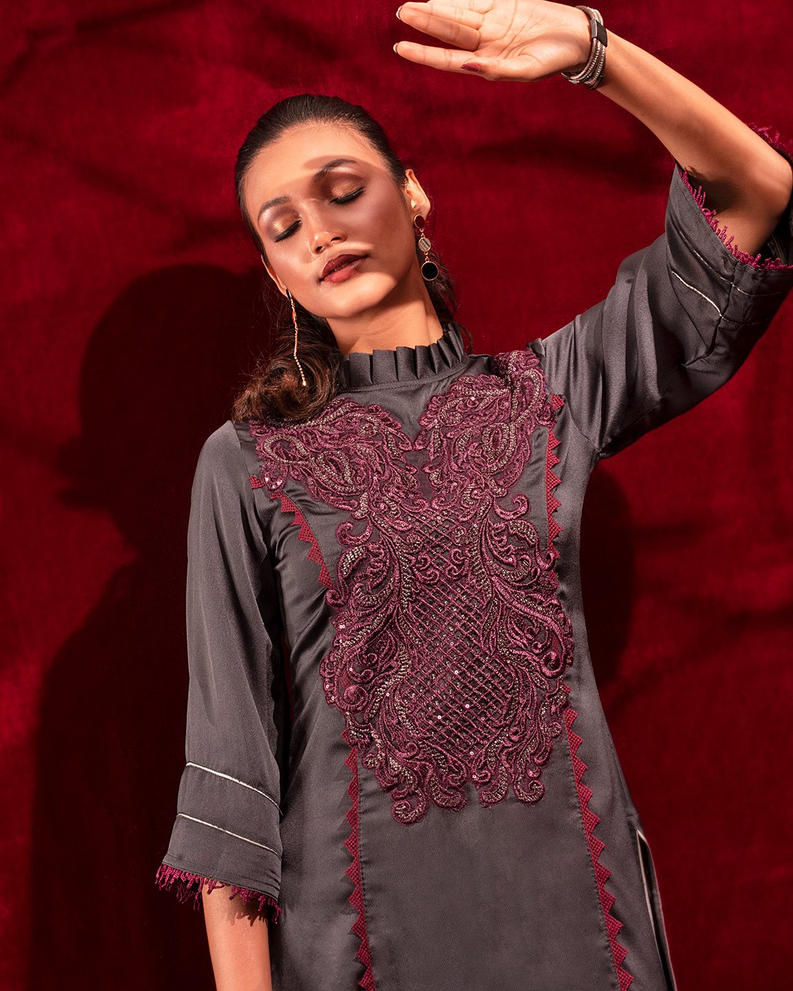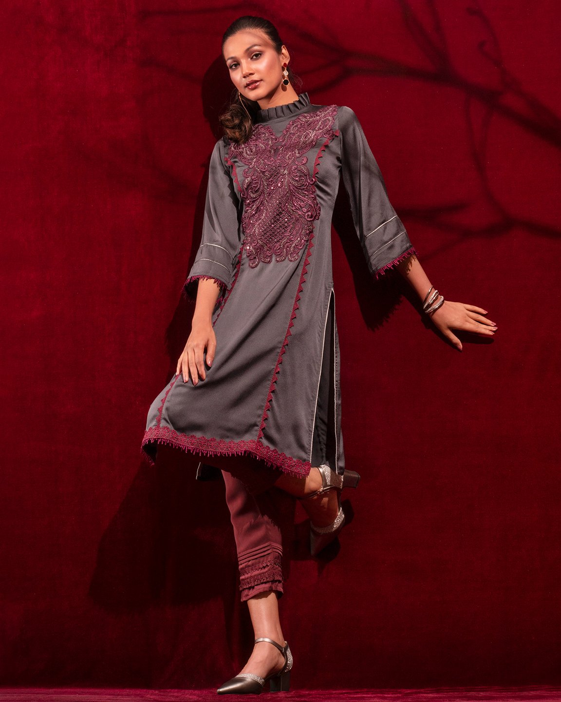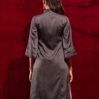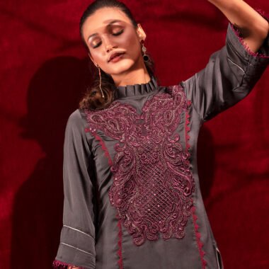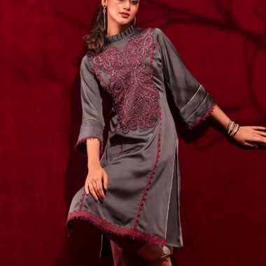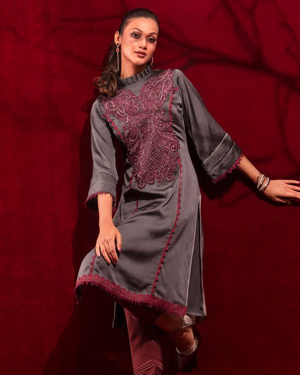 Sold OutCrepe A-line long kameez has band collar with ruffle, has front mid armhole princess line cut with lace details, has front hemline lace details , both side slits with contrast, front part has hand embroidery work, has three quarter flared sleeve with contrast & lace details.