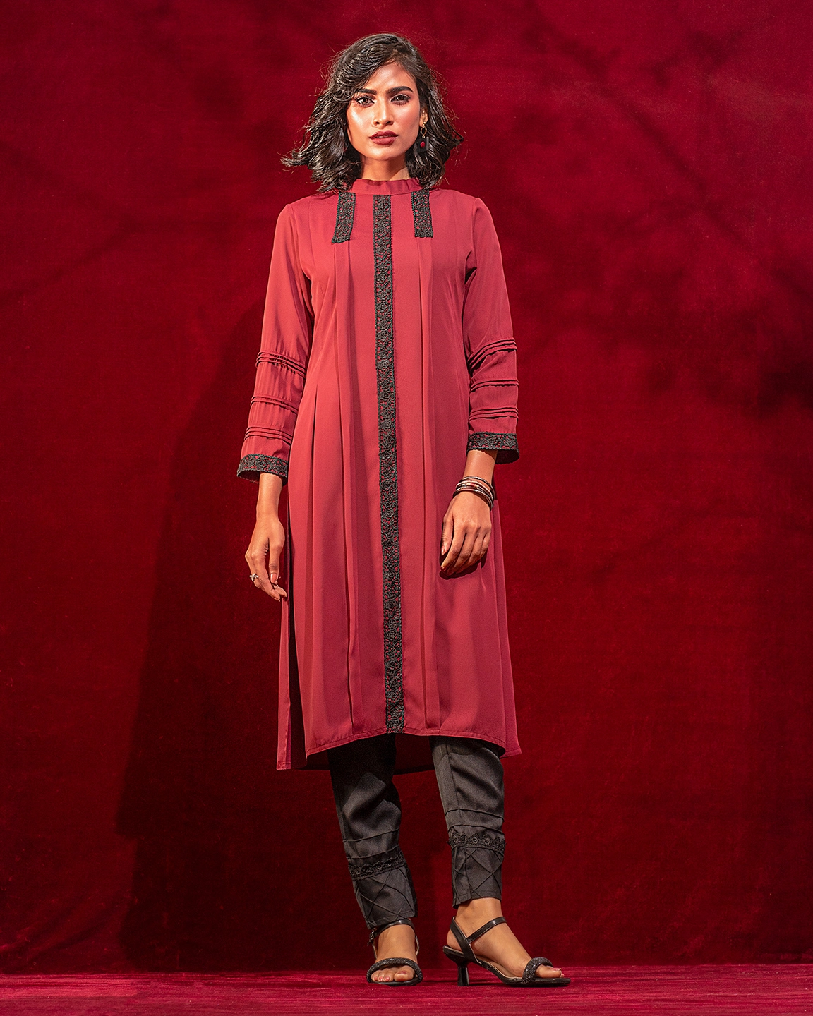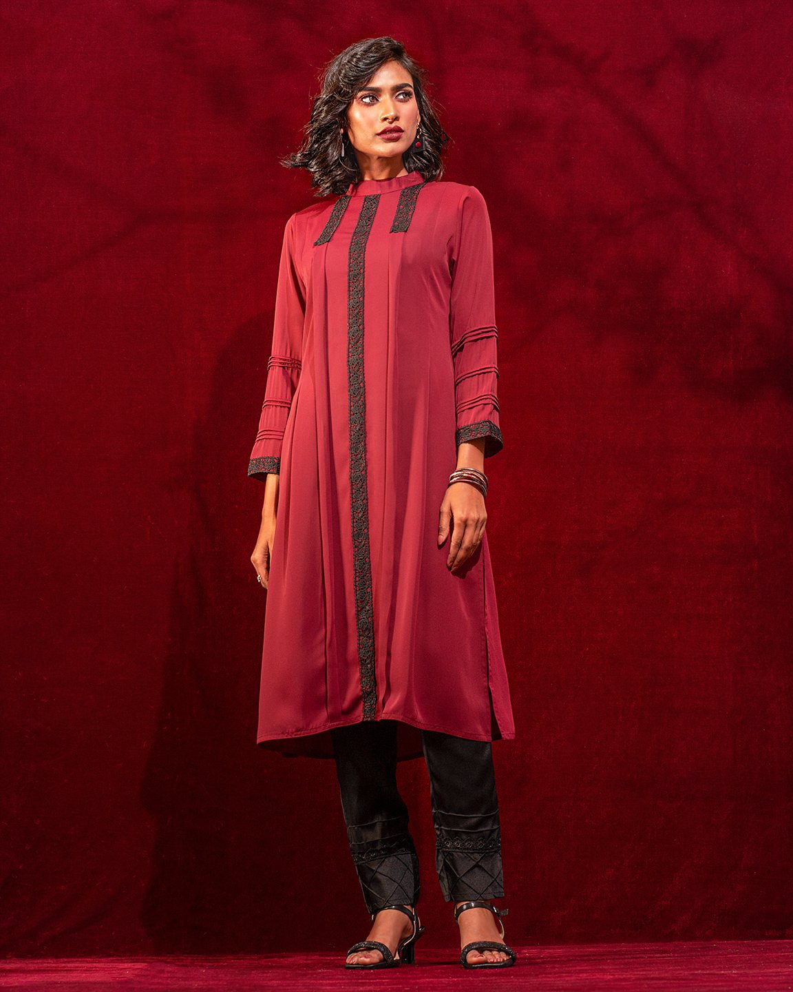 Georgette A-line long kameez has band collar, center front has lace details, princess line has both side box pleat with lace details, both side panel has inverted pleat, has long sleeve with pin tuck & lace details, back part has inverted pleat with lace details & hidden zipper.