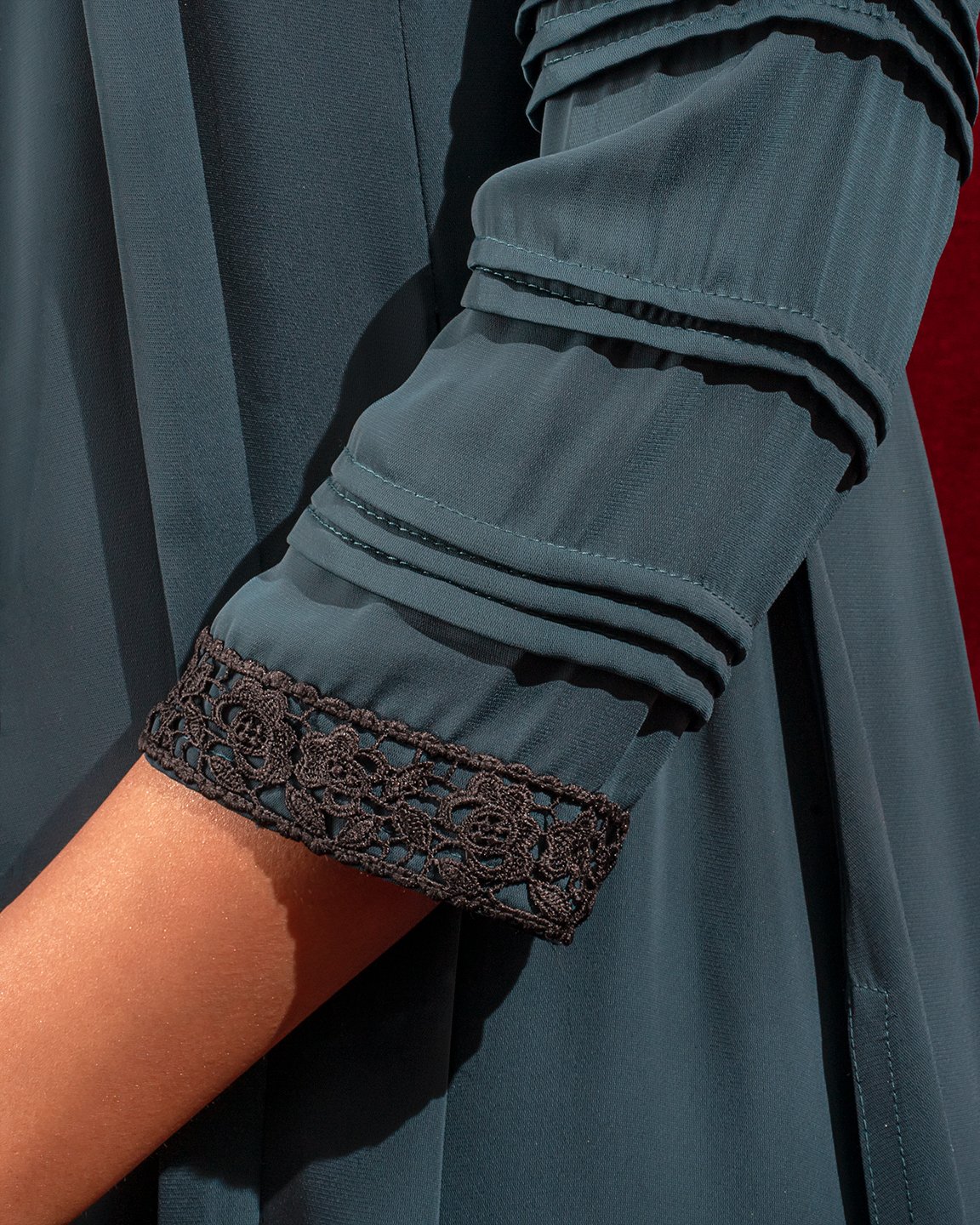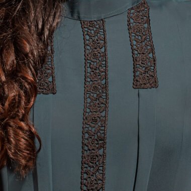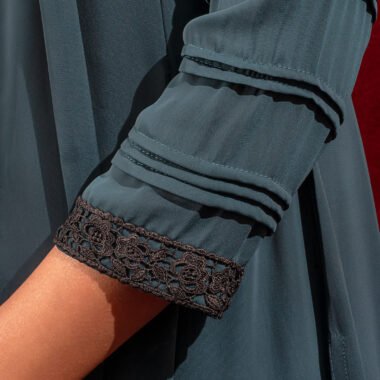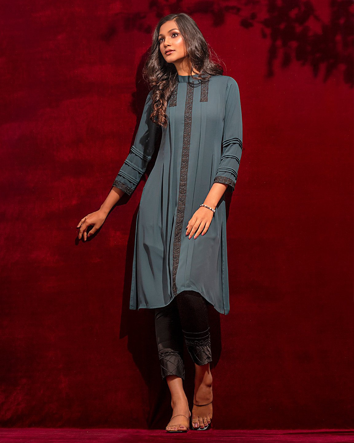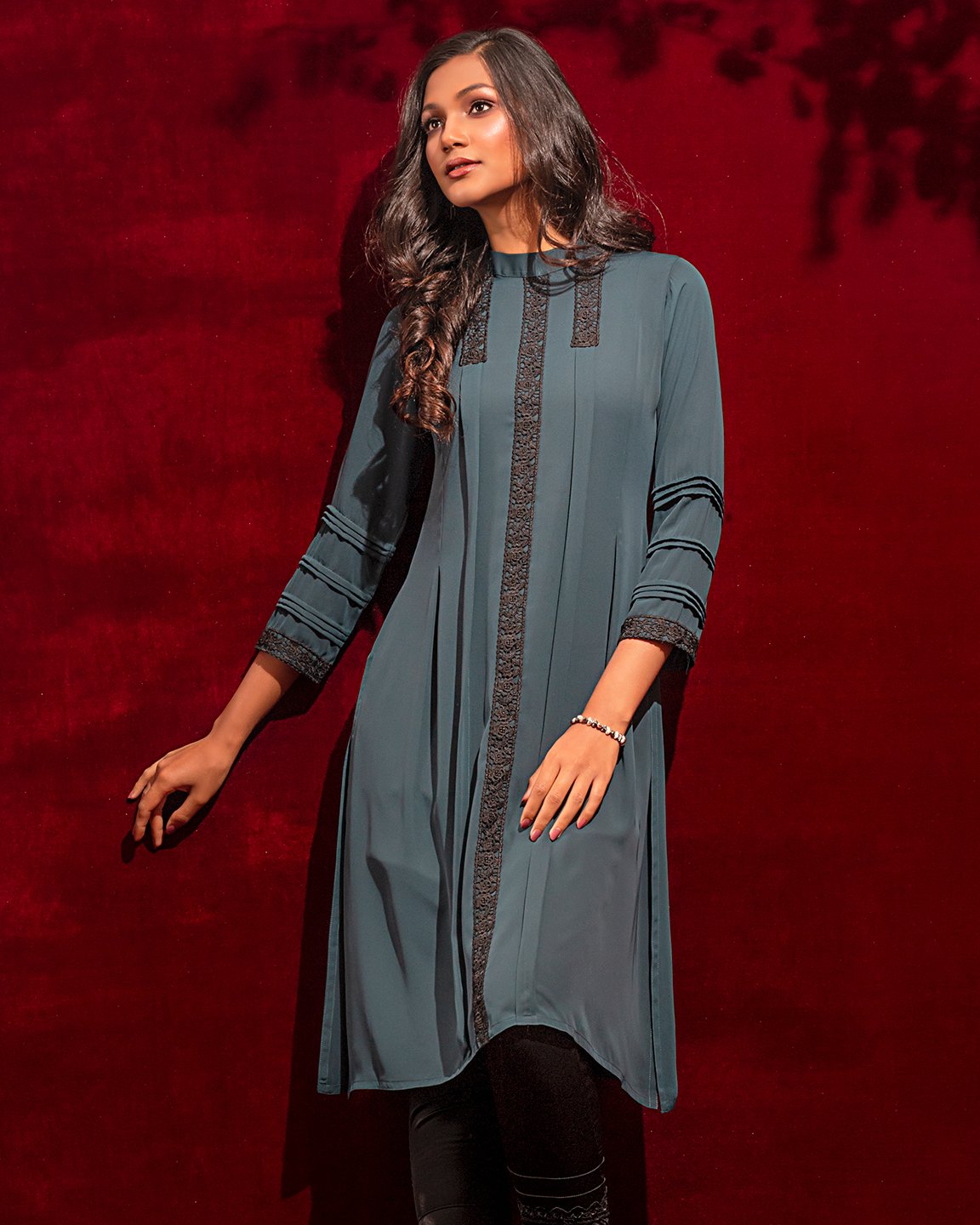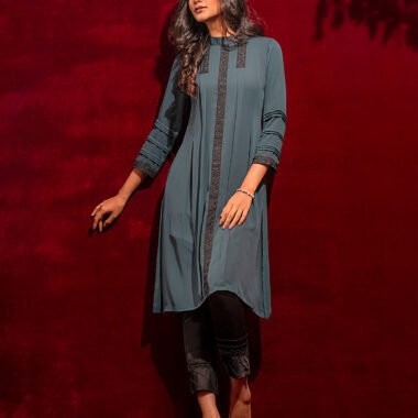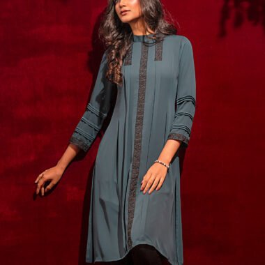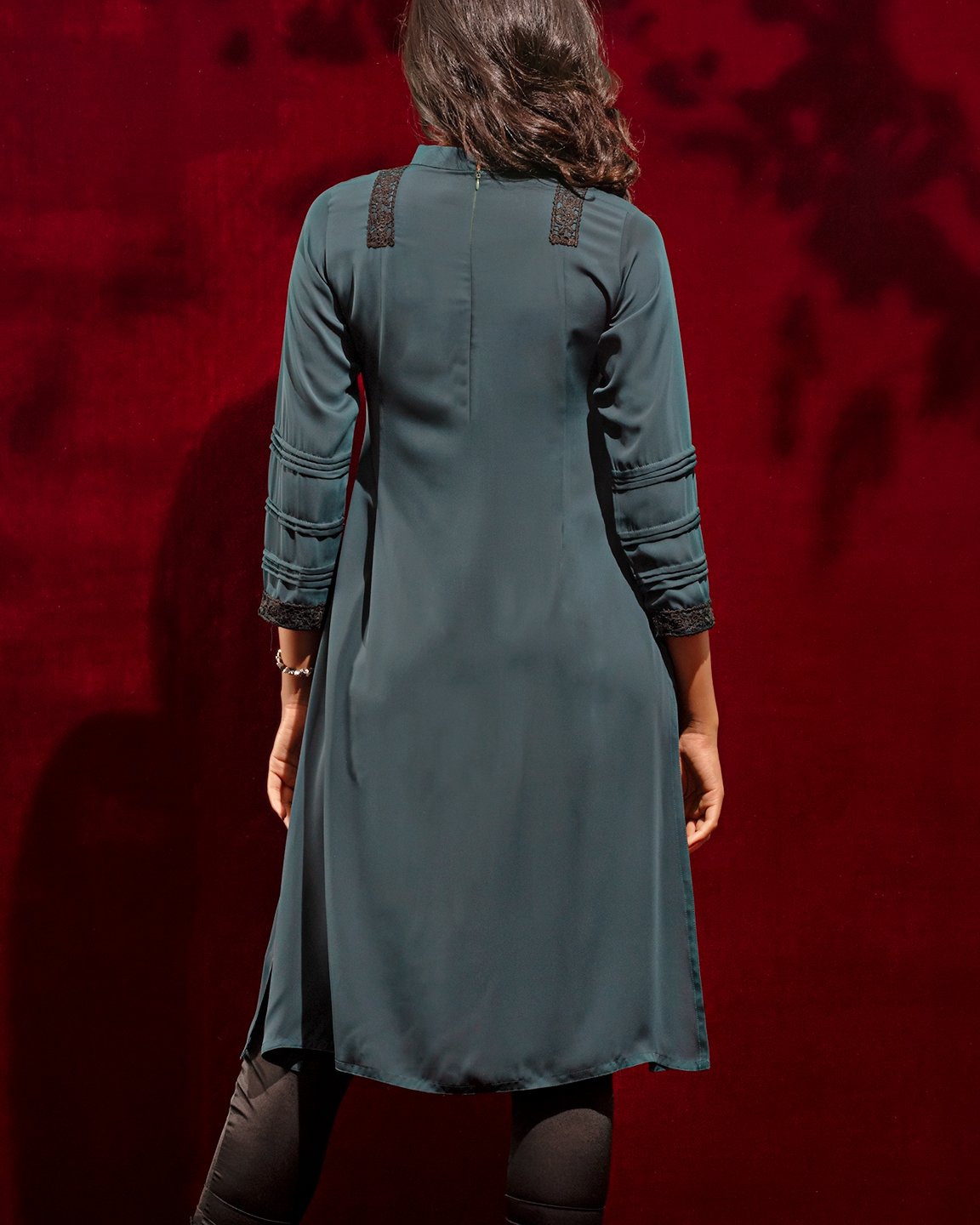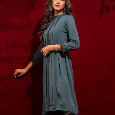 Georgette A-line long kameez has band collar, center front has lace details, princess line has both side box pleat with lace details, both side panel has inverted pleat, has long sleeve with pin tuck & lace details, back part has inverted pleat with lace details & hidden zipper.